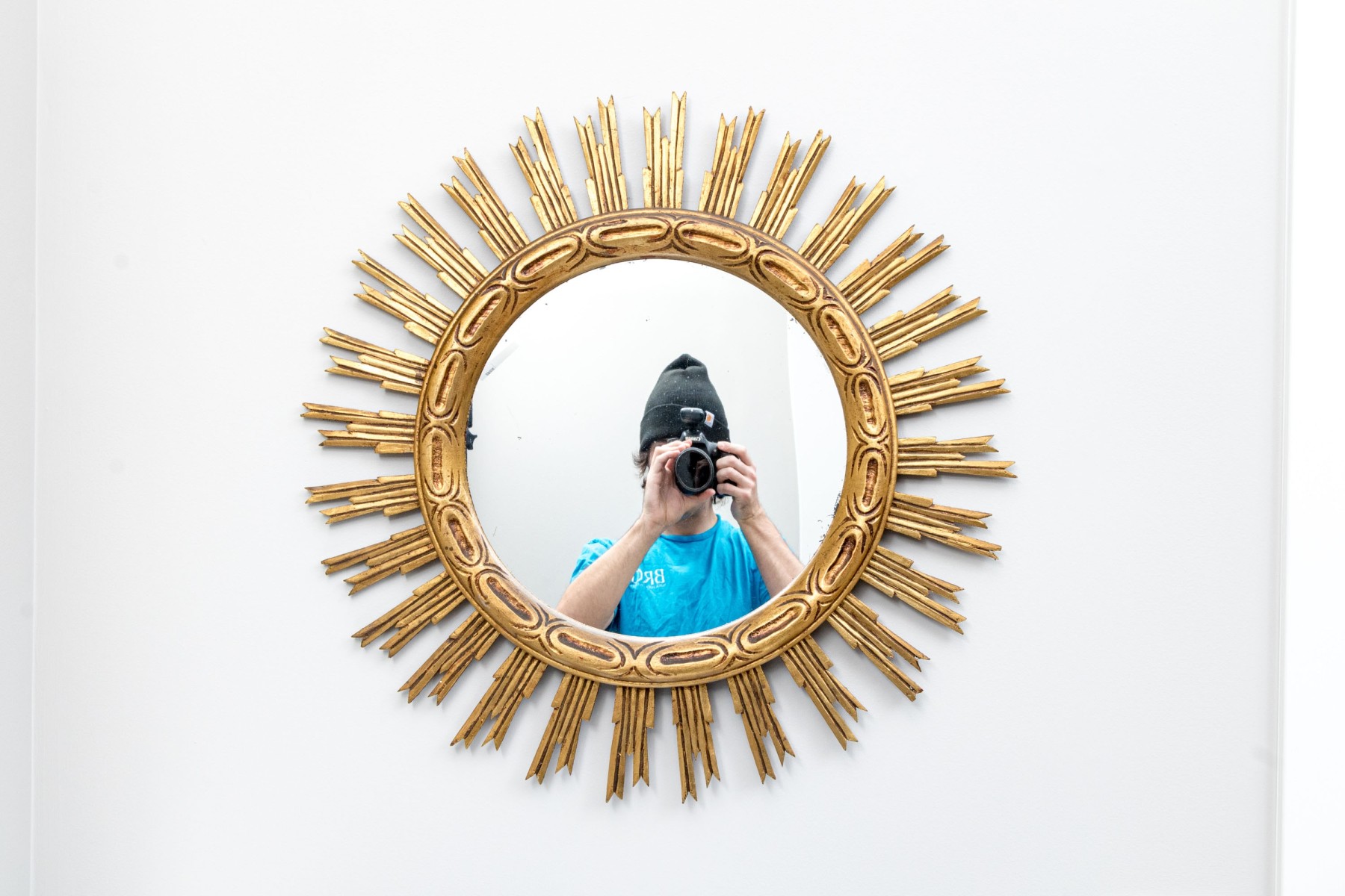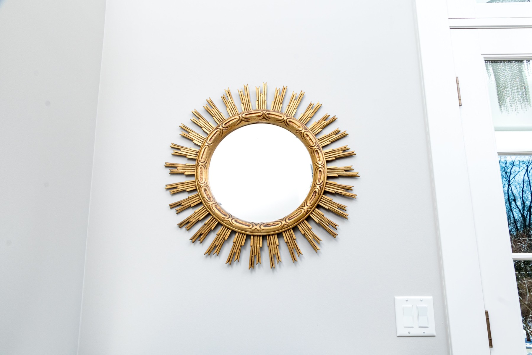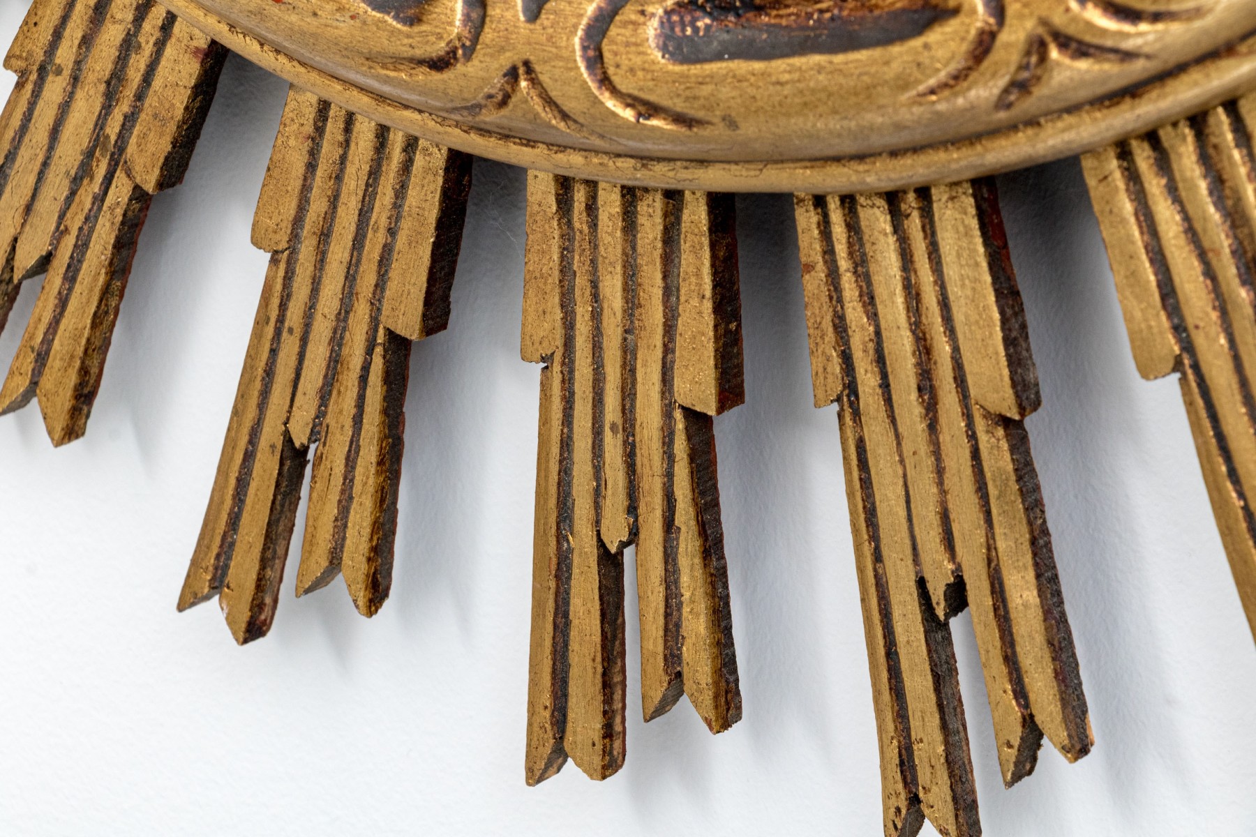 An eye-catching Italianate mirror with a wonderful sun design, showcasing a circular center with a raised rim carved with oval and line motifs surrounded by sculptural rays in a rich gilt finish.