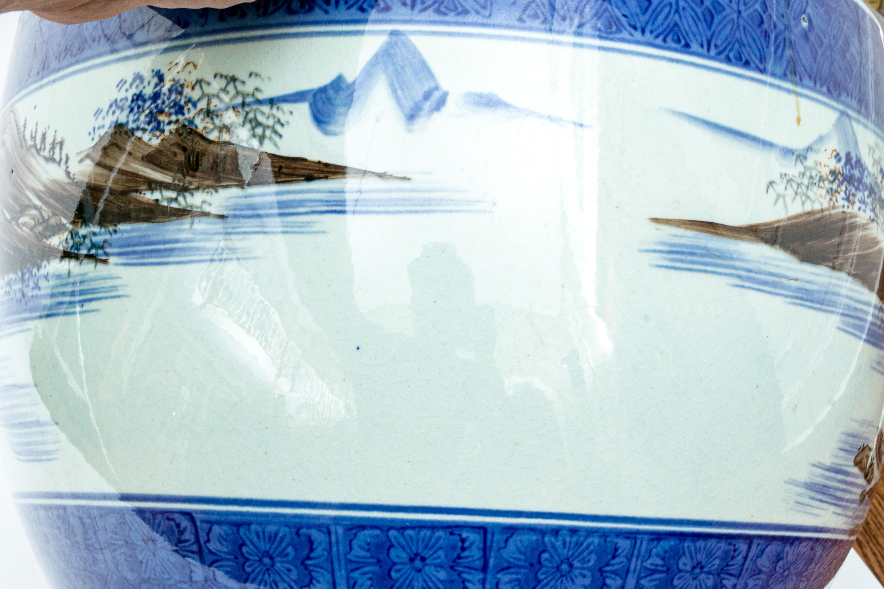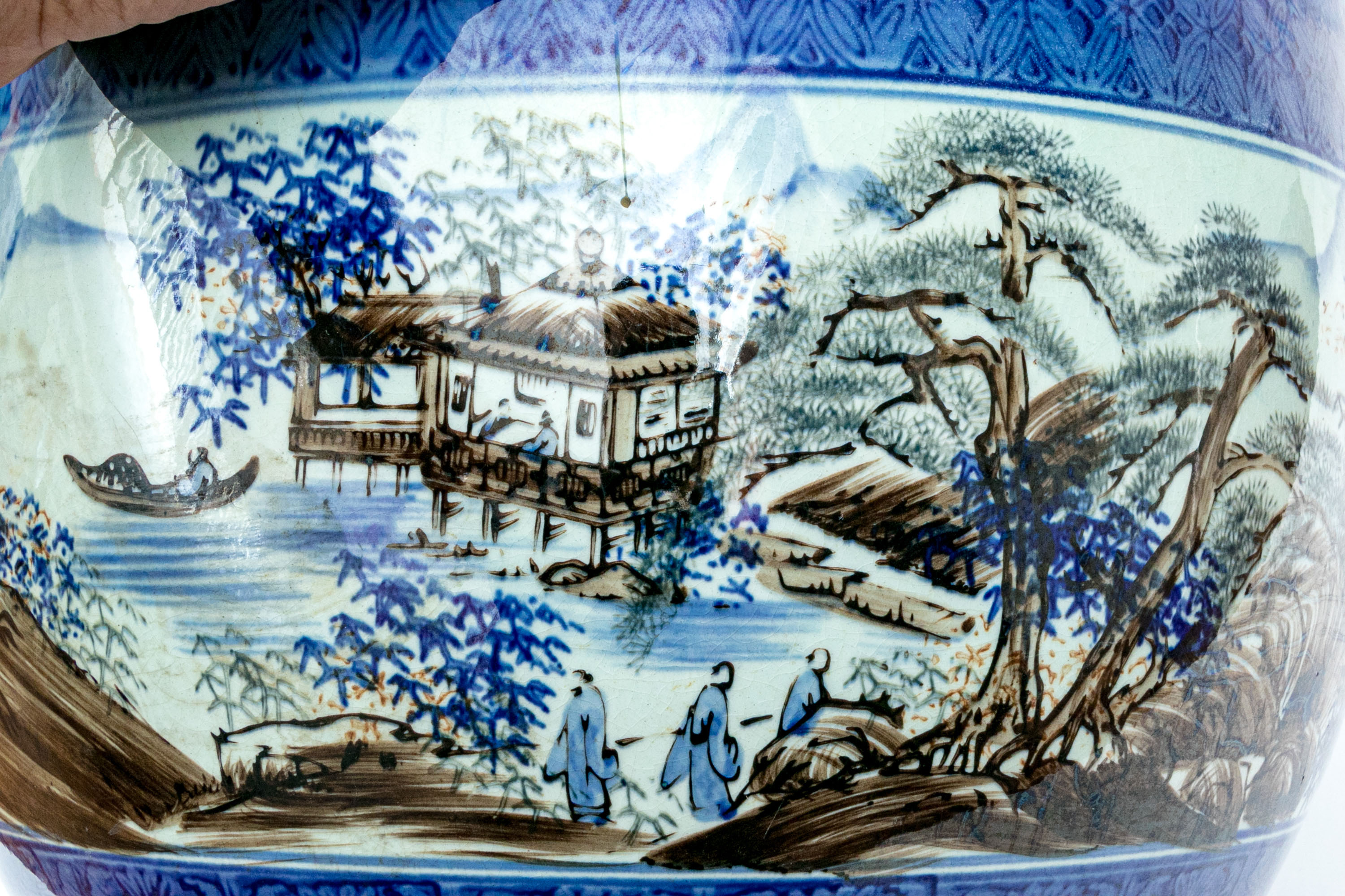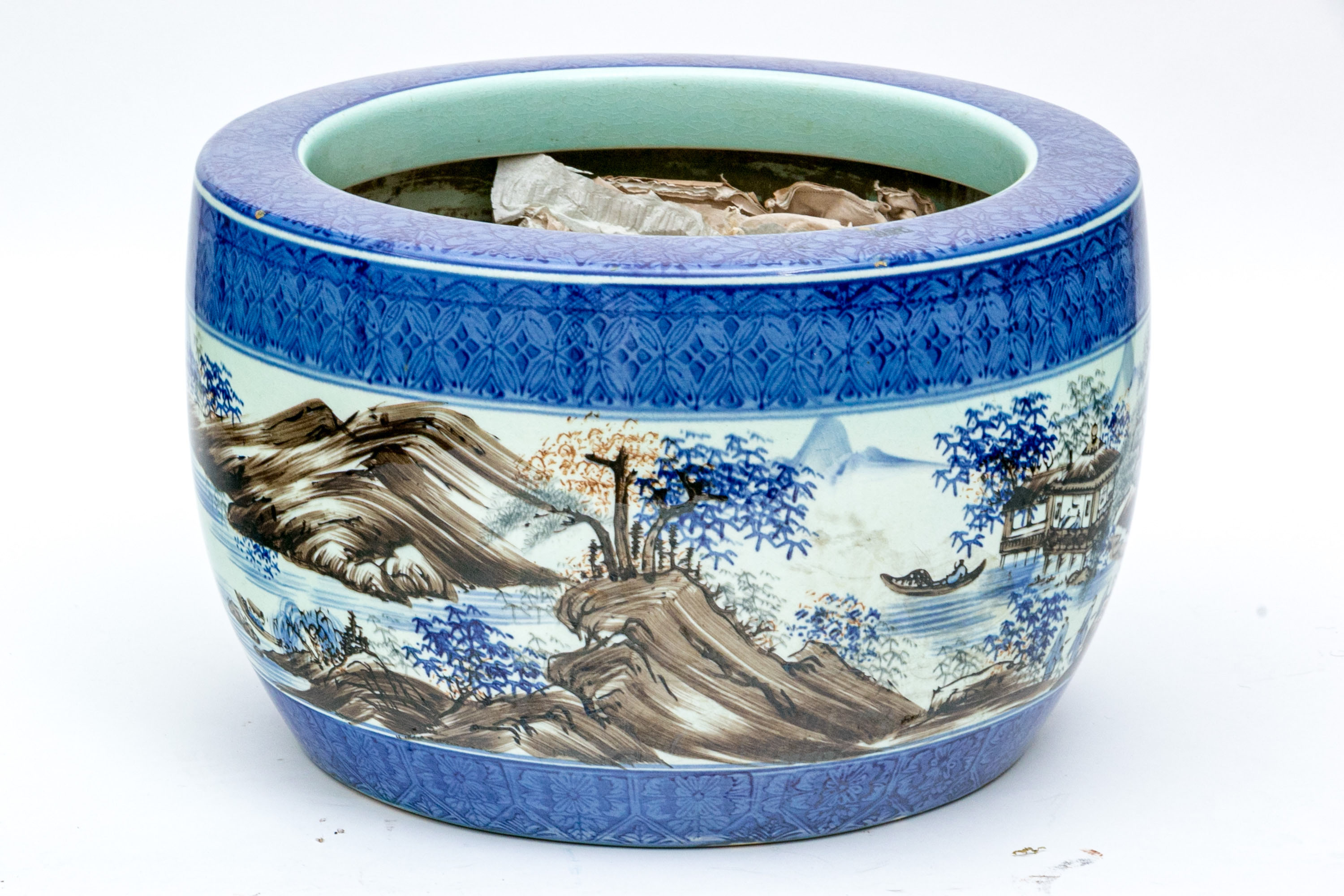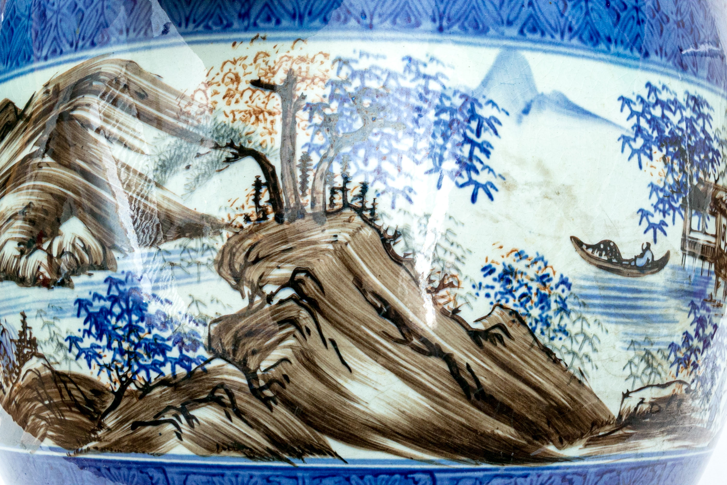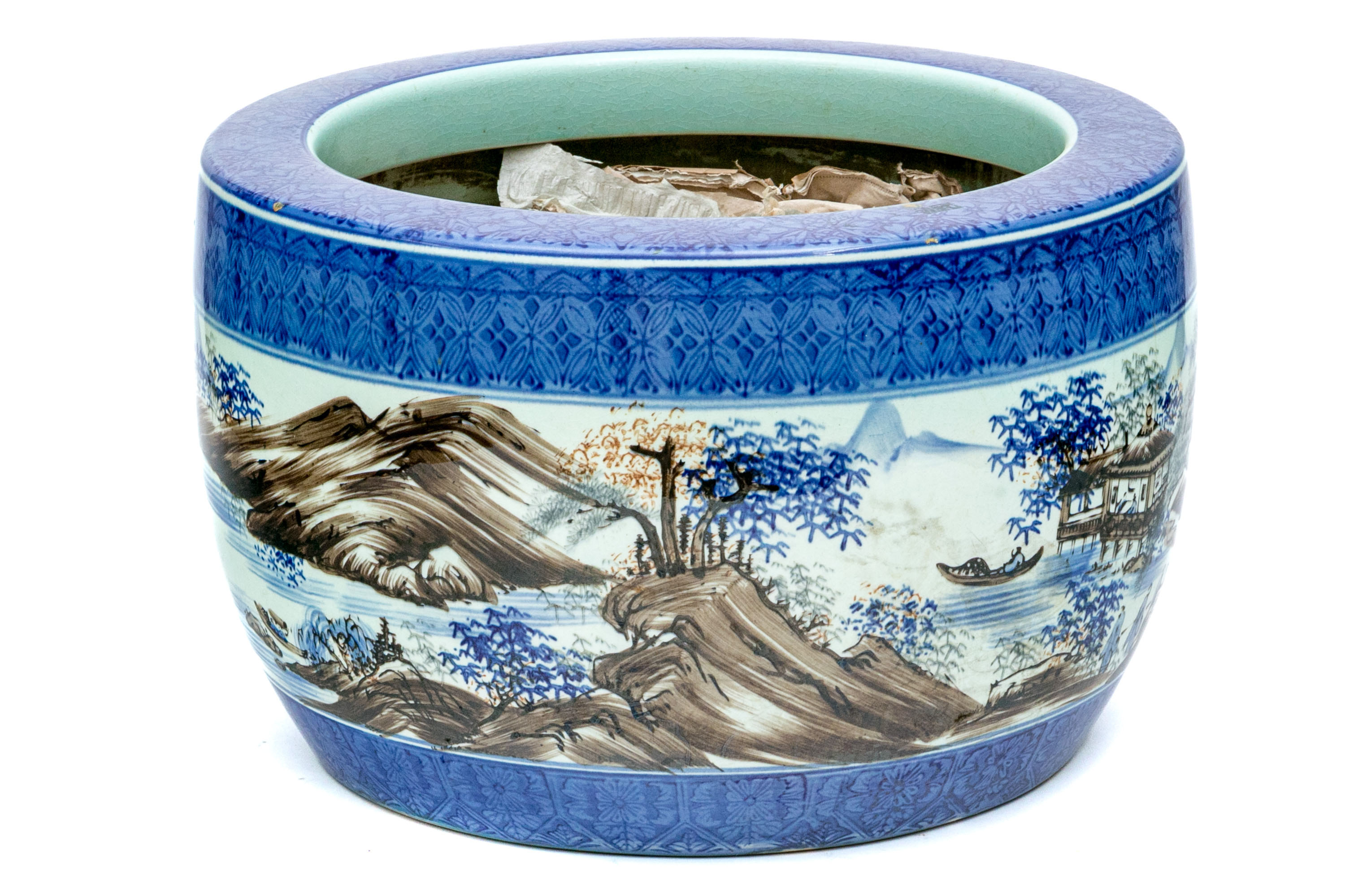 The well potted porcelain jardiniere with both underglaze and overglaze decoration decoration depicting figural landscapes with mountains and a river around the entire central section.