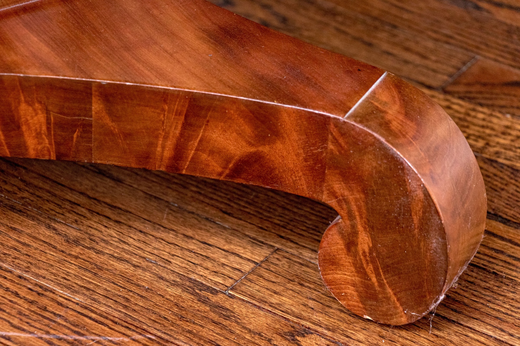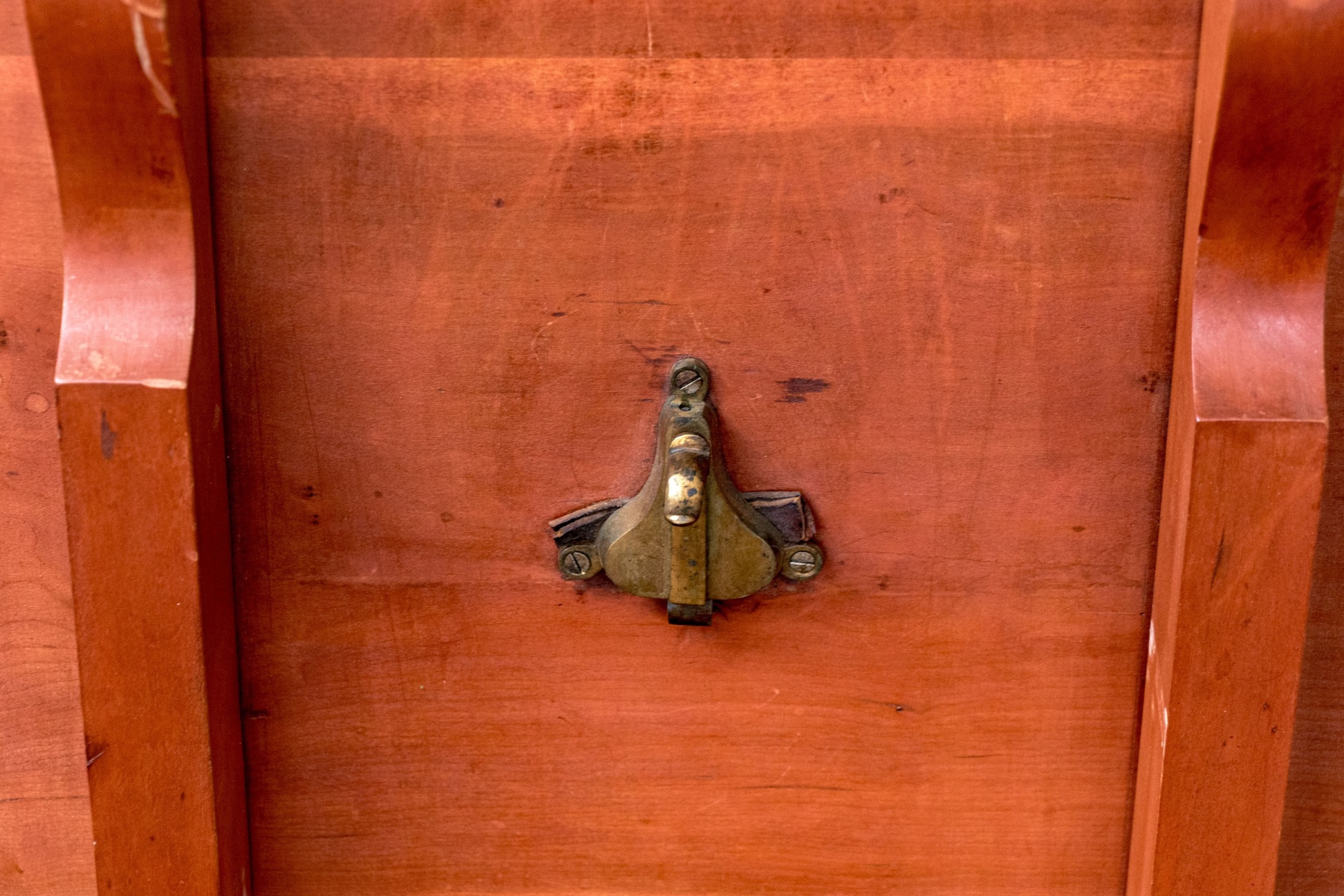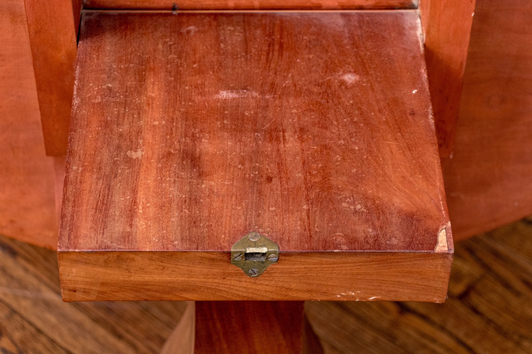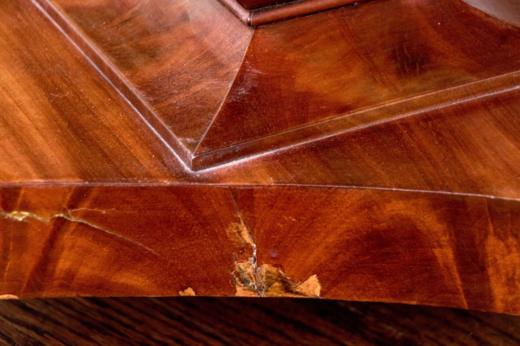 A chip and loss to veneer on top platform that supports table, seen when flip top table is up. Additional cracks and minor losses to the veneers around the feet but overall the damage is unobtrusive. The hinge could benefit from being oiled as it is squeaky when is lifted and lowered.