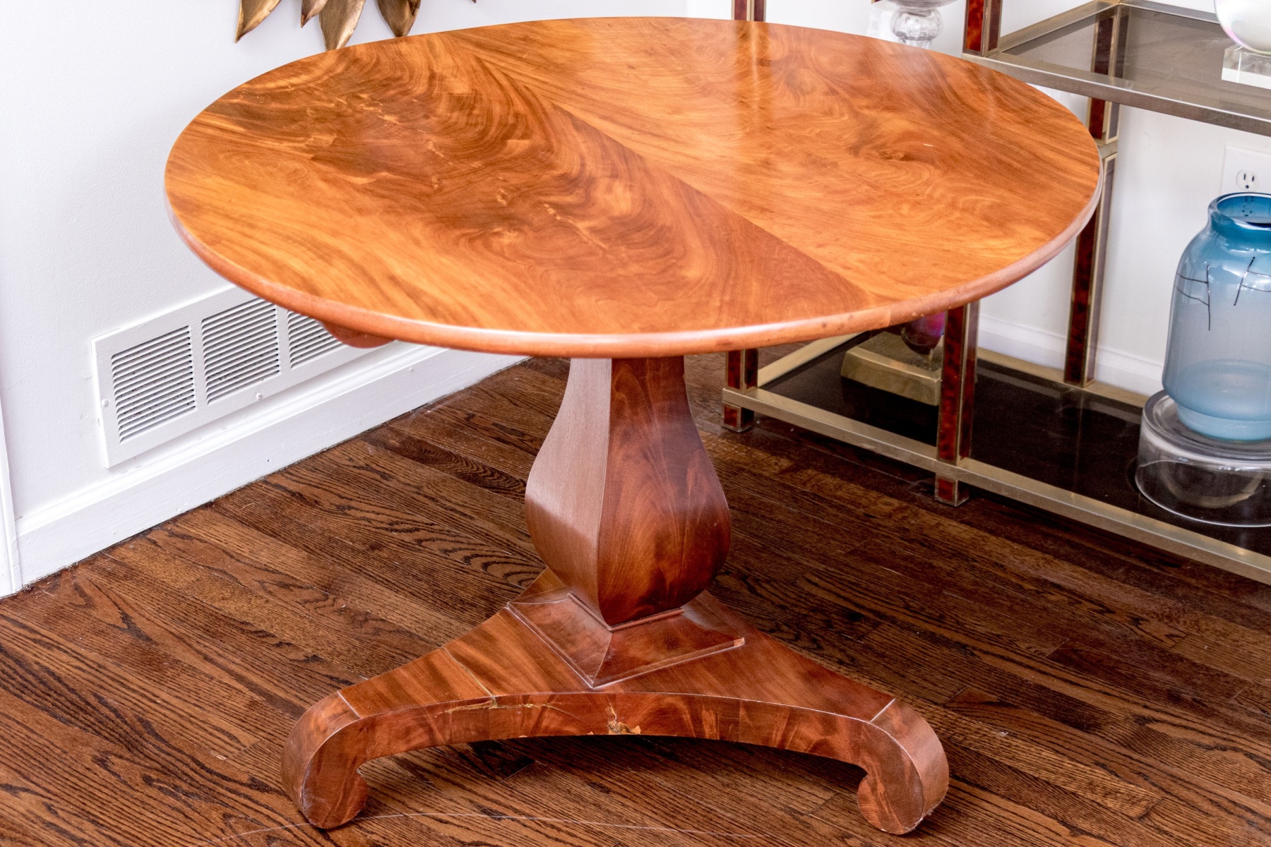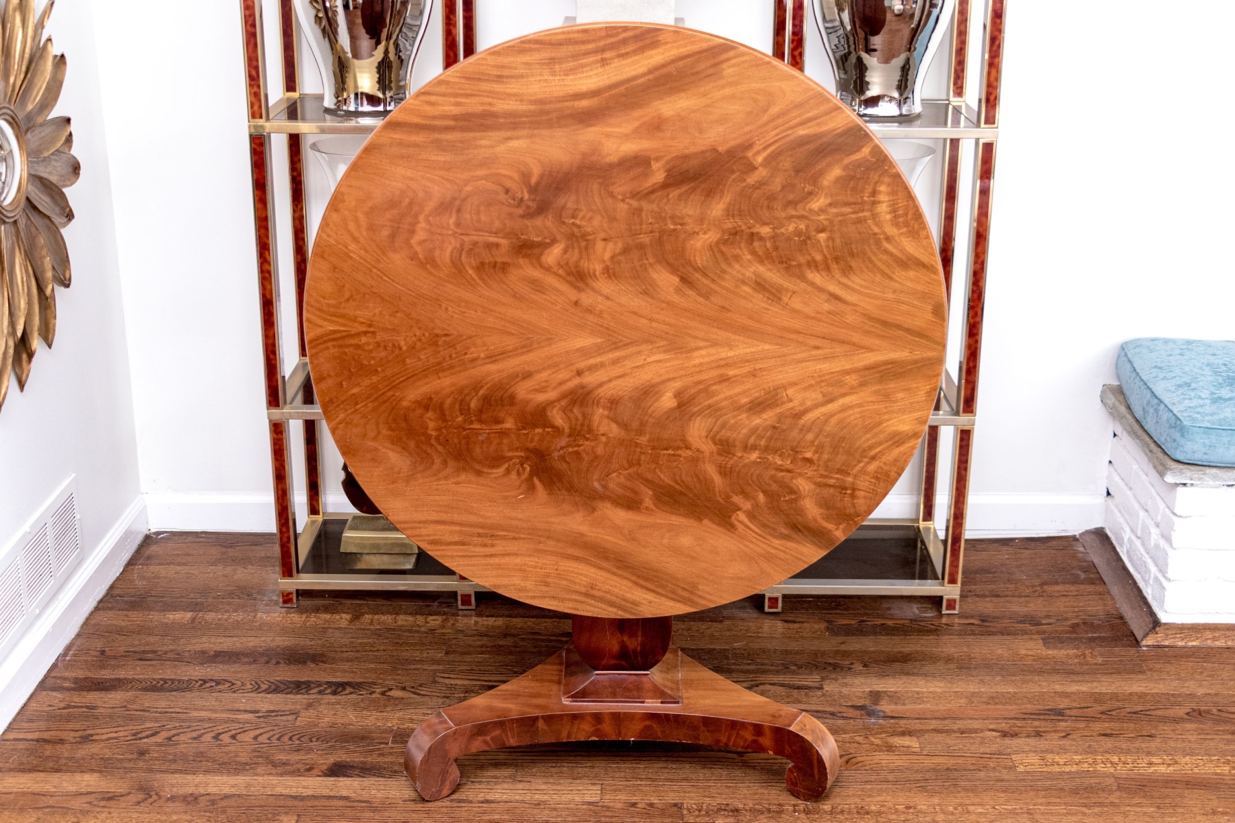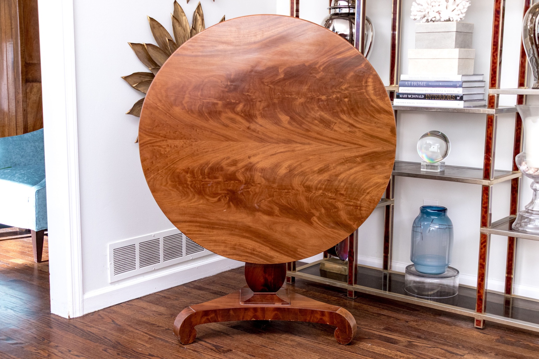 A delightful atrium table showcasing a circular flip top bookmatch veneered in striking honeyed brown and medium brown mahogany with an eye-catching wood grain. Veneers continue down a shapely baluster form pedestal on a squared knop surmounting a trefoil base with inward scrolled feet, making for a classy and timelessly elegant design.