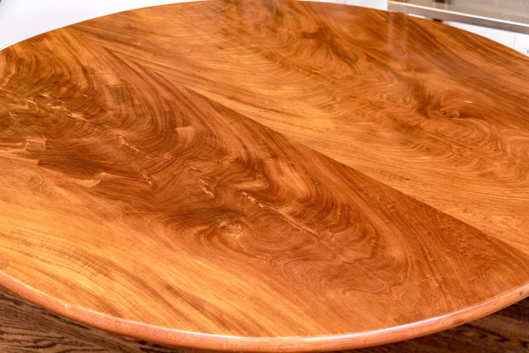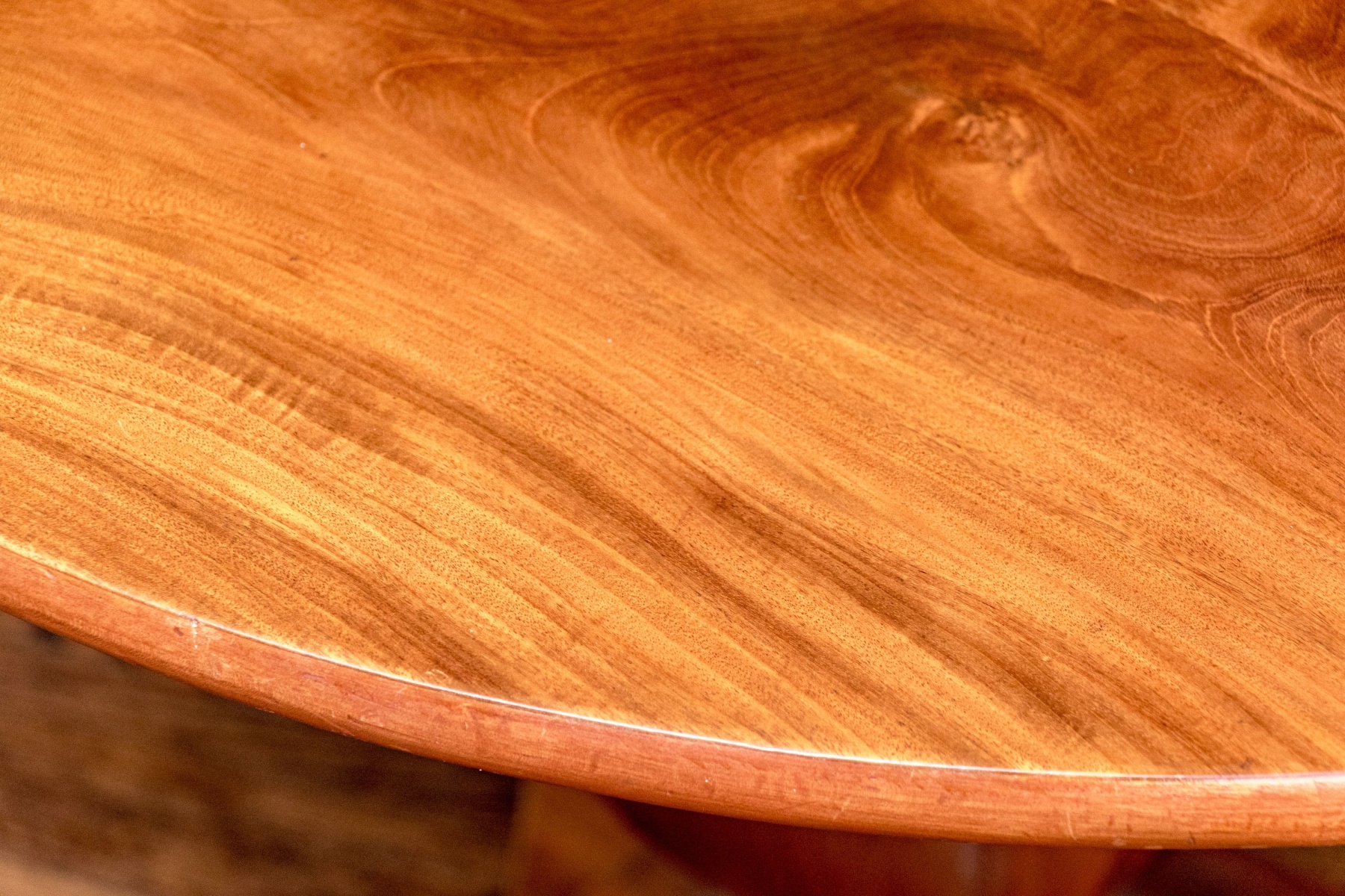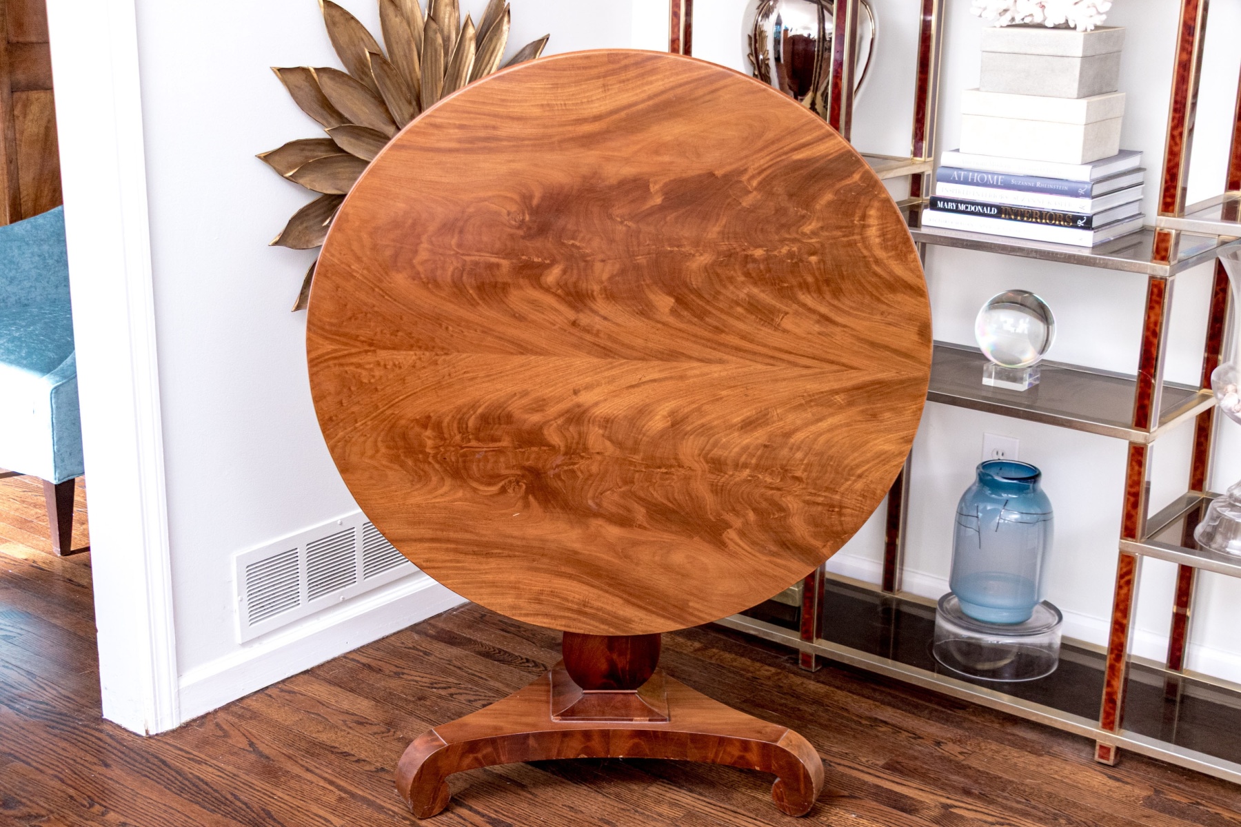 A delightful atrium table showcasing a circular flip top bookmatch veneered in striking honeyed brown and medium brown mahogany with an eye-catching wood grain. Veneers continue down a shapely baluster form pedestal on a squared knop surmounting a trefoil base with inward scrolled feet, making for a classy and timelessly elegant design.