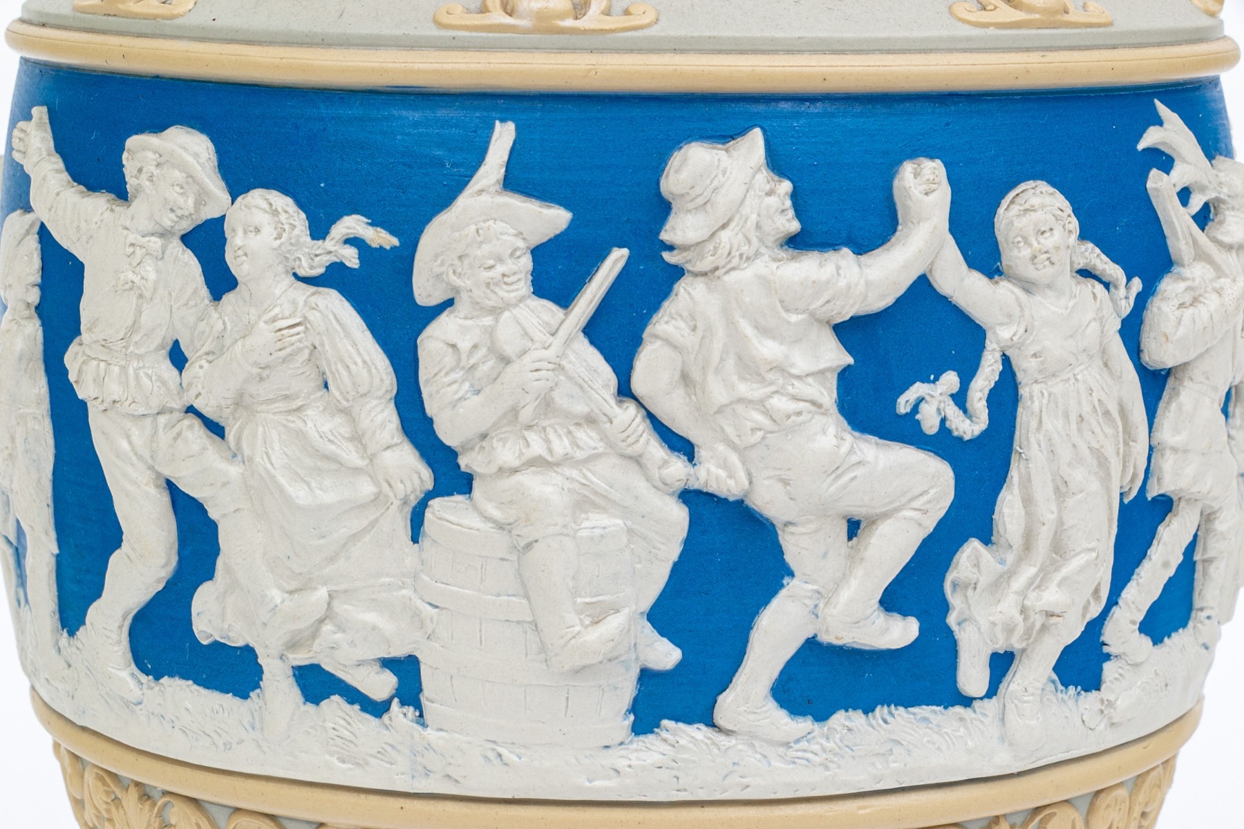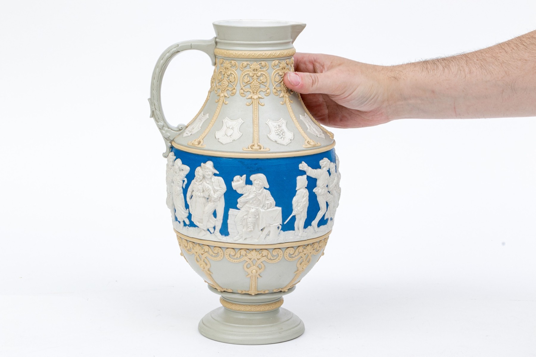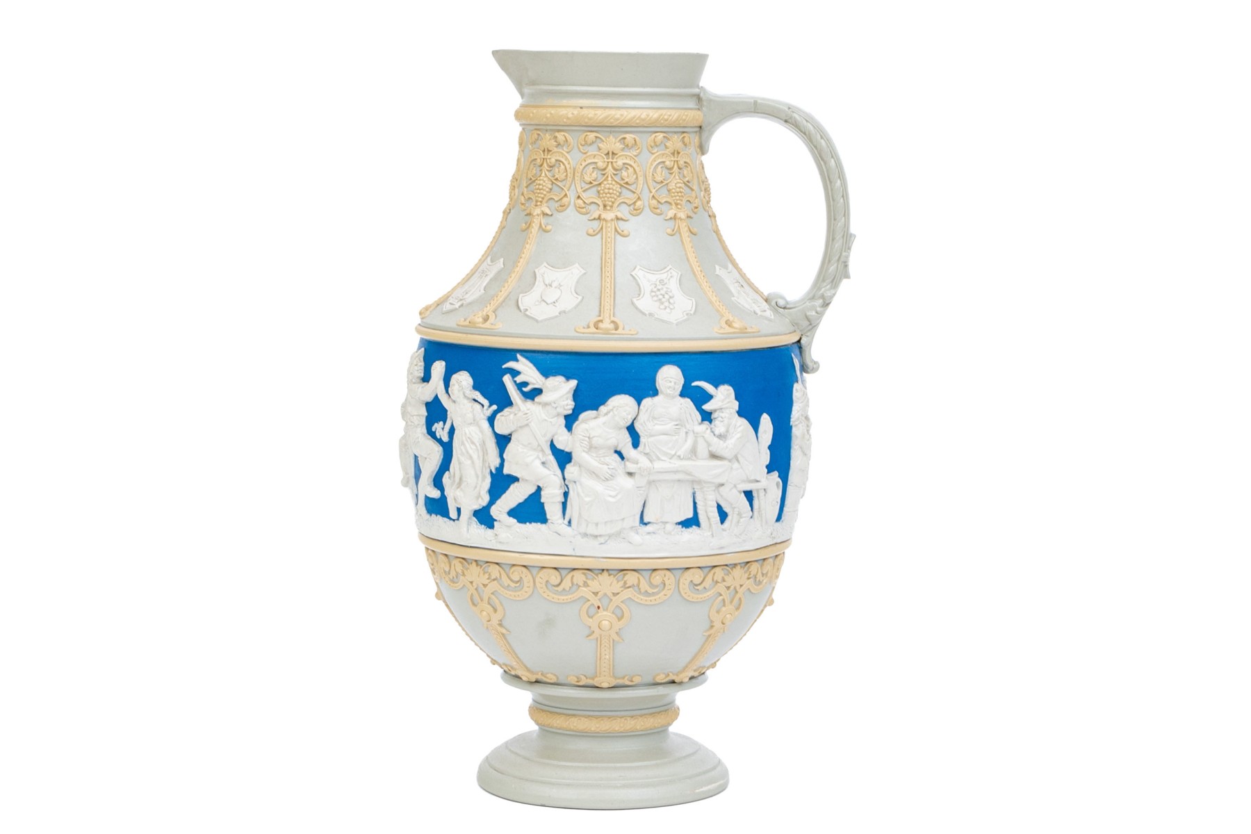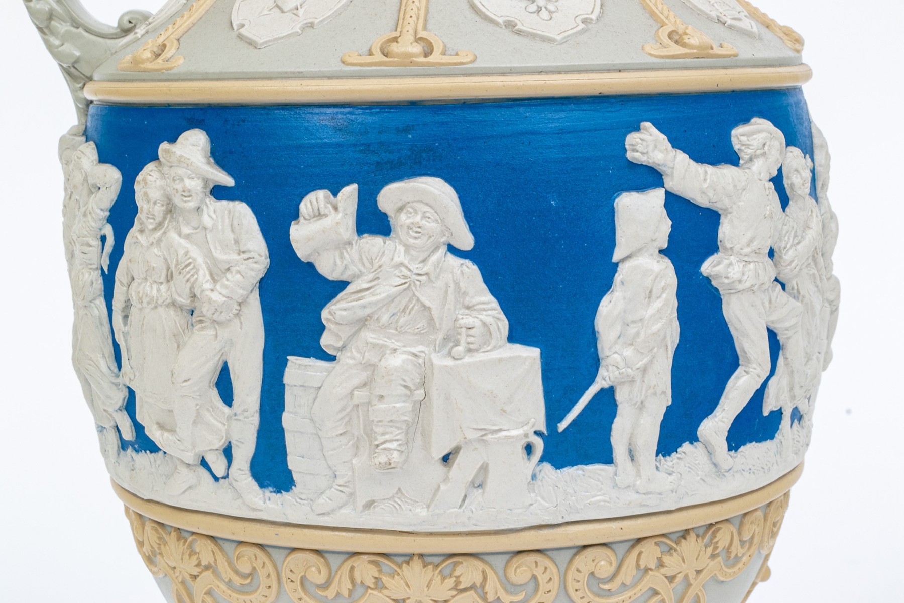 Stunning Mettlach relief decorated ceramic ewer. Standing on a circular foot with handle and spout.