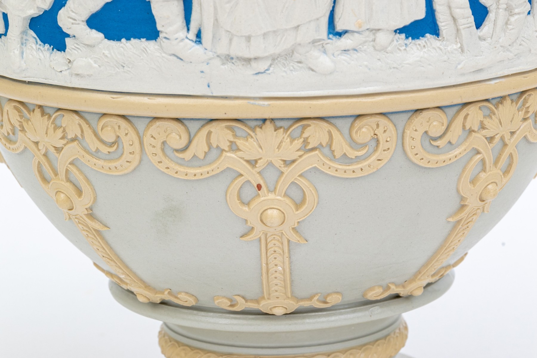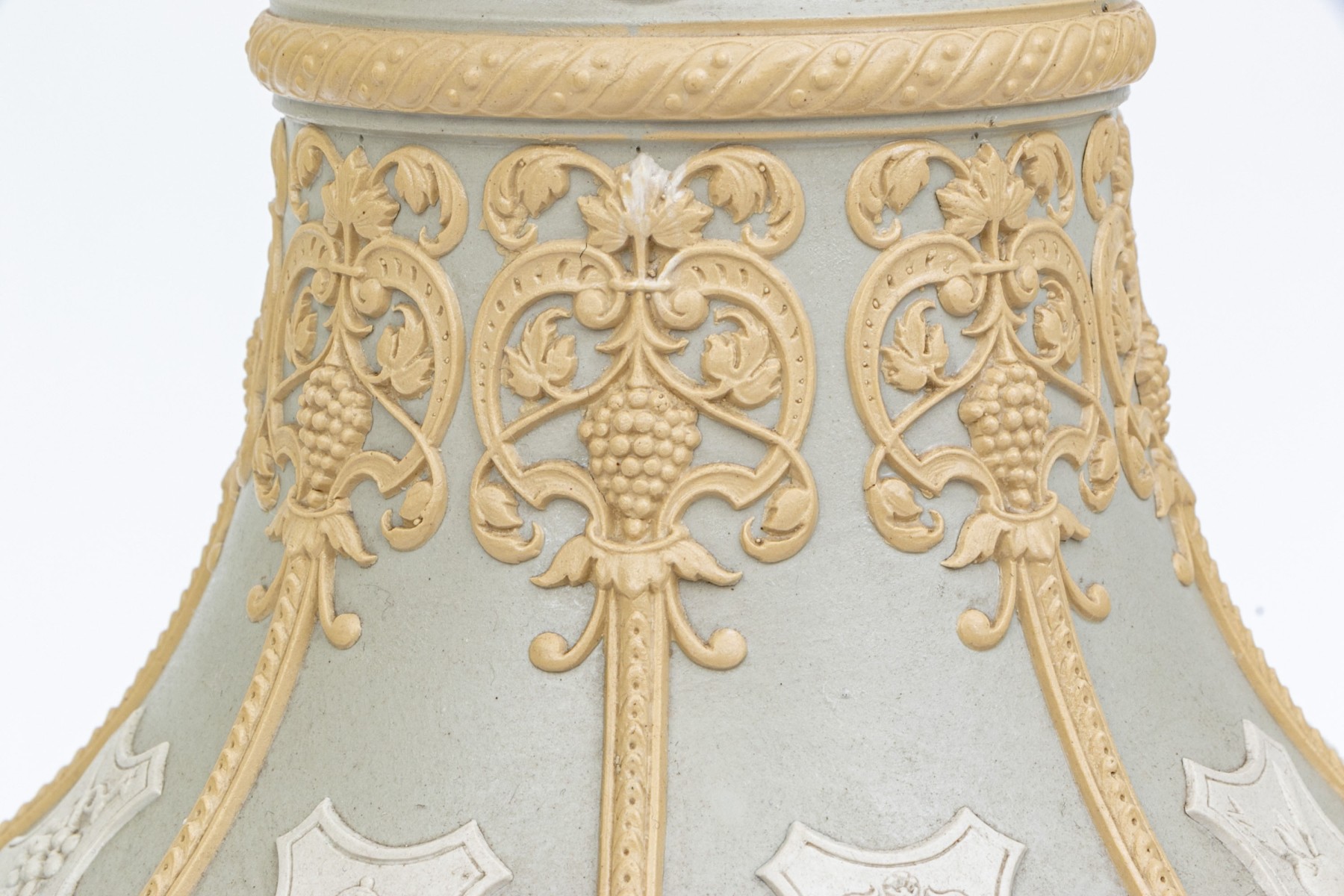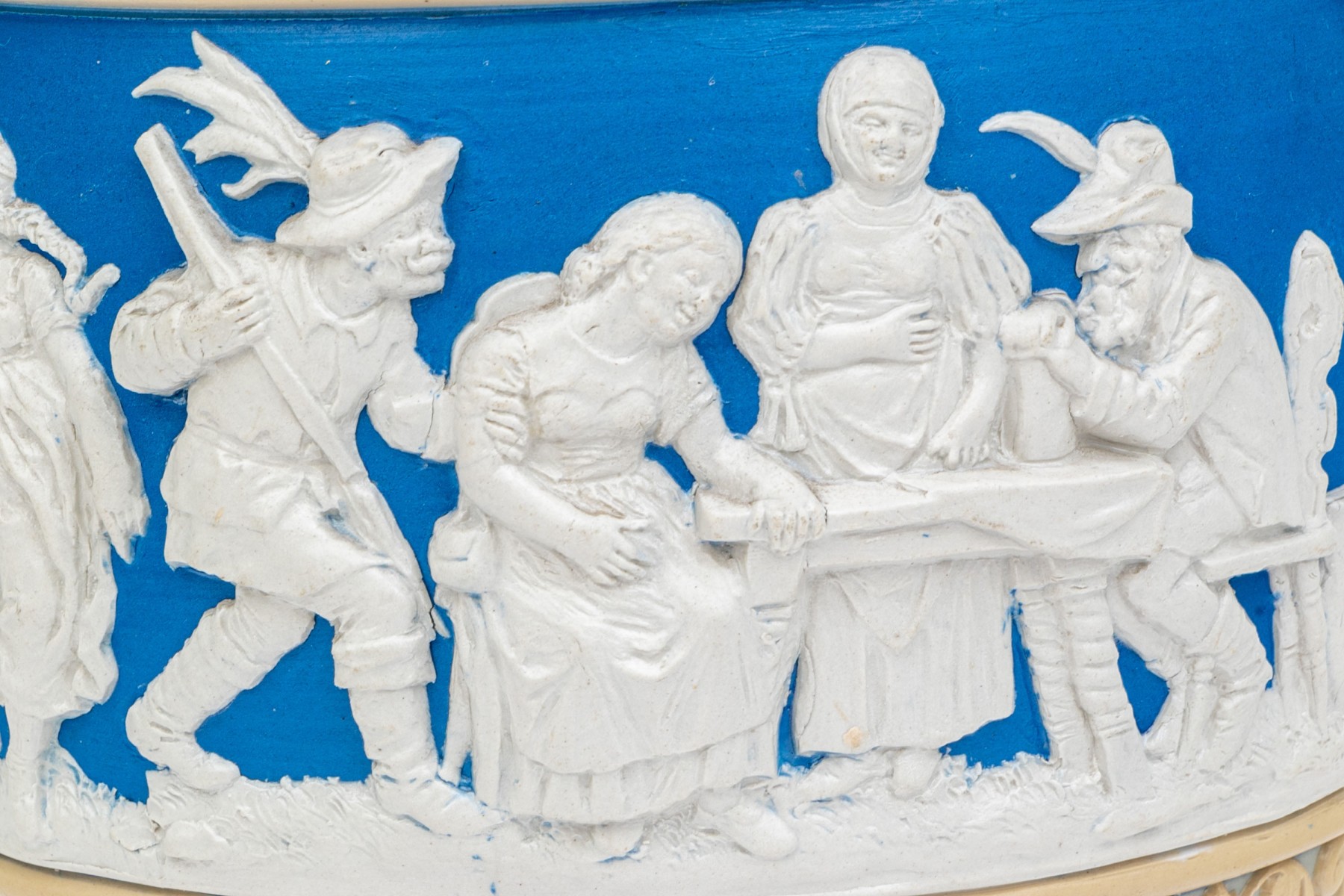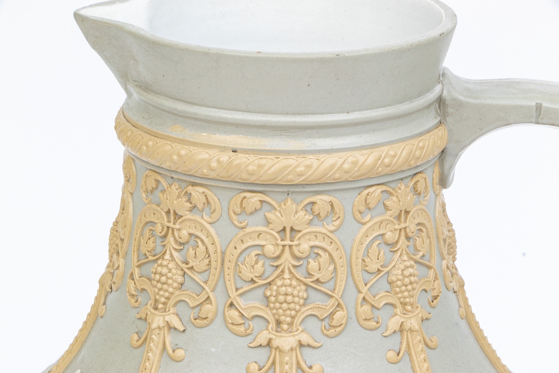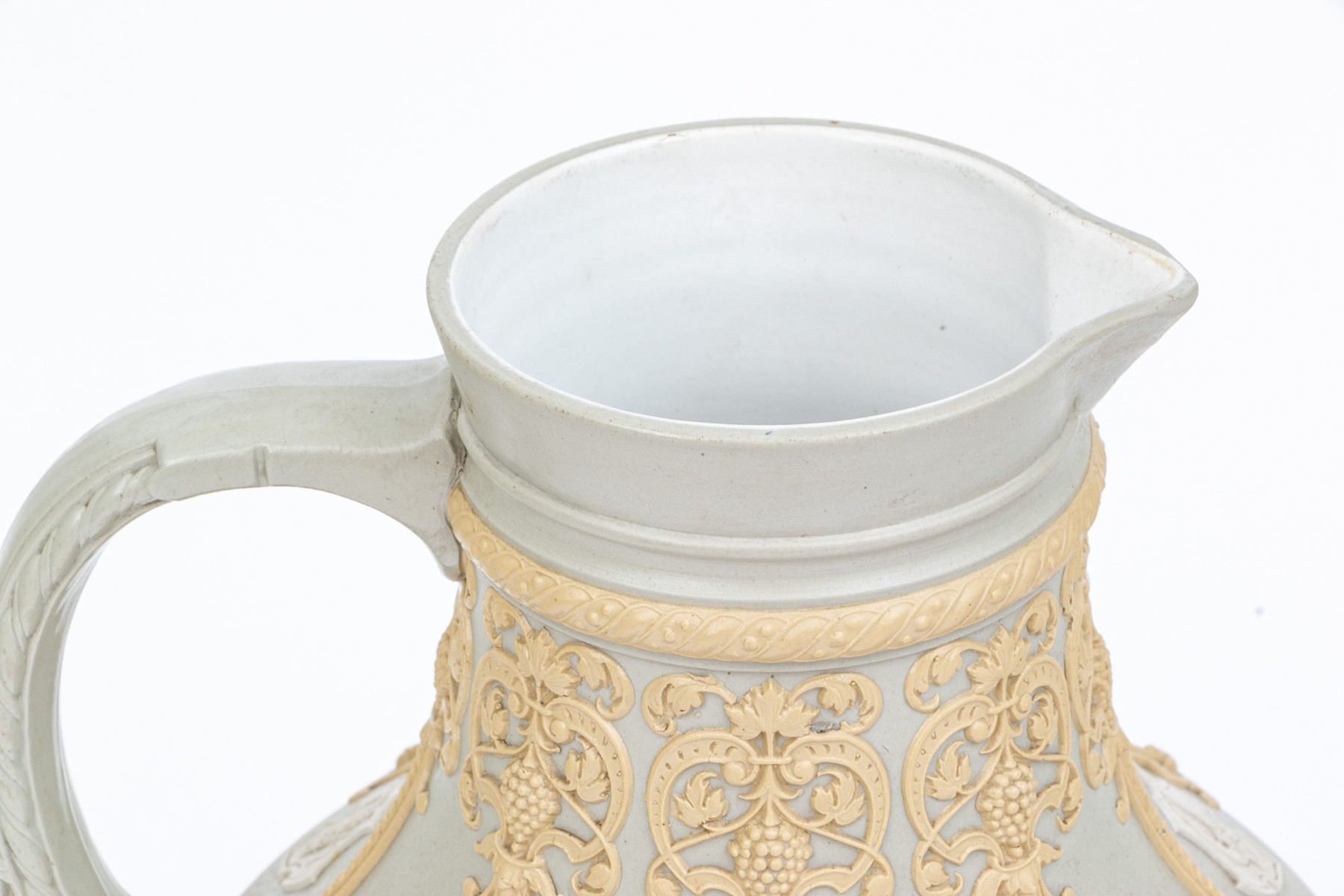 Stunning Mettlach relief decorated ceramic ewer. Standing on a circular foot with handle and spout.