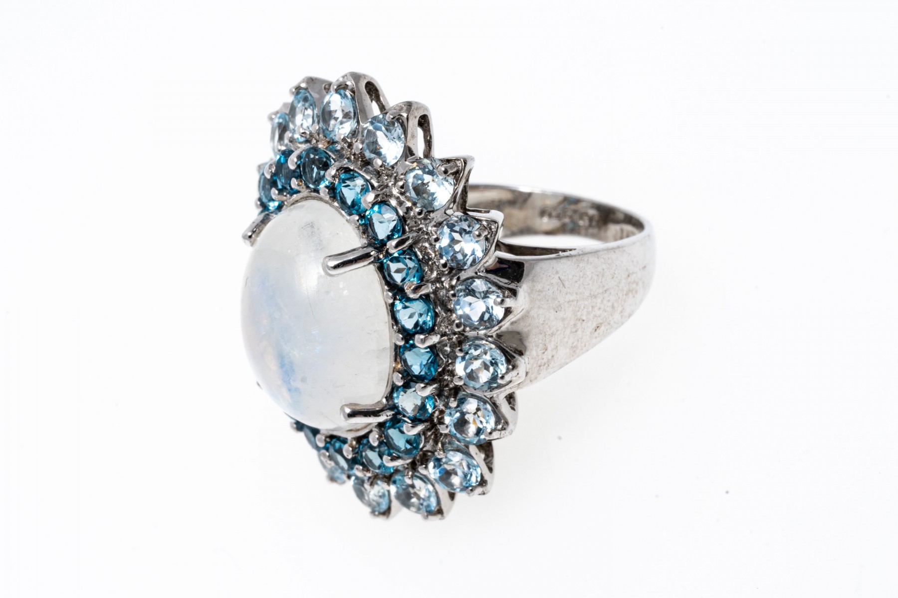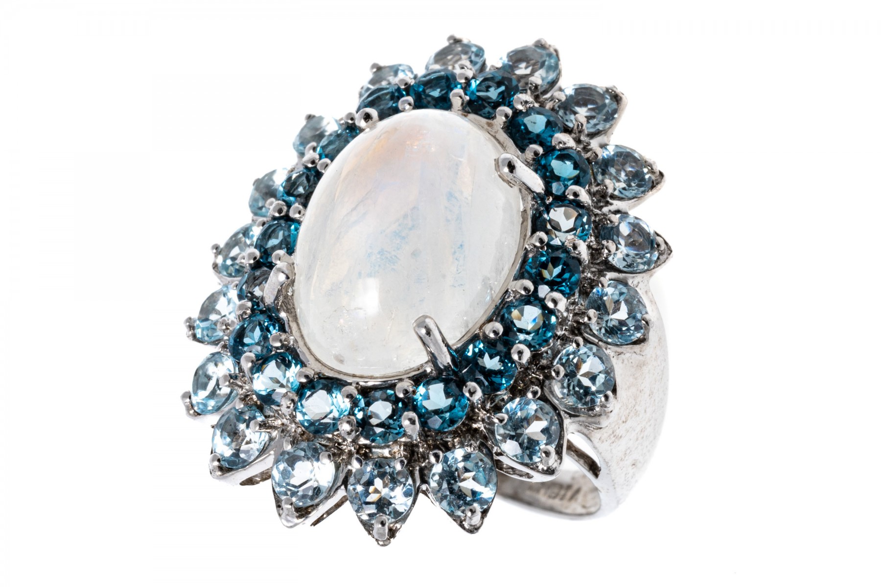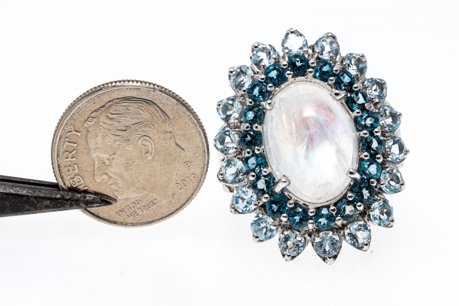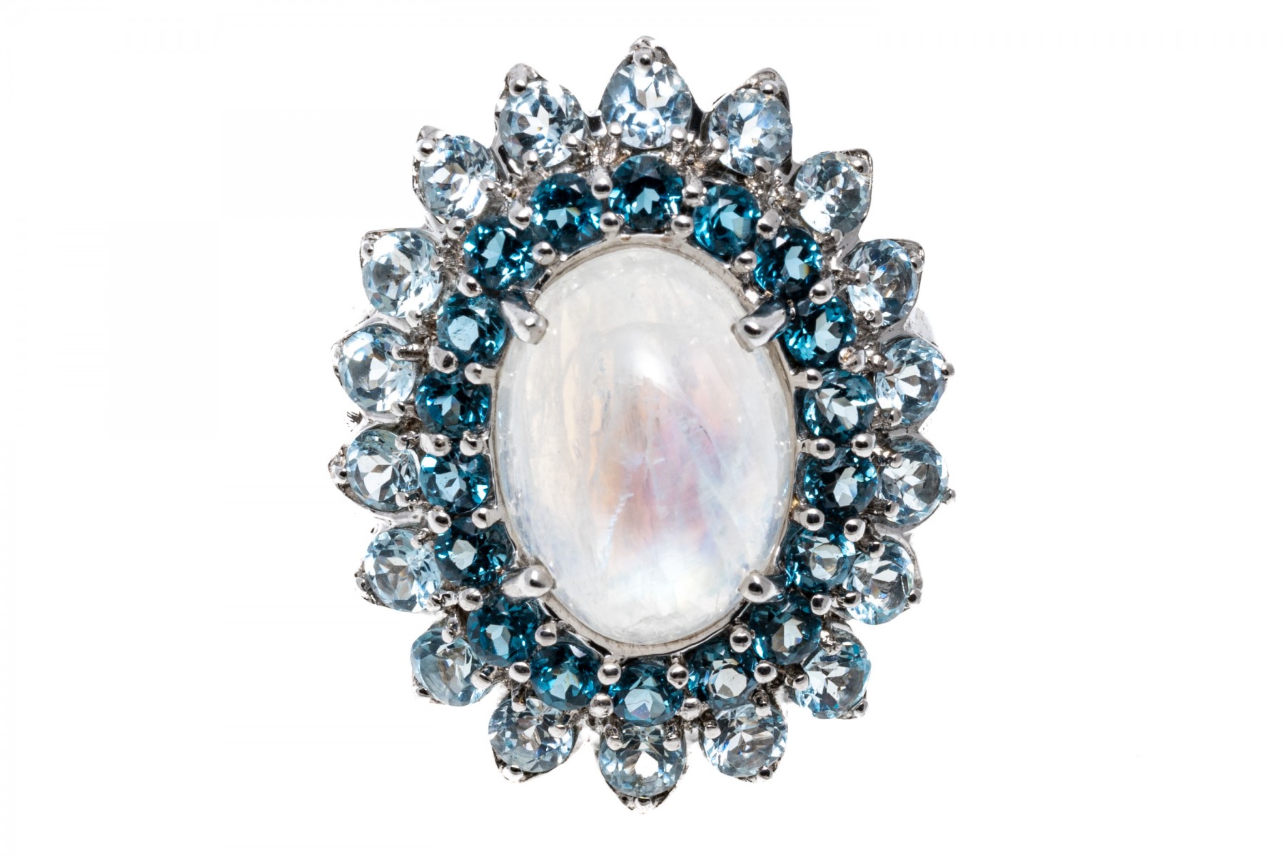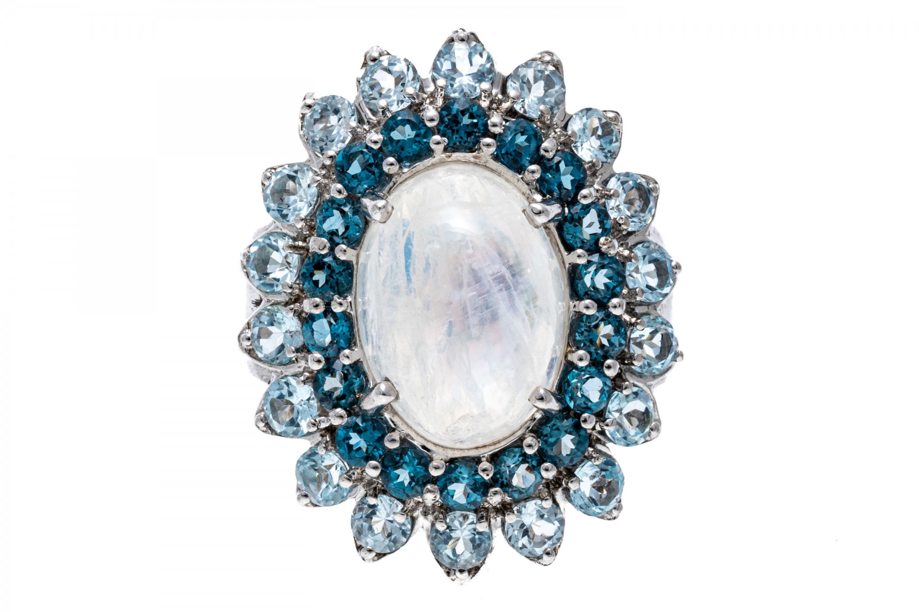 Prong set at the center of this ring is a stunning iridescent moonstone. Surrounding the moonstone are two halos, the outer of light blue topaz and the inner of darker blue topaz. Ring size 7.
