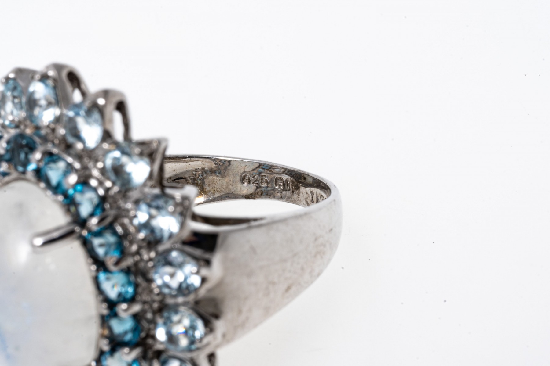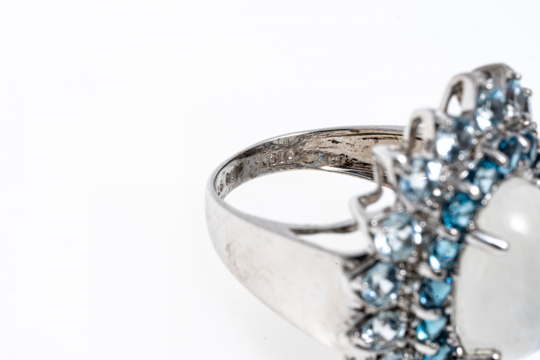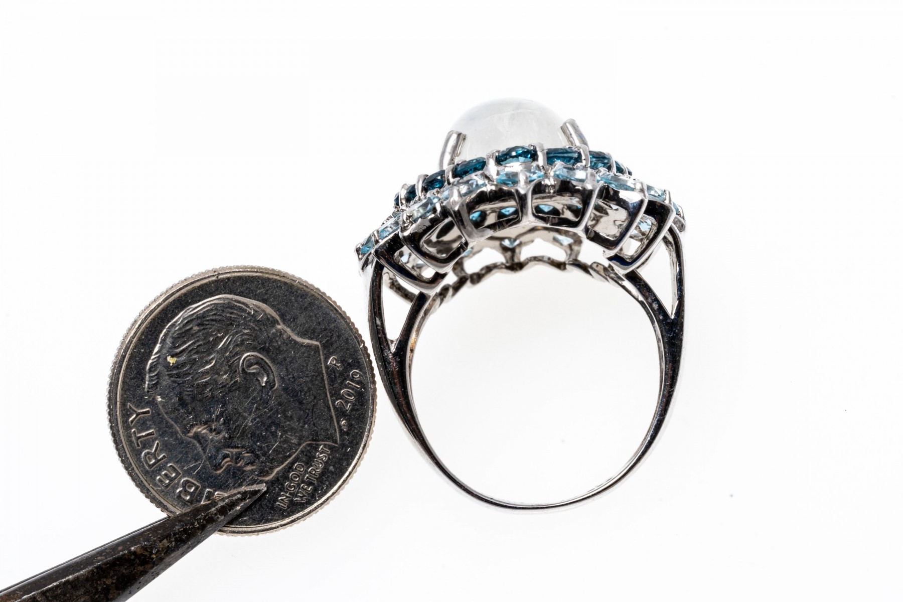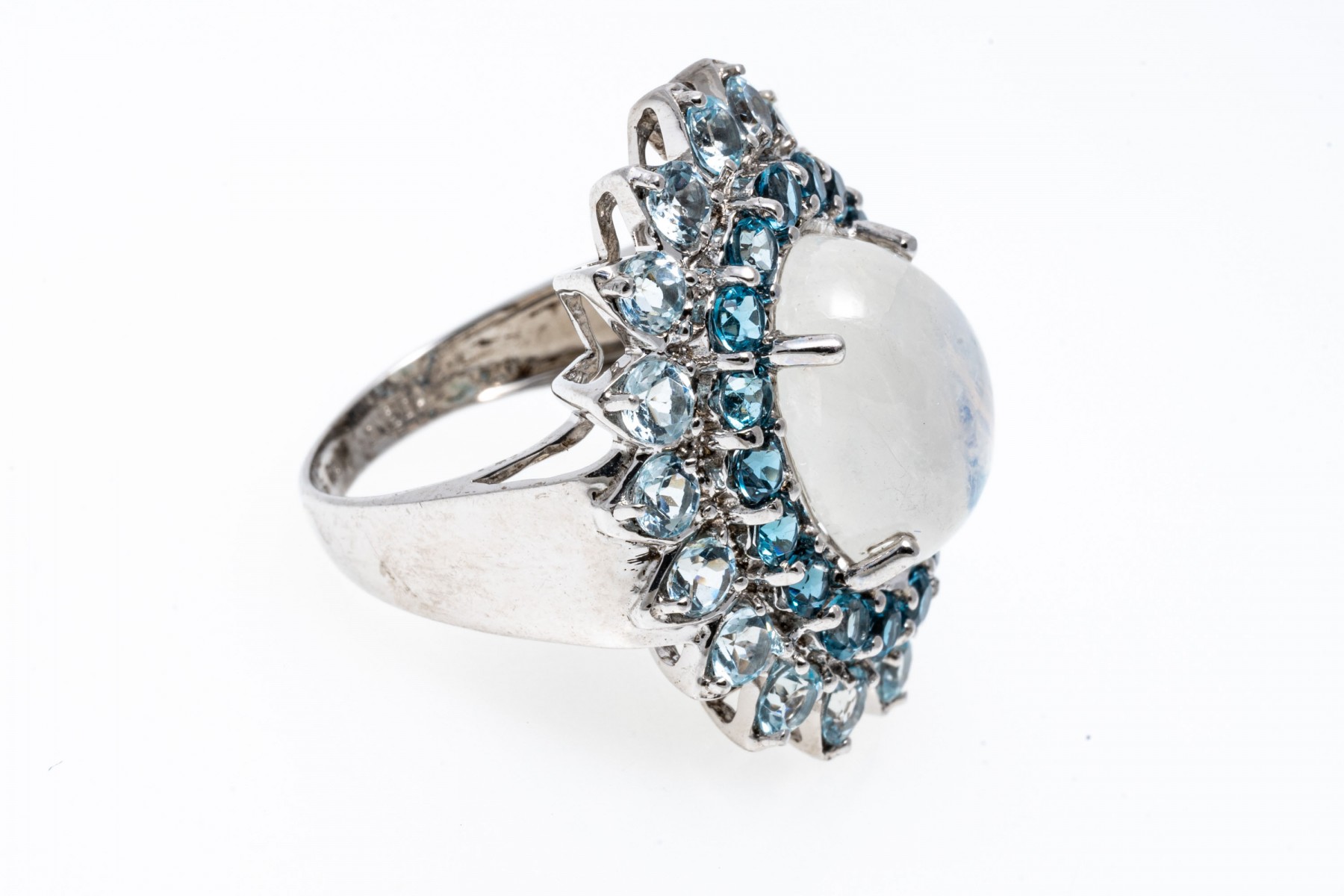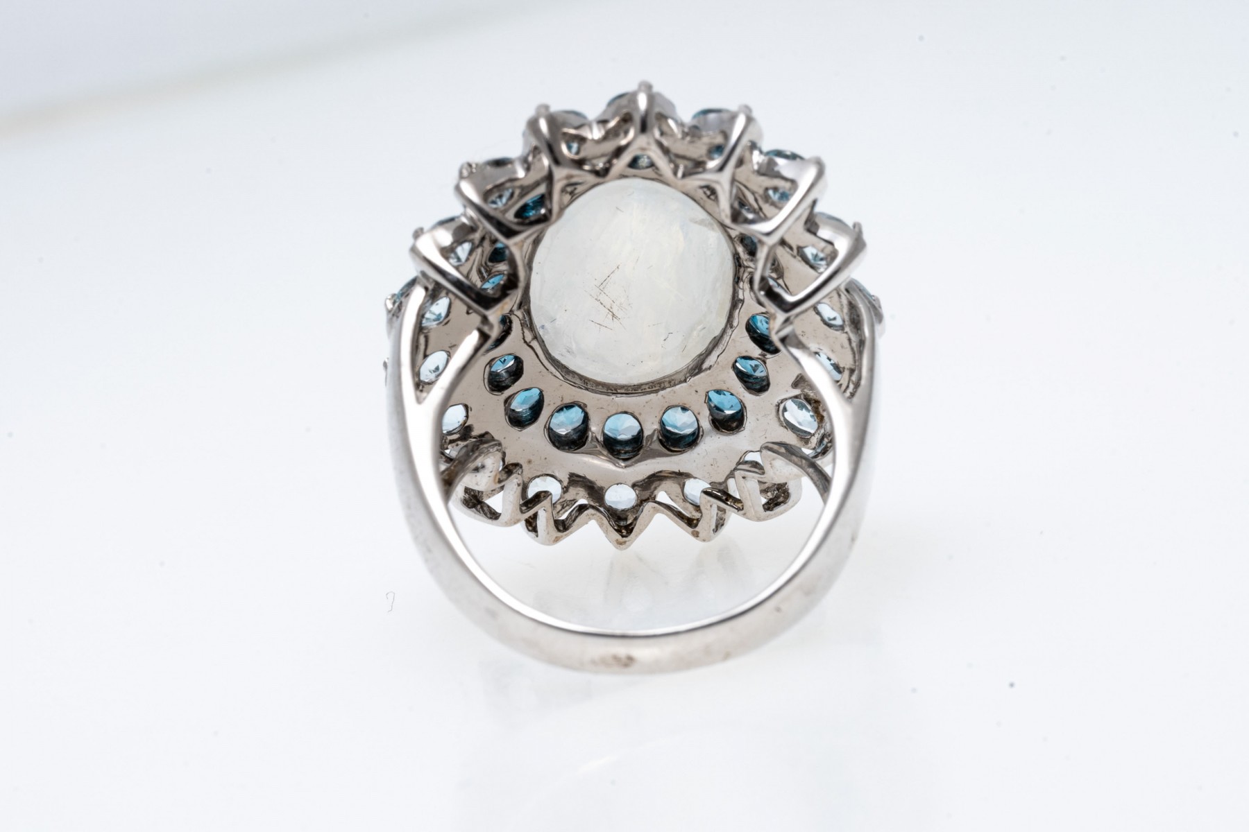 Prong set at the center of this ring is a stunning iridescent moonstone. Surrounding the moonstone are two halos, the outer of light blue topaz and the inner of darker blue topaz. Ring size 7.