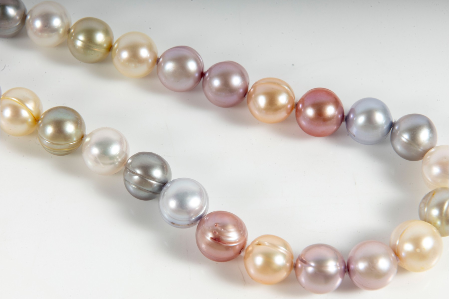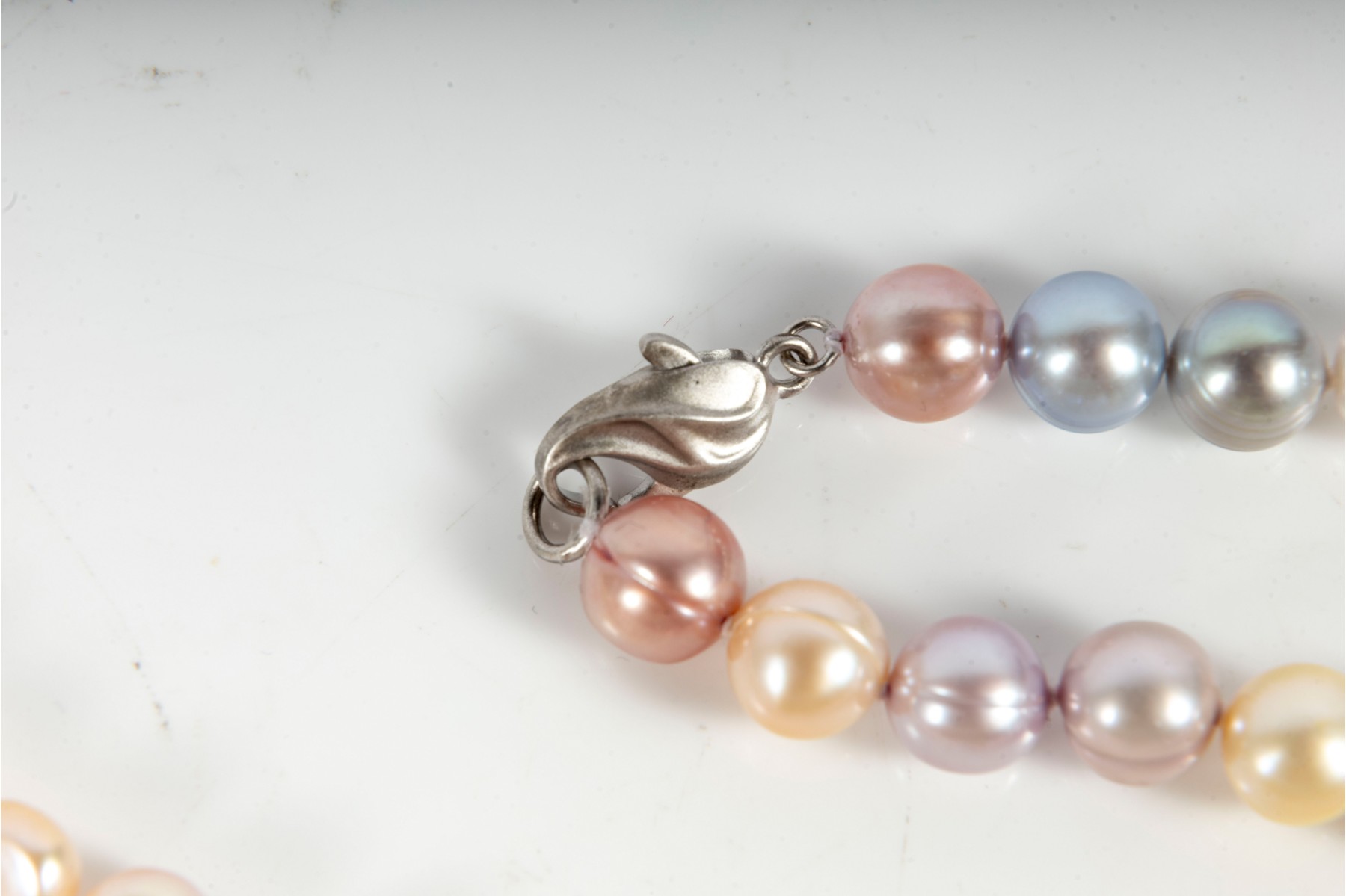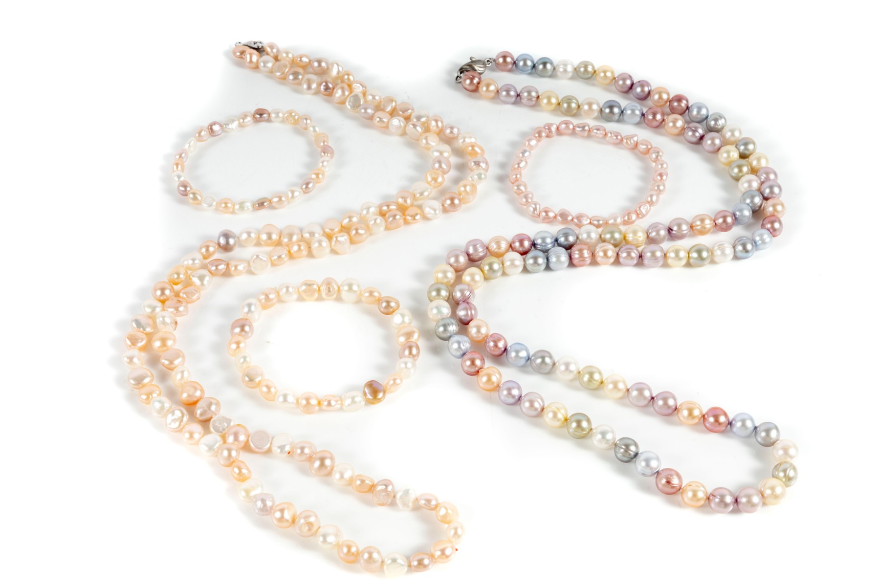 This stunning set of multi-colored cultured pearl necklaces and bracelets is a vibrant and elegant collection, featuring pearls in an array of rich, luminous hues. The necklace and bracelets showcase pearls in shades of soft pink, creamy white, silvery gray, and delicate lavender.