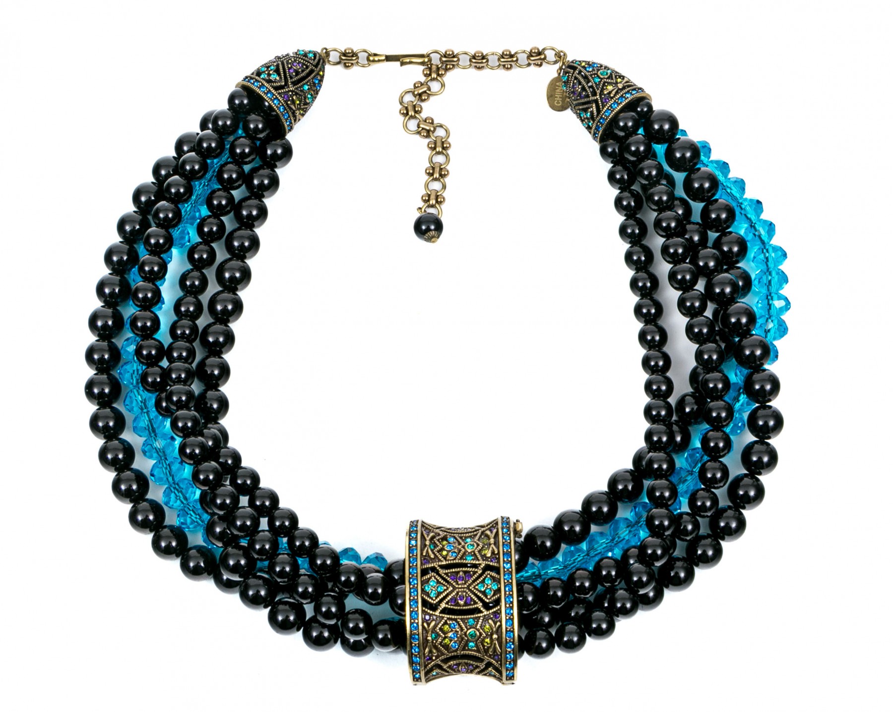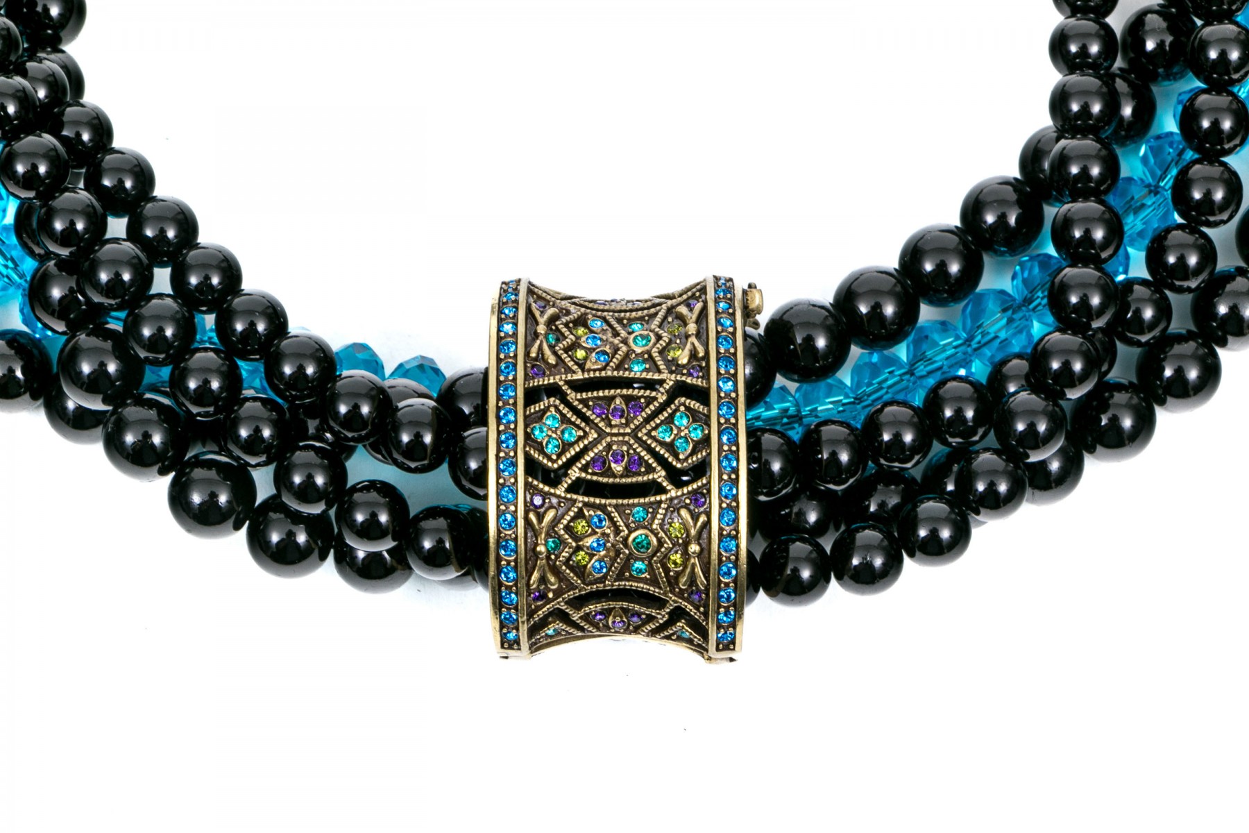 This stunning necklace by Heidi Daus displays four strands of black onyx beads, 8.3mm and 10.0mm, with a single strand of bright blue zirconia. A removable center sliding charm style pendant is set at the center. Adjustable hook style clasp.