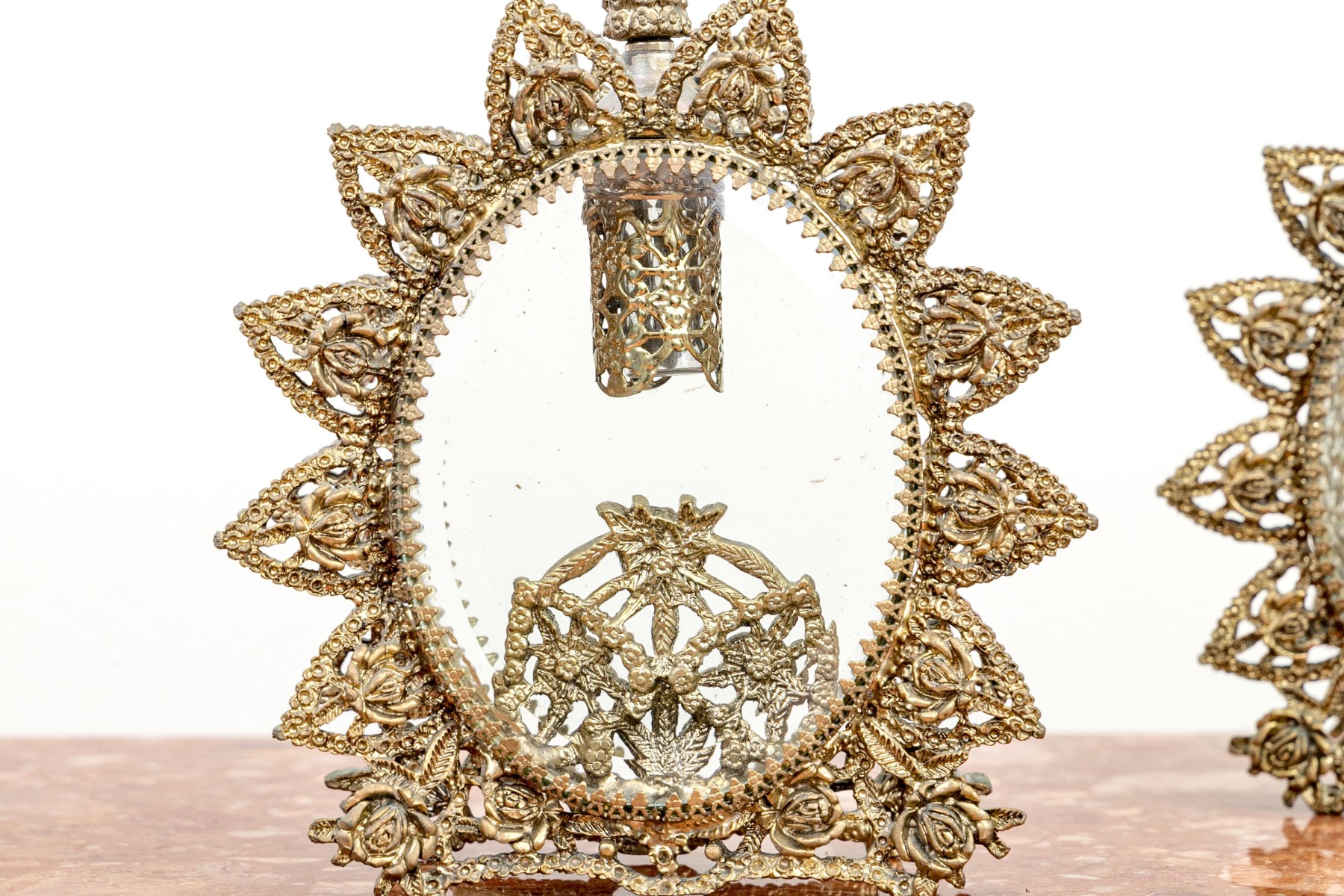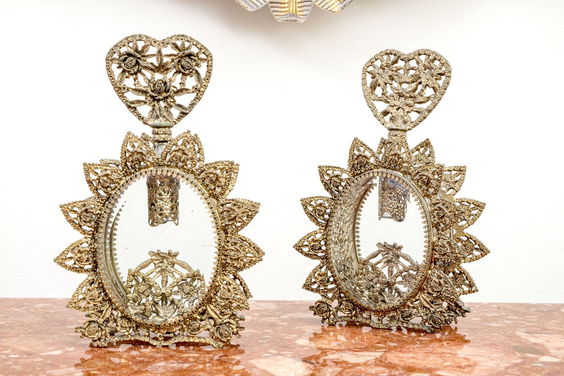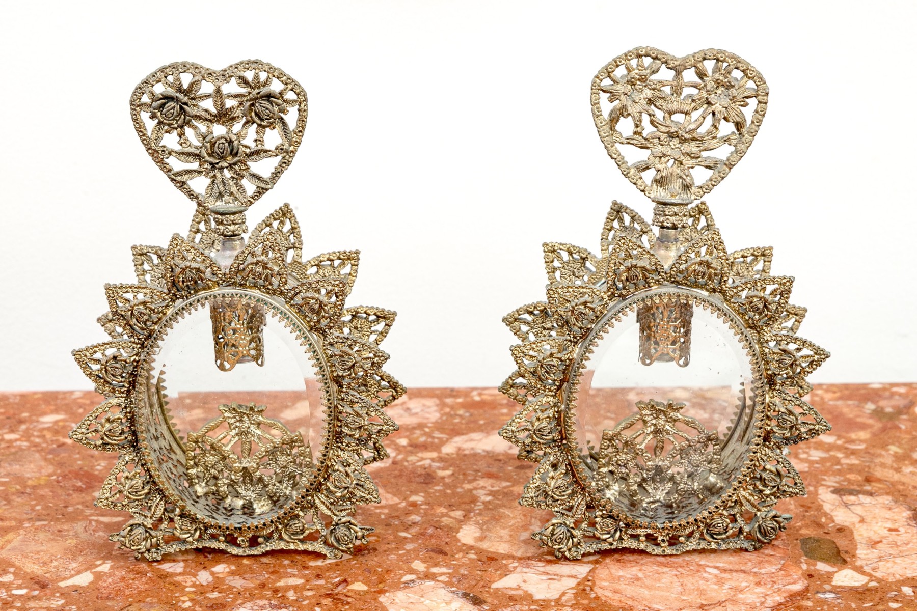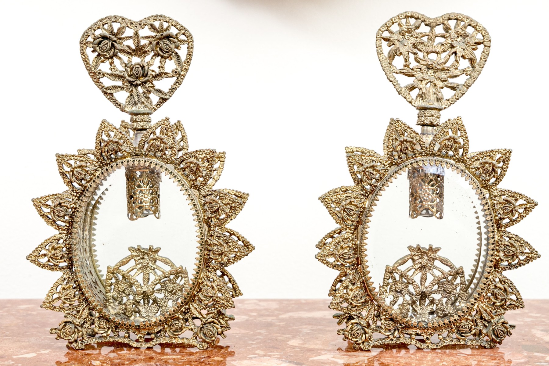 A stunning pair of perfume bottles showcasing ornate ormolu filigree designs. Heart shaped finials on the stoppers are detailed with three large roses, complementing petaled frames surrounding oval glass centers. Beautifully designed with Art Nouveau elegance, showcasing fine attention to detail to create highly decorative and sophisticated displays.