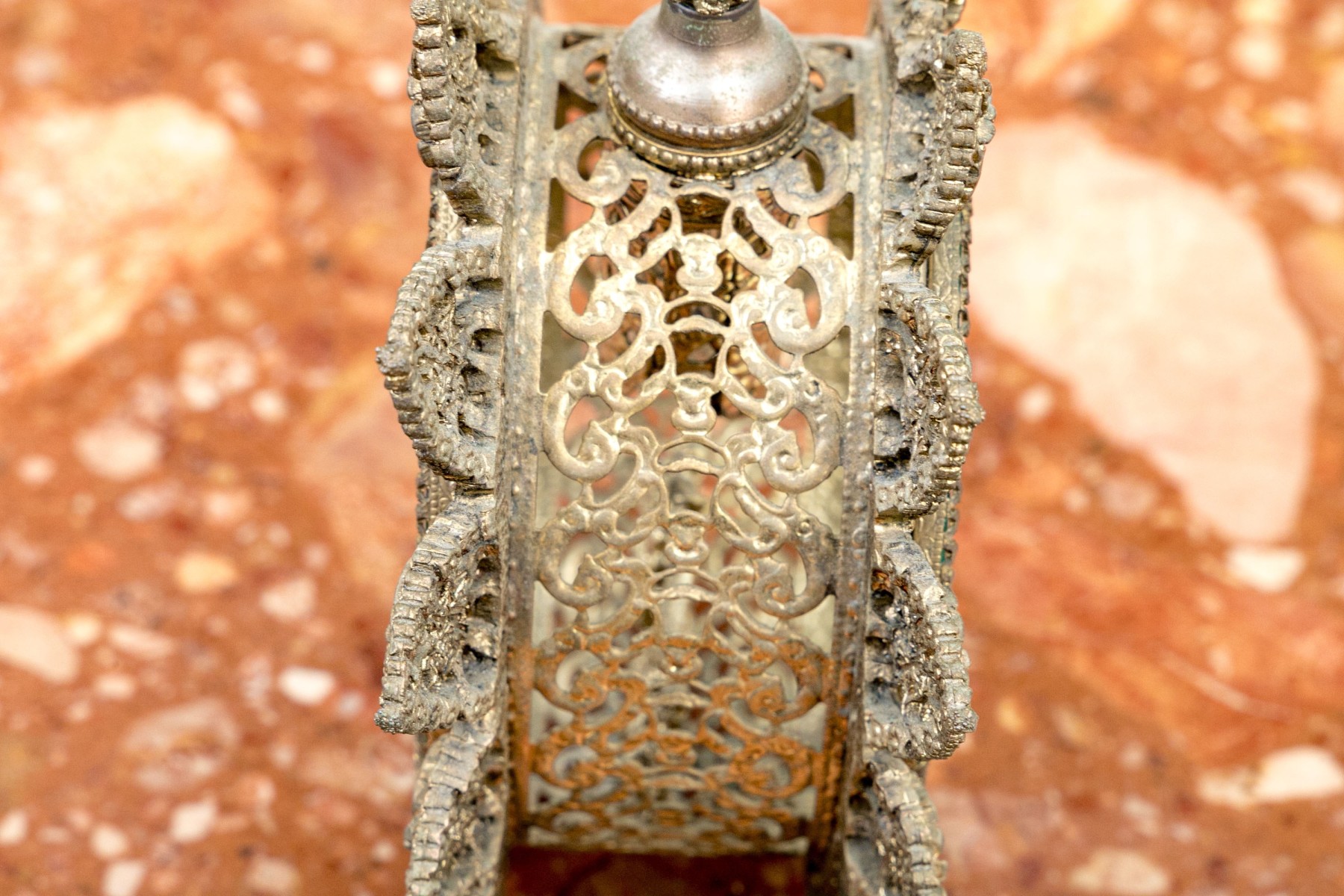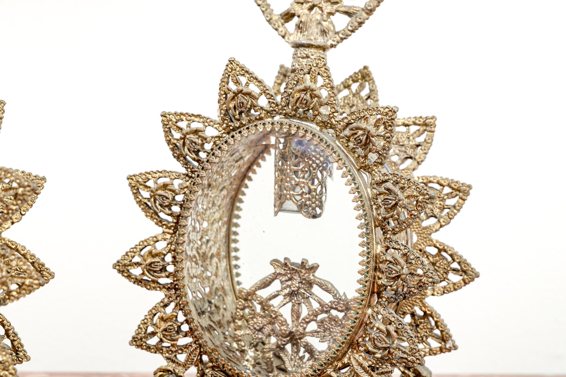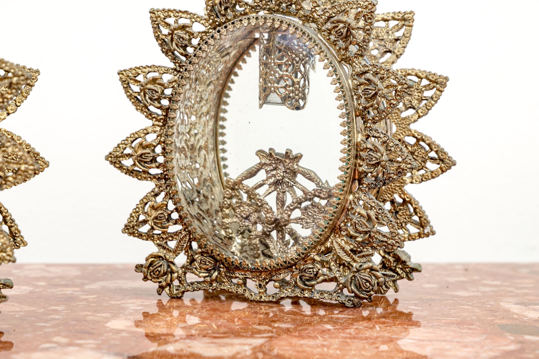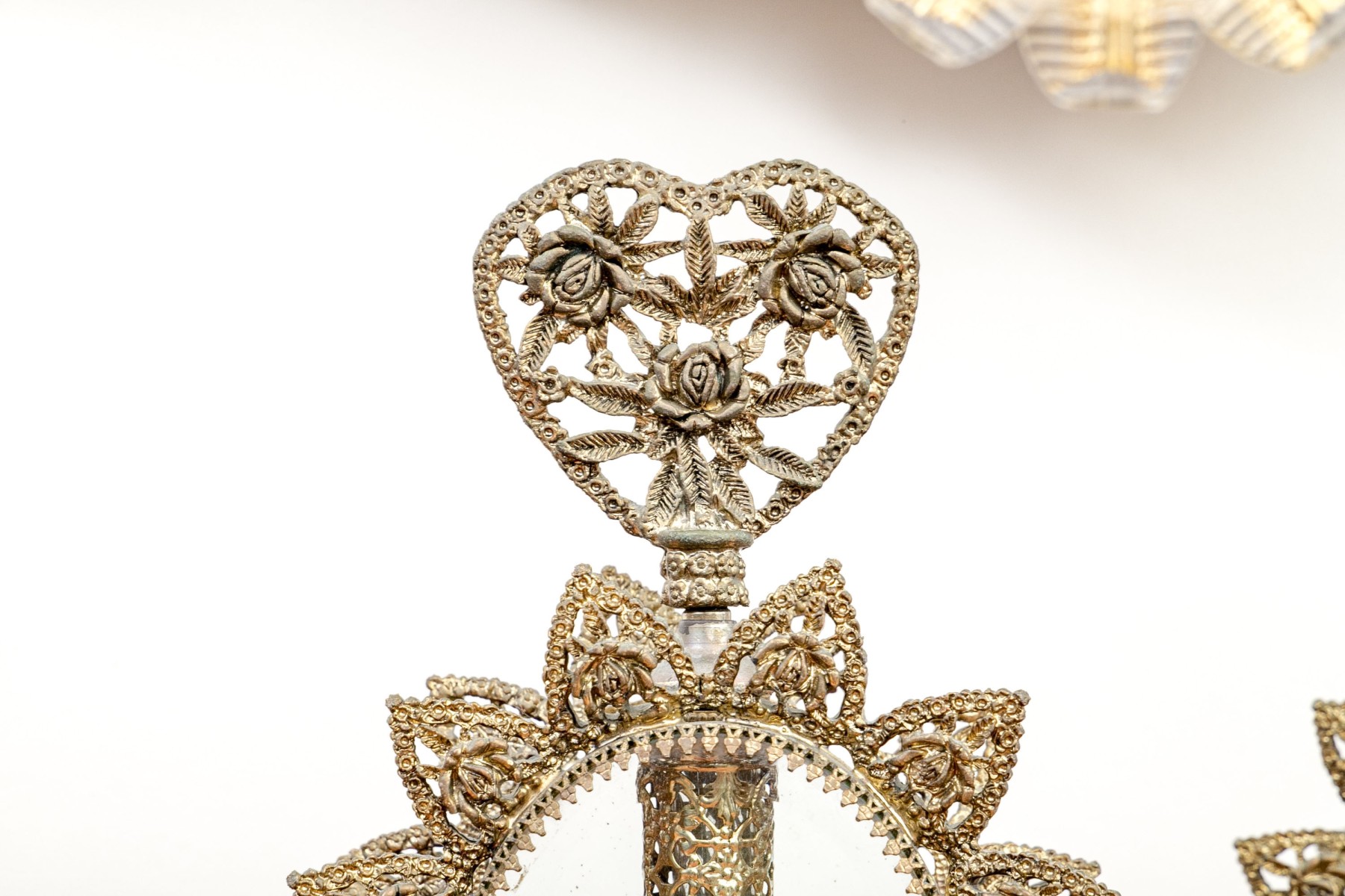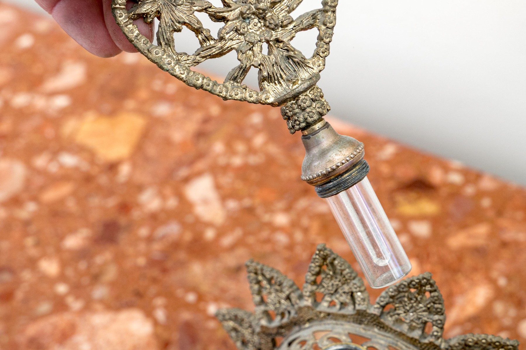 A stunning pair of perfume bottles showcasing ornate ormolu filigree designs. Heart shaped finials on the stoppers are detailed with three large roses, complementing petaled frames surrounding oval glass centers. Beautifully designed with Art Nouveau elegance, showcasing fine attention to detail to create highly decorative and sophisticated displays.
