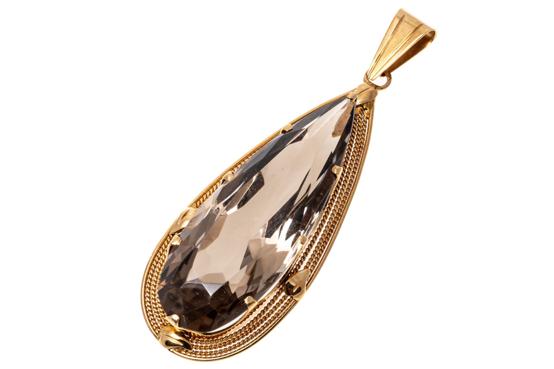 Stunning pear cut smoky quartz stone set into a 14K yellow gold pendant with a twist frame and leaf accents. The stone is approximately 26.05 cts.