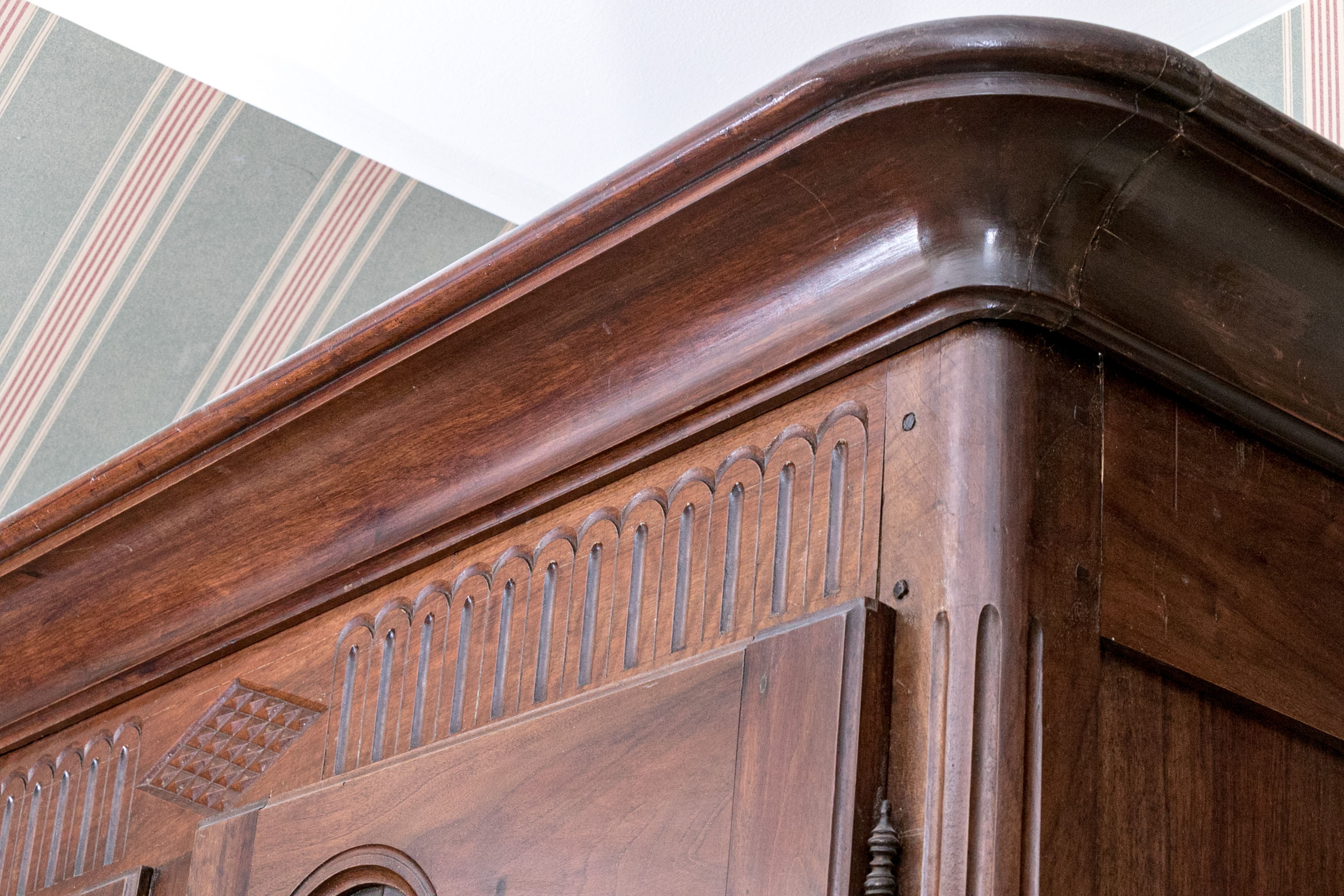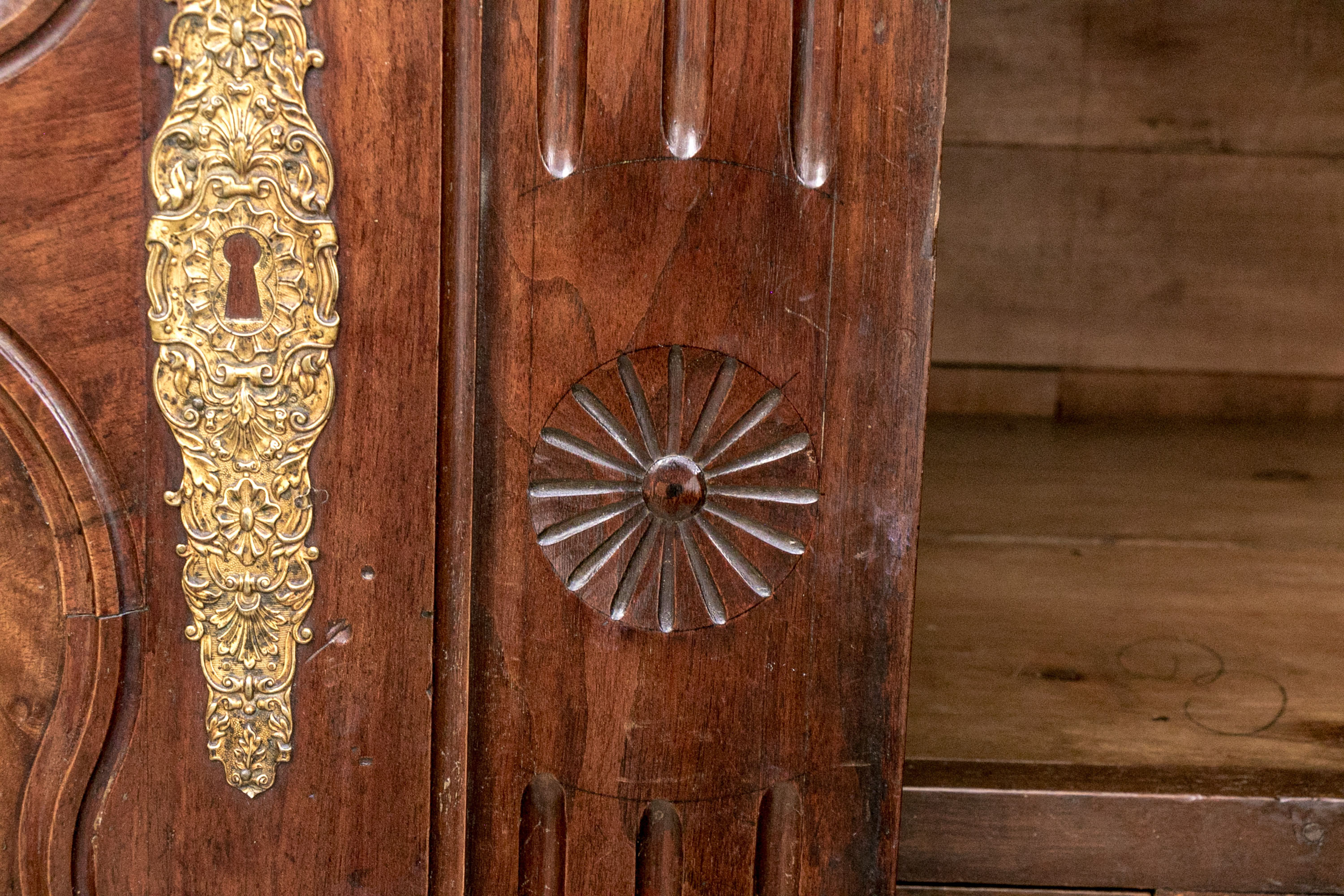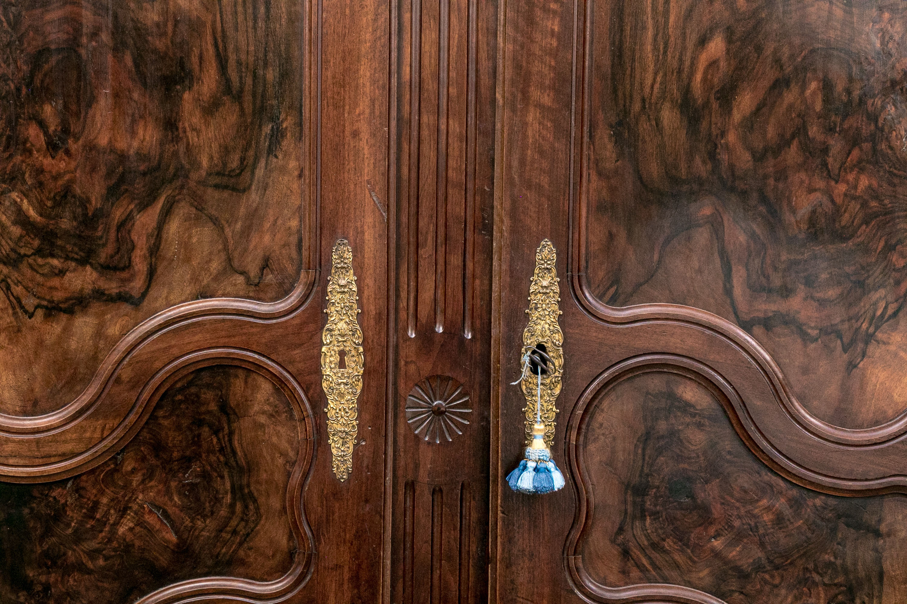 A stunning, high quality armoire exuding Louis XV elegance in a rich, medium-dark brown finish. The armoire sports a moulded flat crown with arched fluting flanking a central quilted diamond design. Double doors are beautifully paneled with jaw-dropping veneers showcasing excellent wood grain. Opulent gilt or brass key escutcheon add to the opulent appearance, opening the doors to a shelved interior with a midsection of three drawers. A circular medallion draws the eye to the scalloped apron, while stout cabriole front legs complete the design.