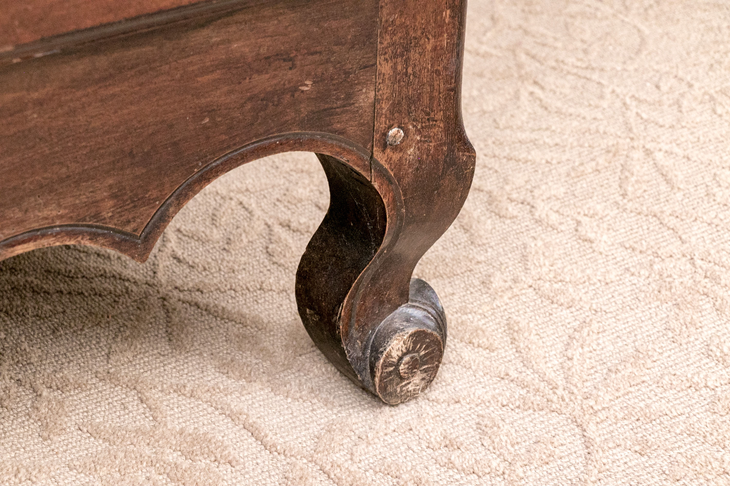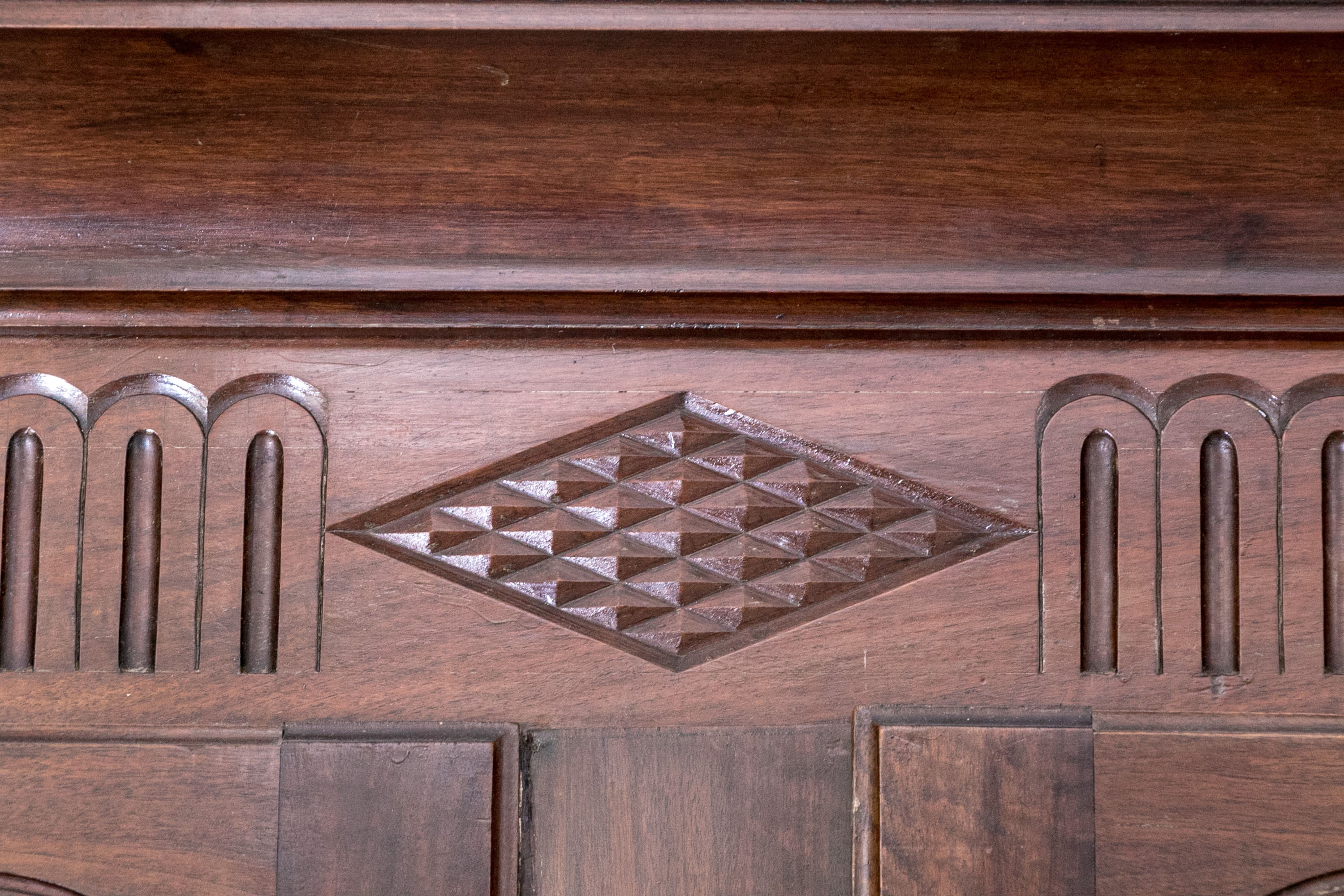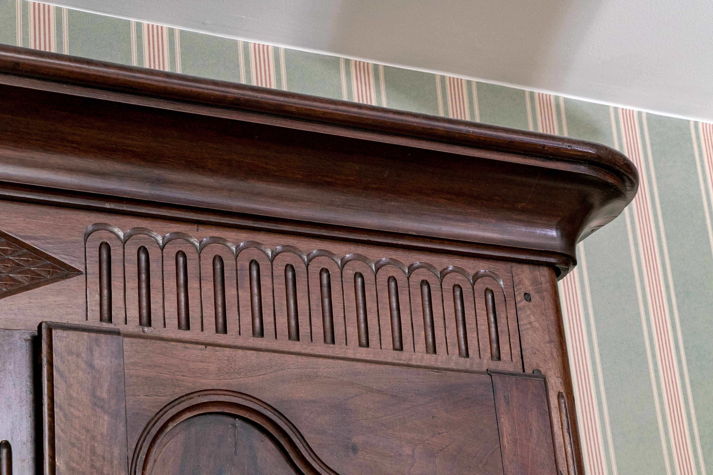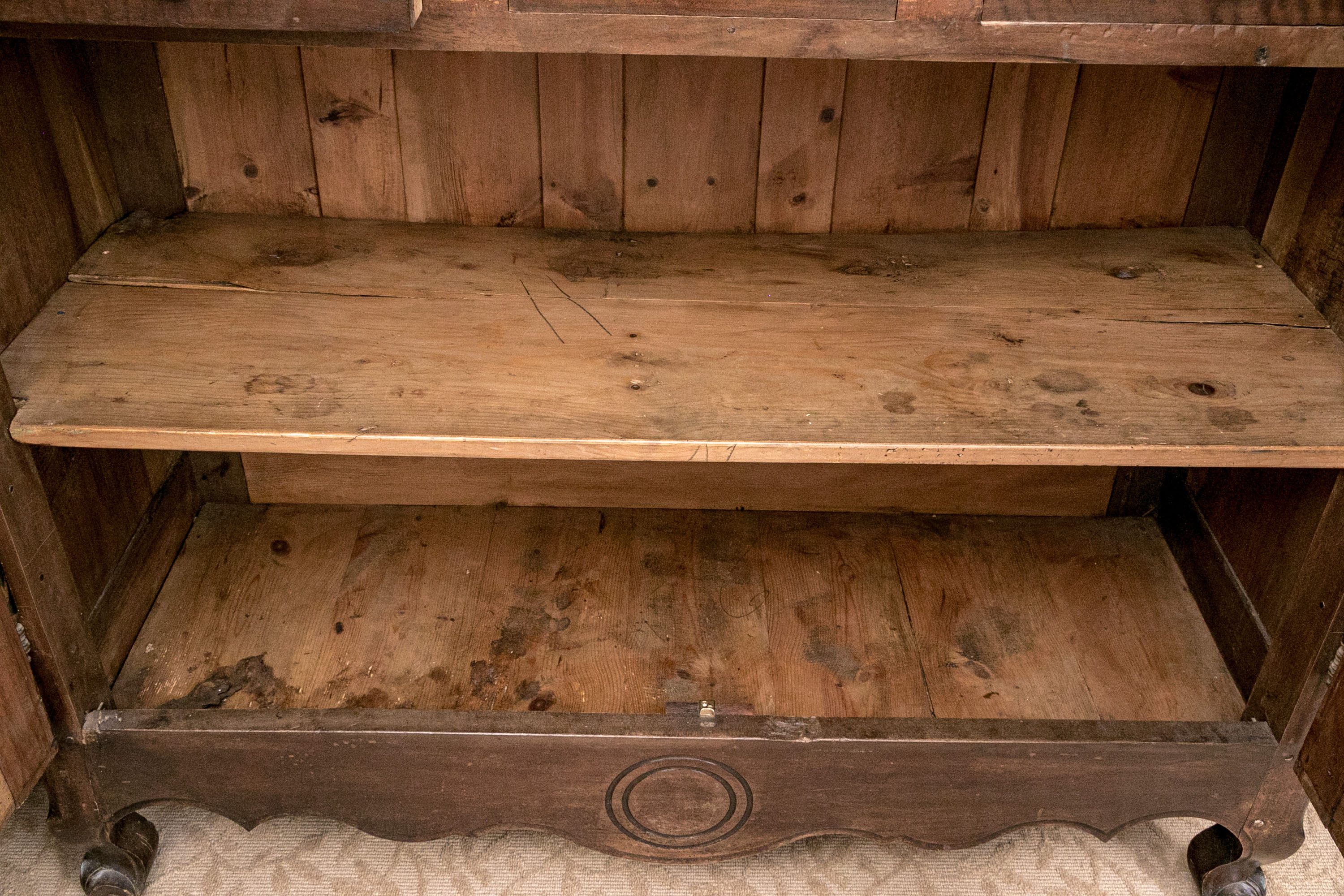 A stunning, high quality armoire exuding Louis XV elegance in a rich, medium-dark brown finish. The armoire sports a moulded flat crown with arched fluting flanking a central quilted diamond design. Double doors are beautifully paneled with jaw-dropping veneers showcasing excellent wood grain. Opulent gilt or brass key escutcheon add to the opulent appearance, opening the doors to a shelved interior with a midsection of three drawers. A circular medallion draws the eye to the scalloped apron, while stout cabriole front legs complete the design.