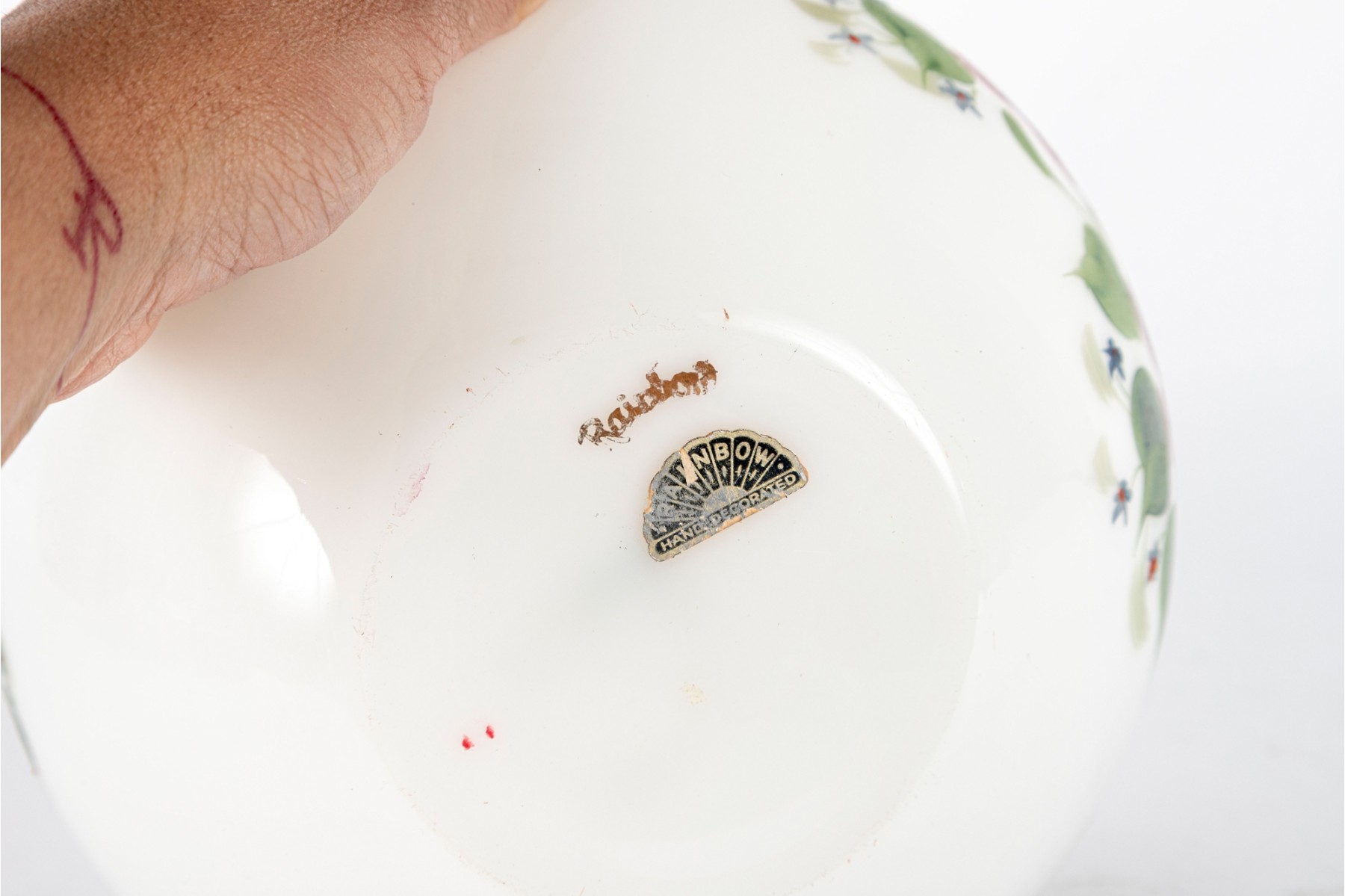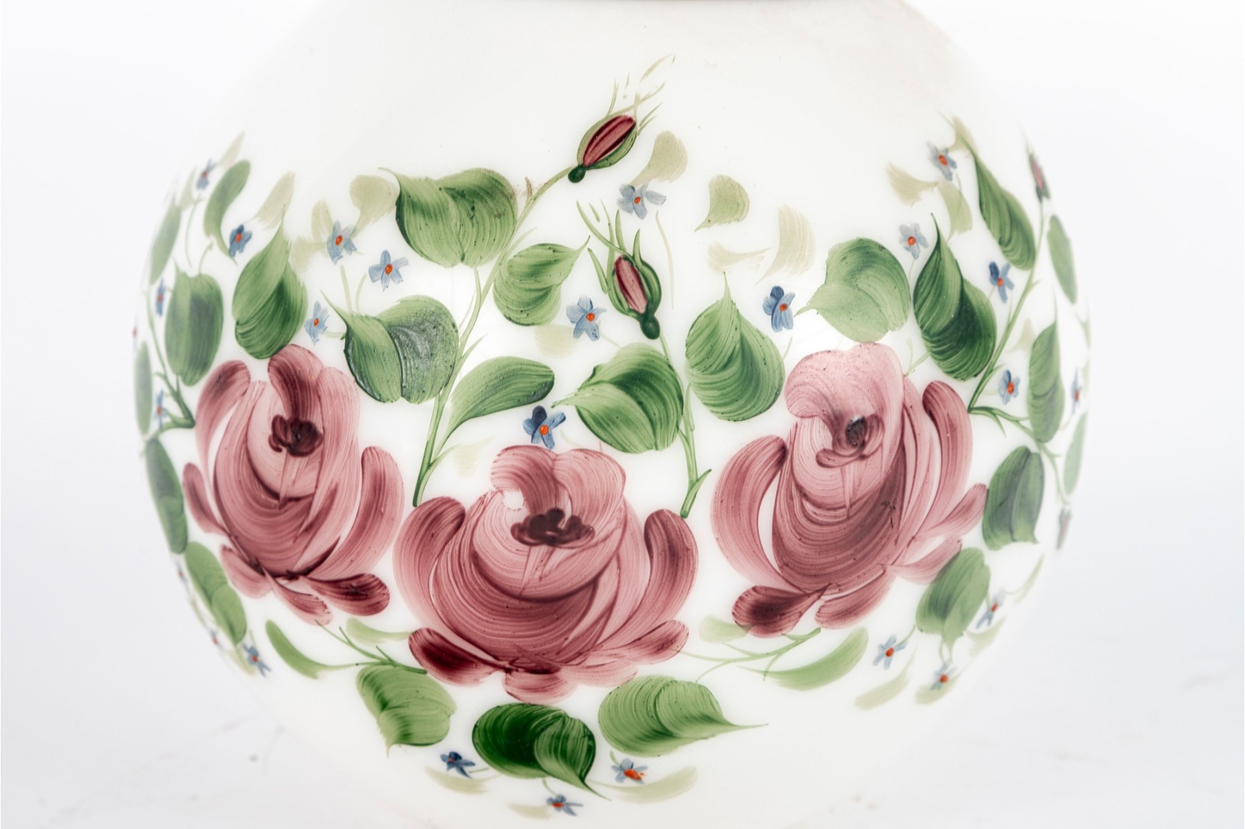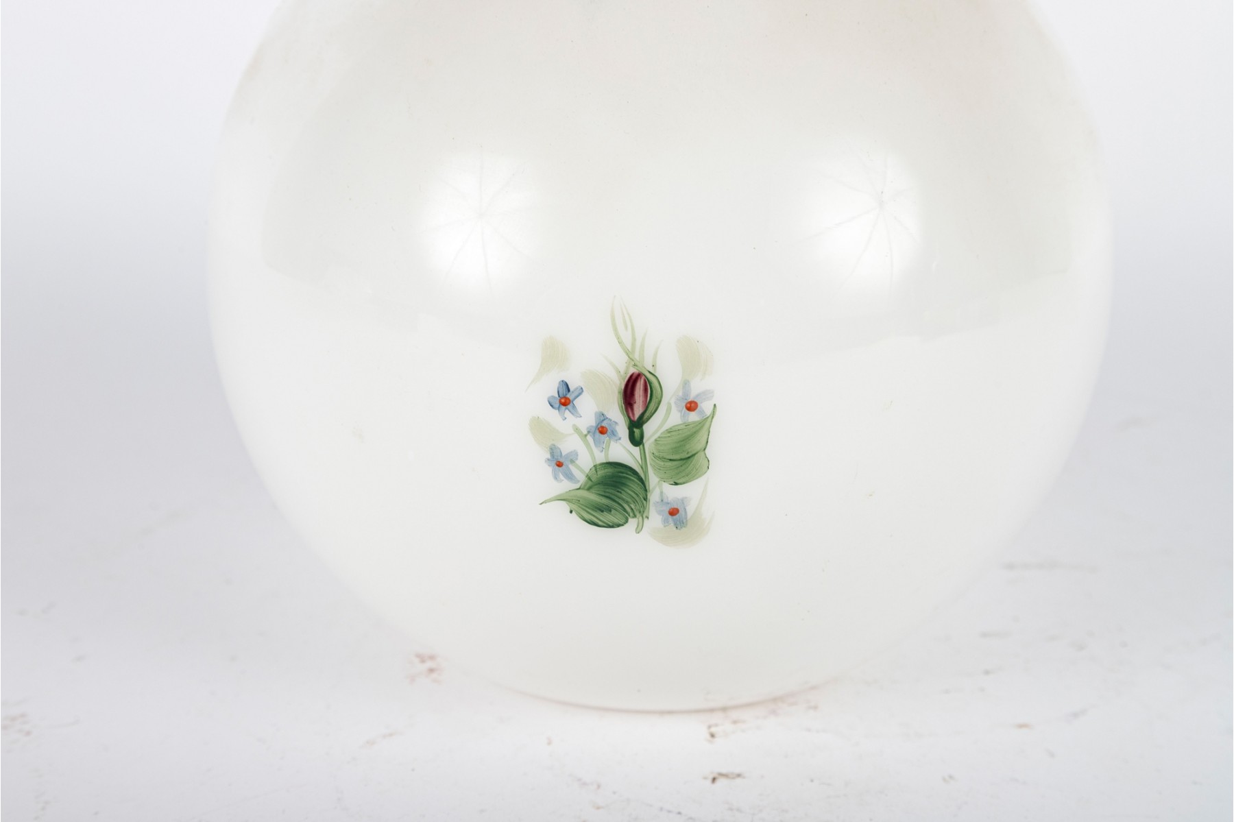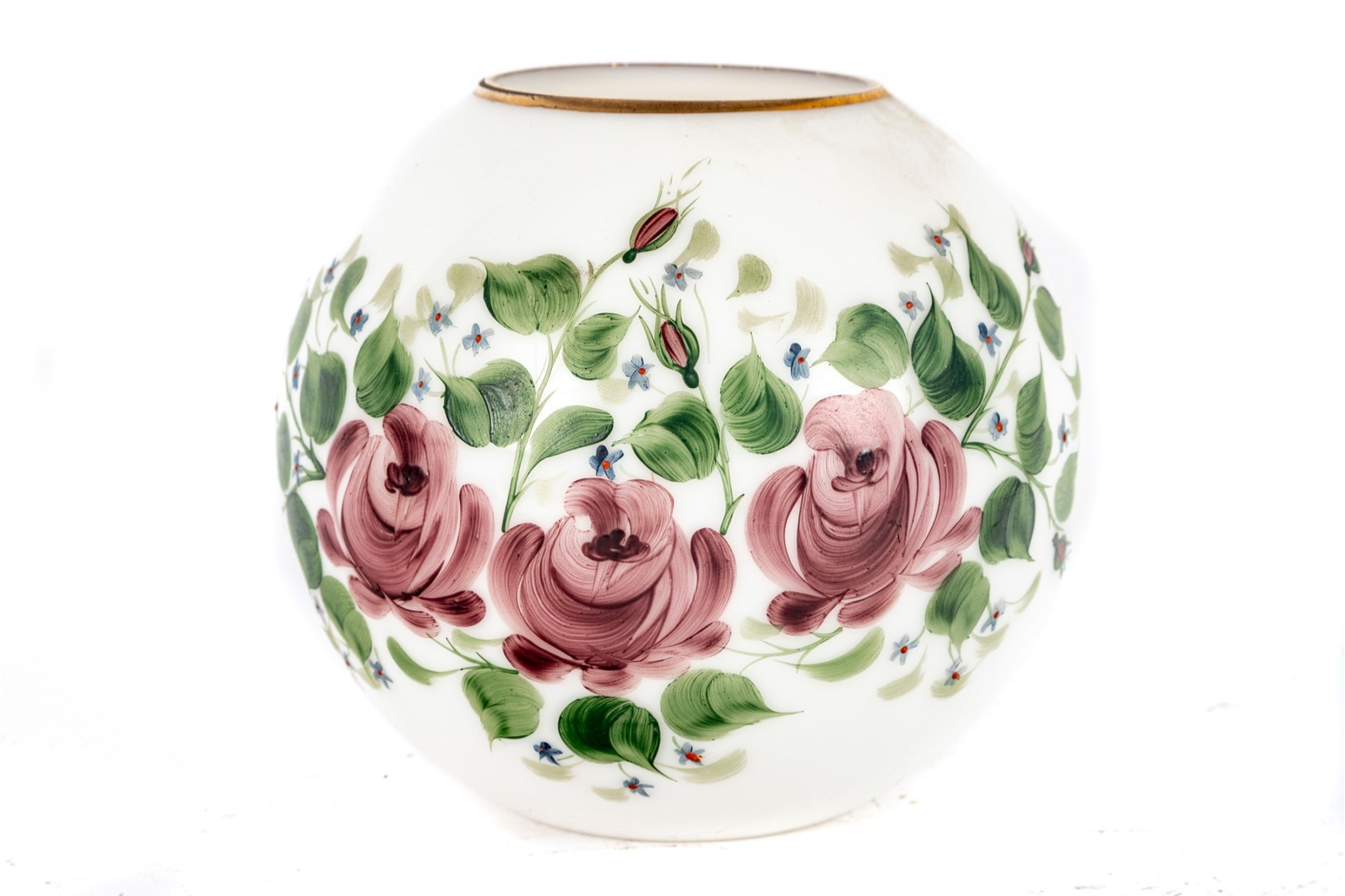 This eye-catching hand-painted milk glass globe vase by Rainbow Glass Co. showcases the company’s signature artistry in vibrant form, adorned with delicately hand-painted floral motifs and gold trim.