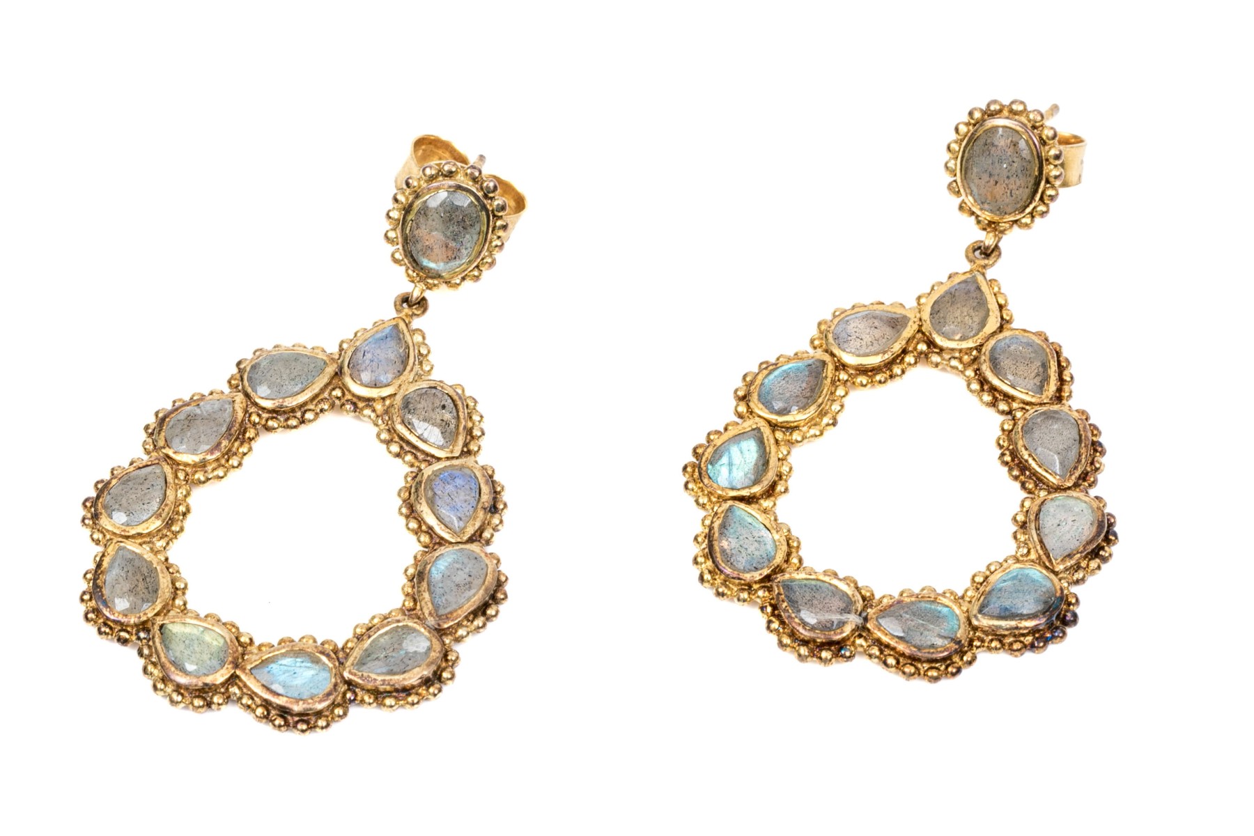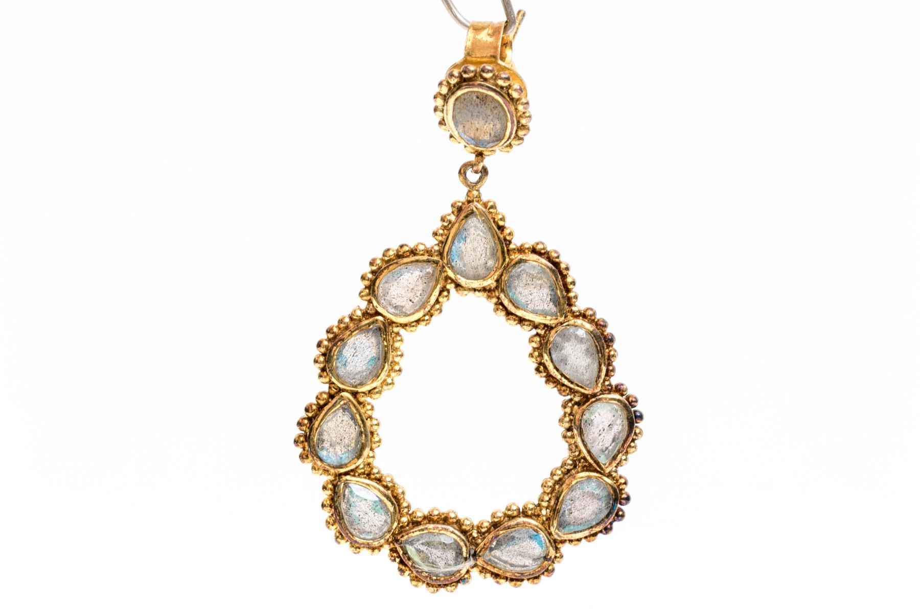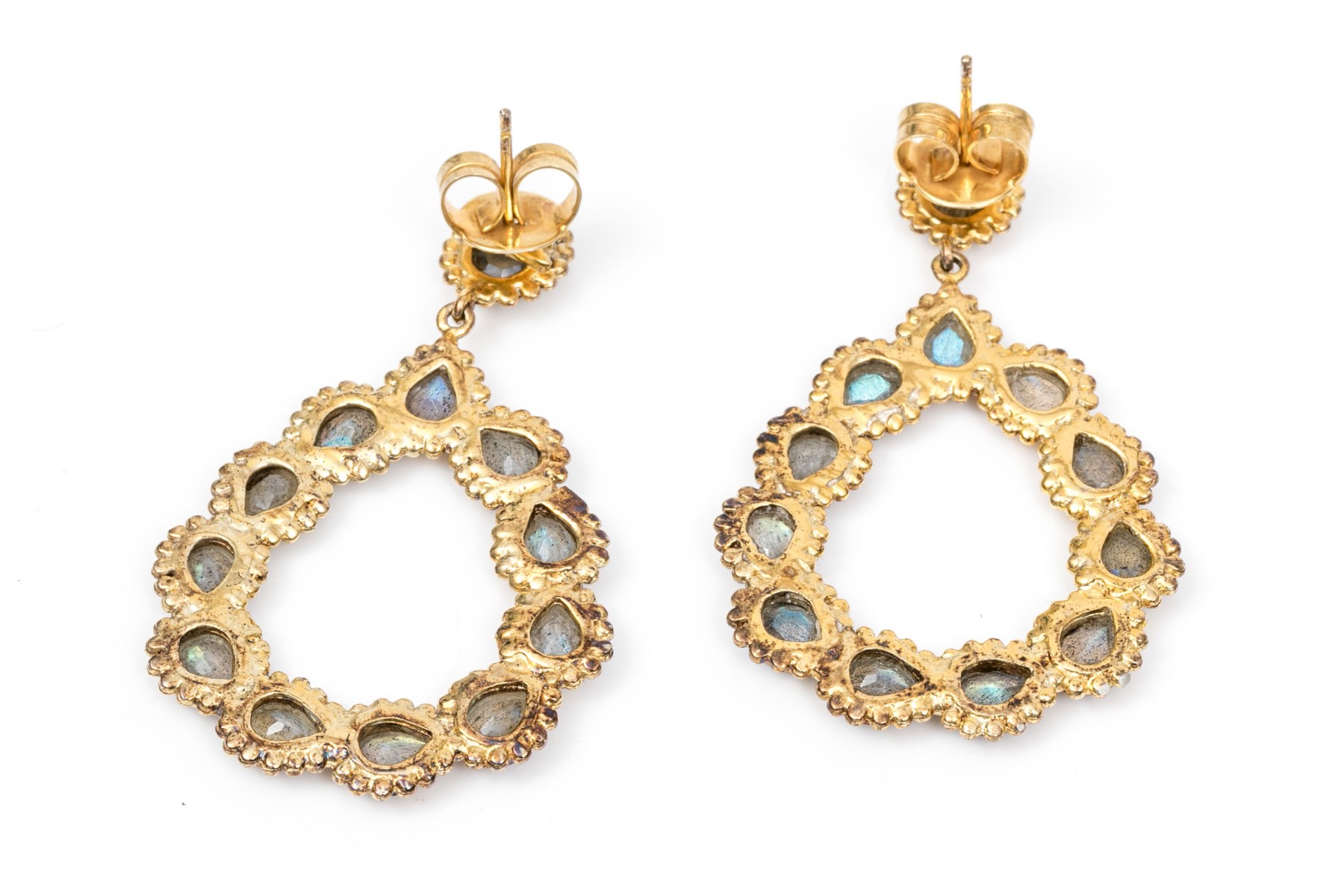 Stunning pair of vermeil sterling silver pendant earrings. The pendants of the earrings have an open design and is set with a ring of pear cut labradorite stones in beadwork. Post and clutch backings.