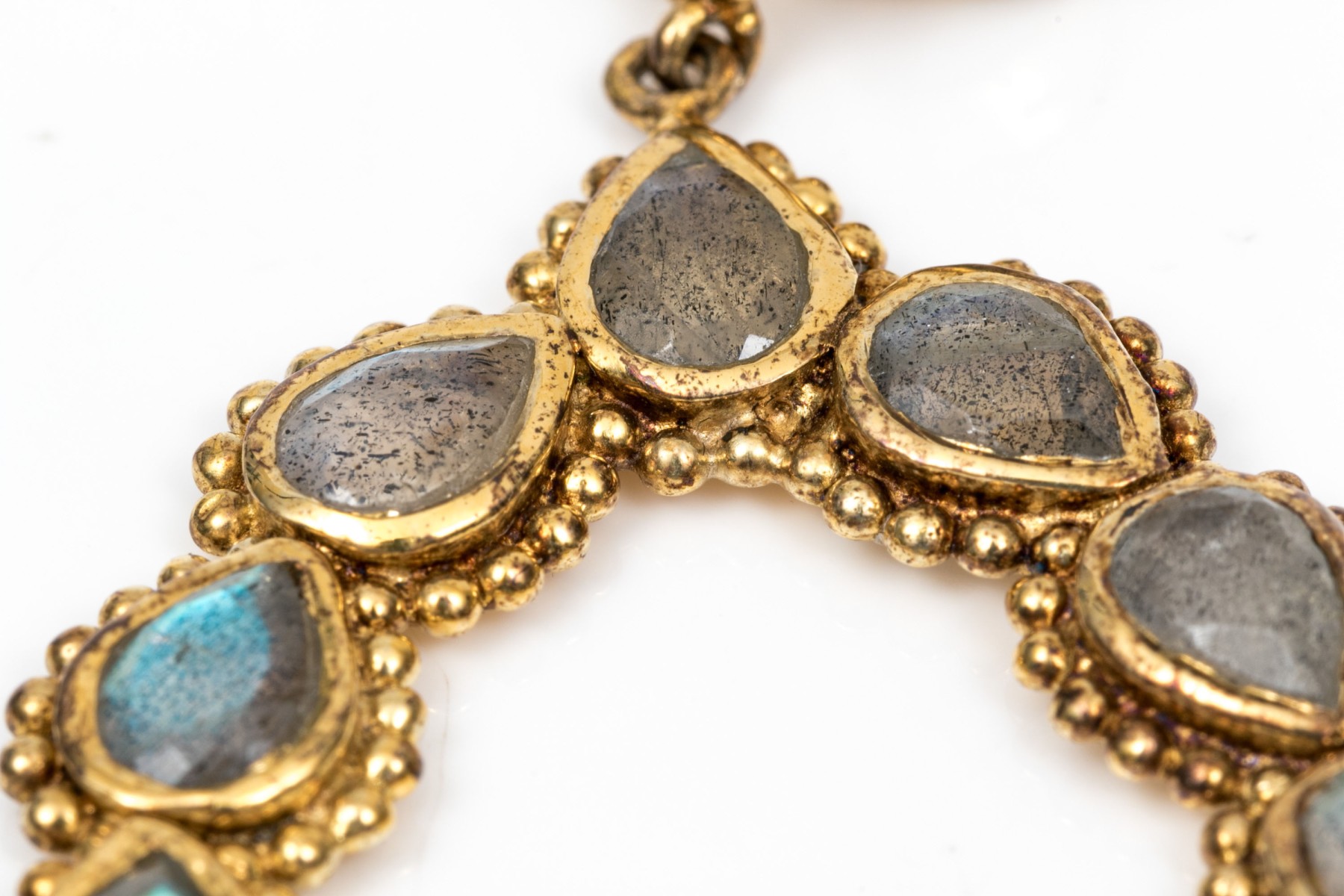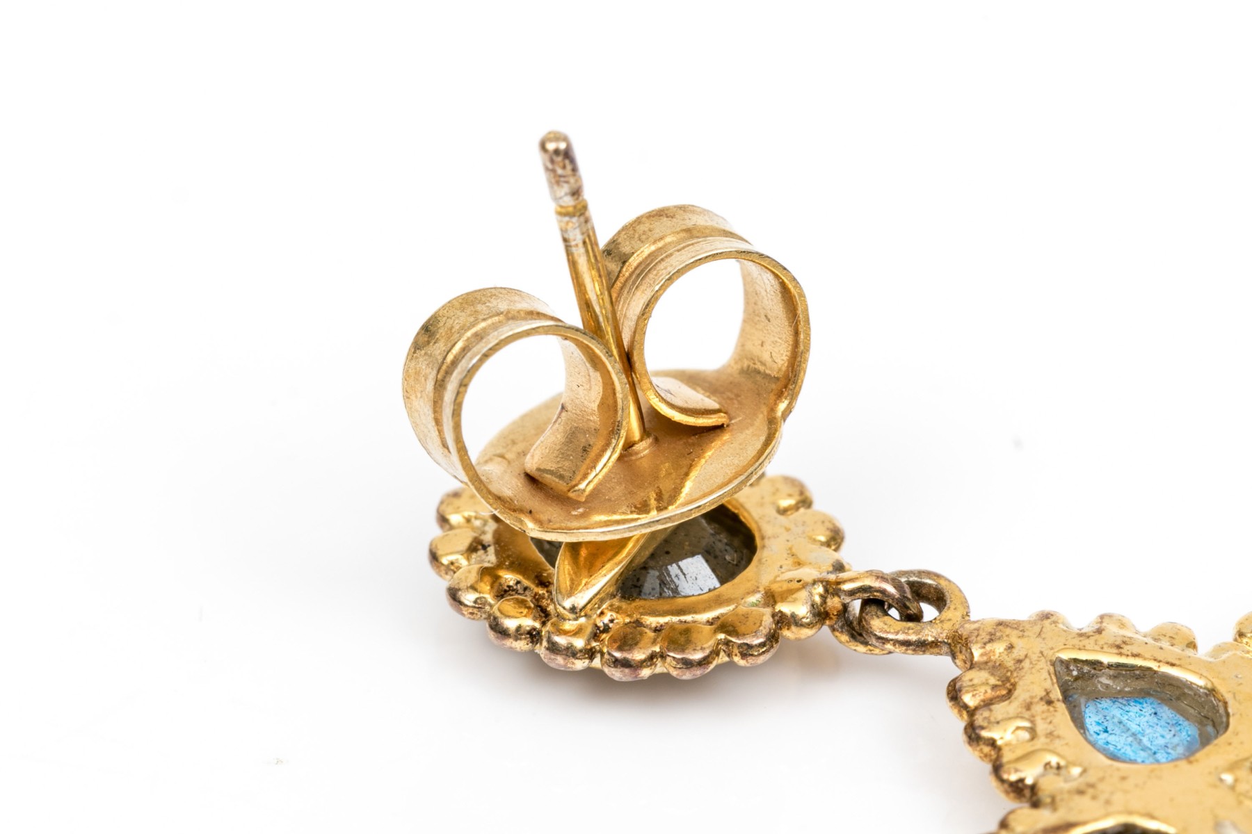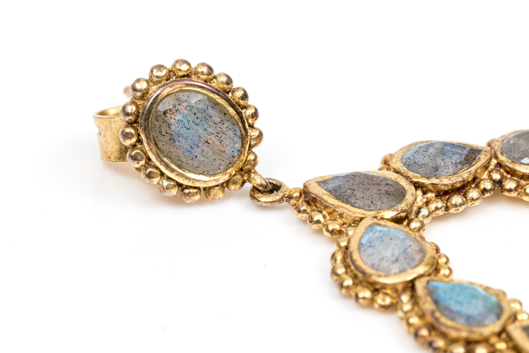 Stunning pair of vermeil sterling silver pendant earrings. The pendants of the earrings have an open design and is set with a ring of pear cut labradorite stones in beadwork. Post and clutch backings.