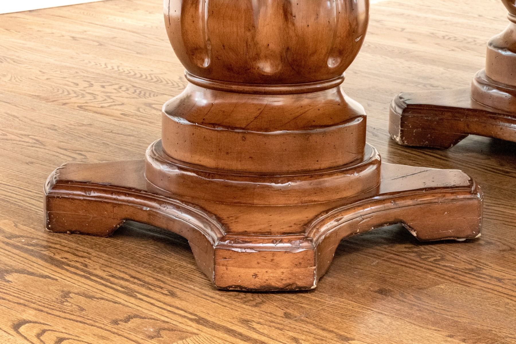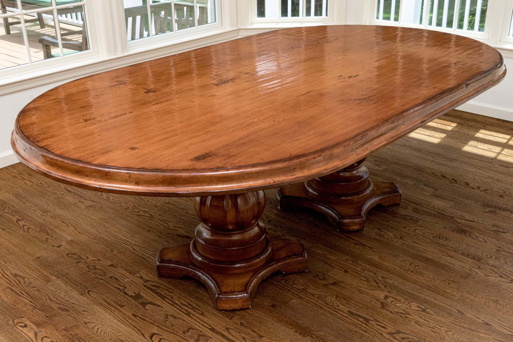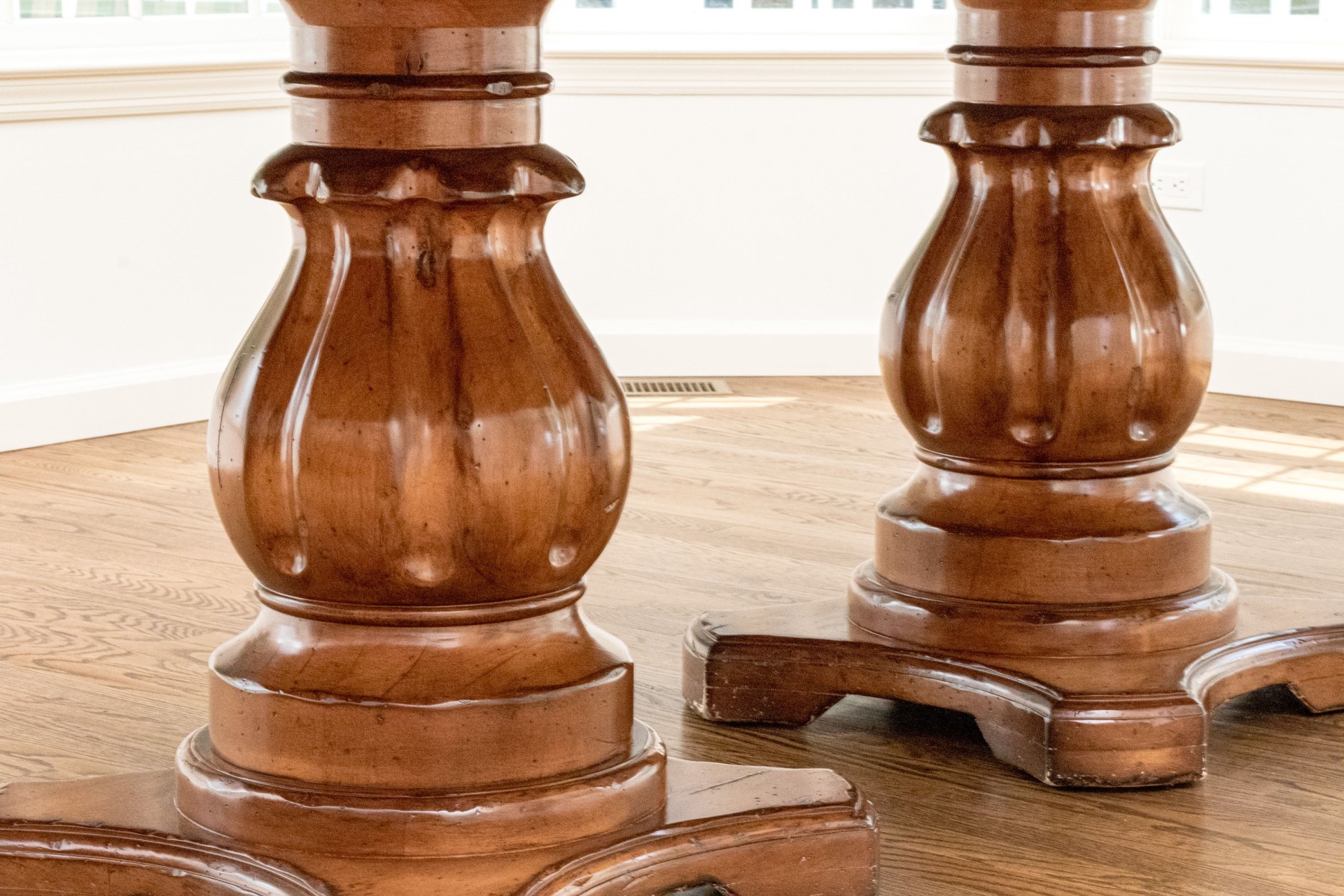 A stunning Woodland Furniture dining table raised on two impressively carved and finished pedestals, each with resting on quatrefoil bases with carved baluster supports. Surmounted by a handsomely finished oval top with a deeply beveled rim.