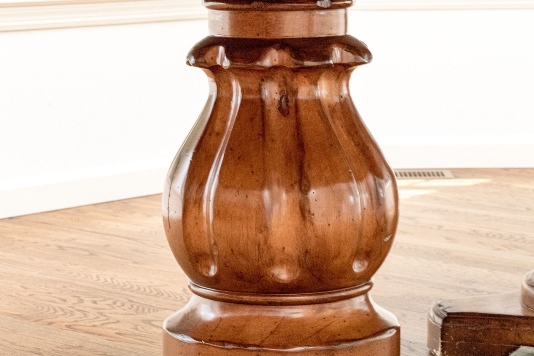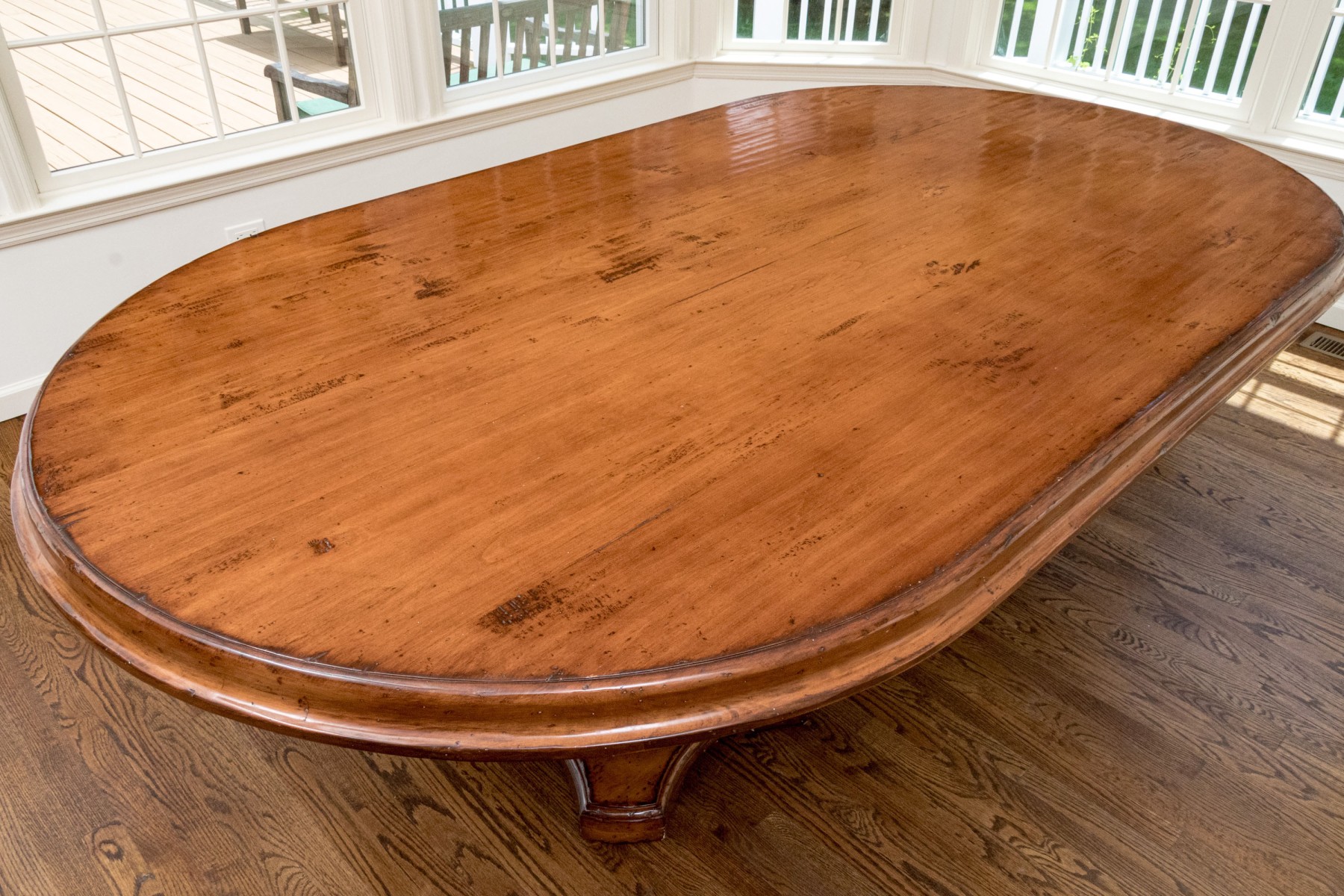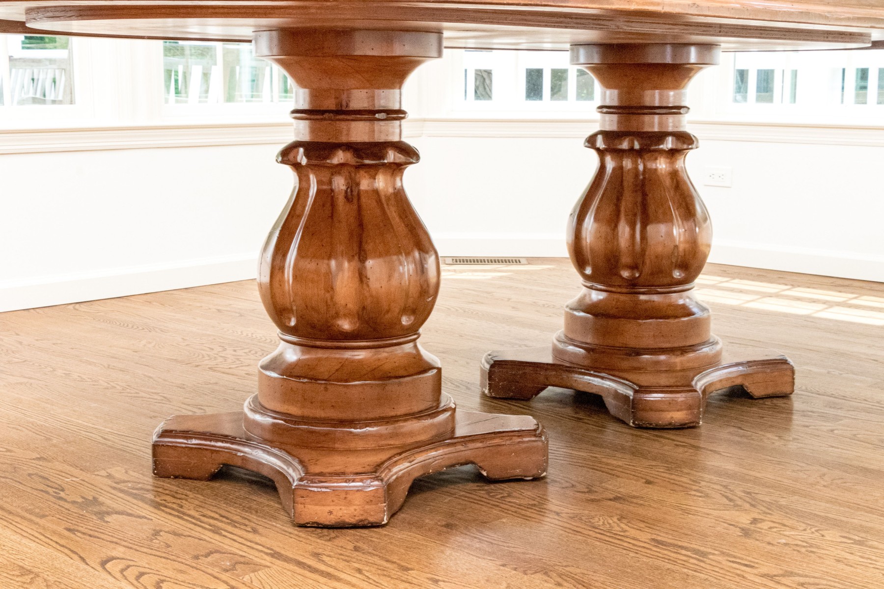 A stunning Woodland Furniture dining table raised on two impressively carved and finished pedestals, each with resting on quatrefoil bases with carved baluster supports. Surmounted by a handsomely finished oval top with a deeply beveled rim.
