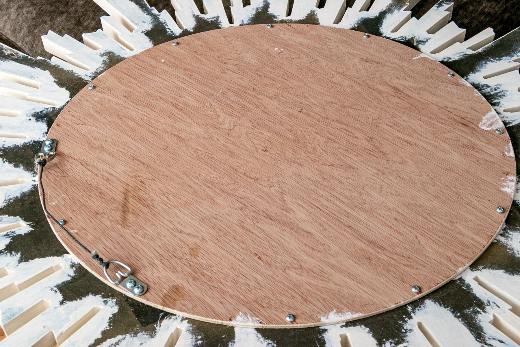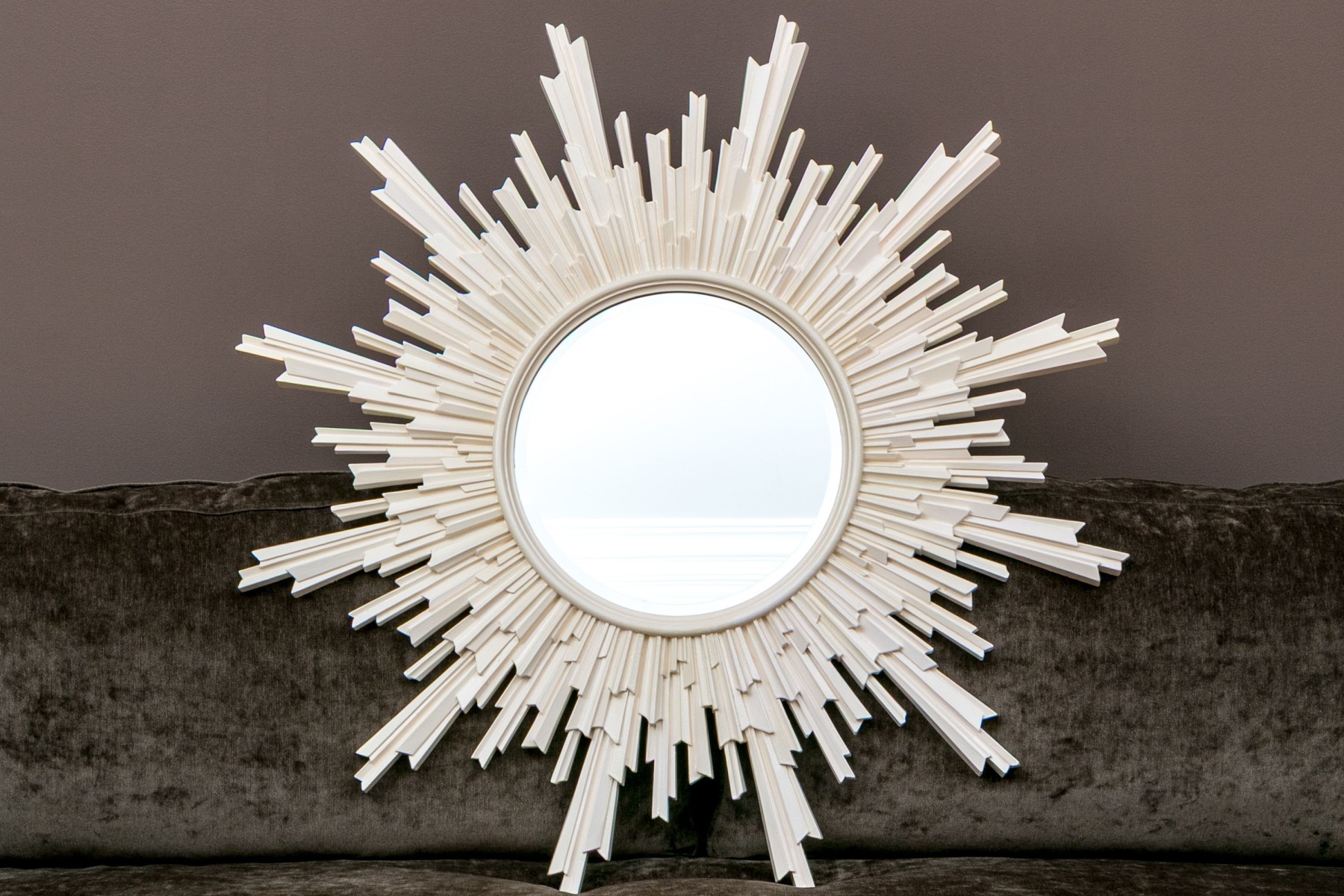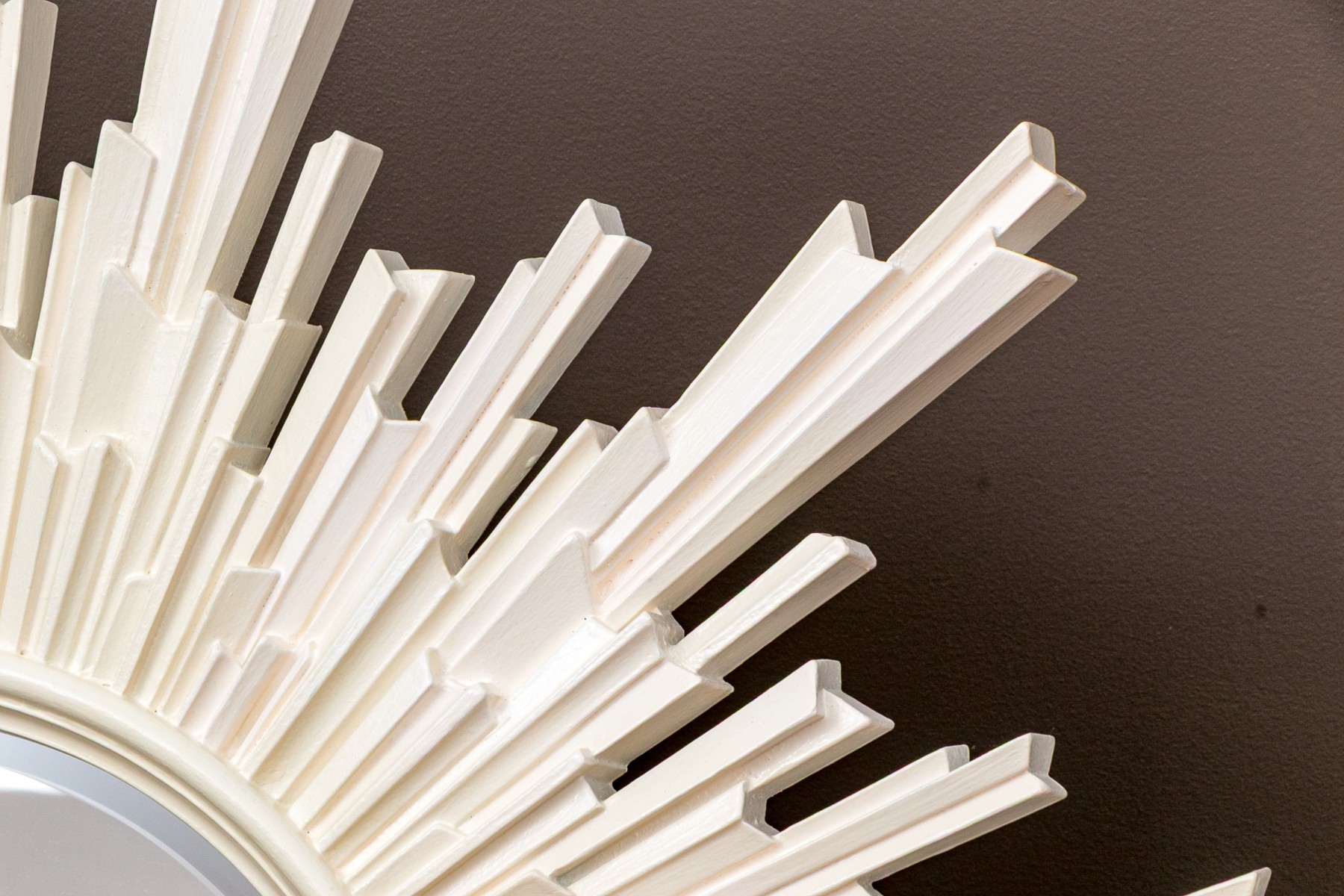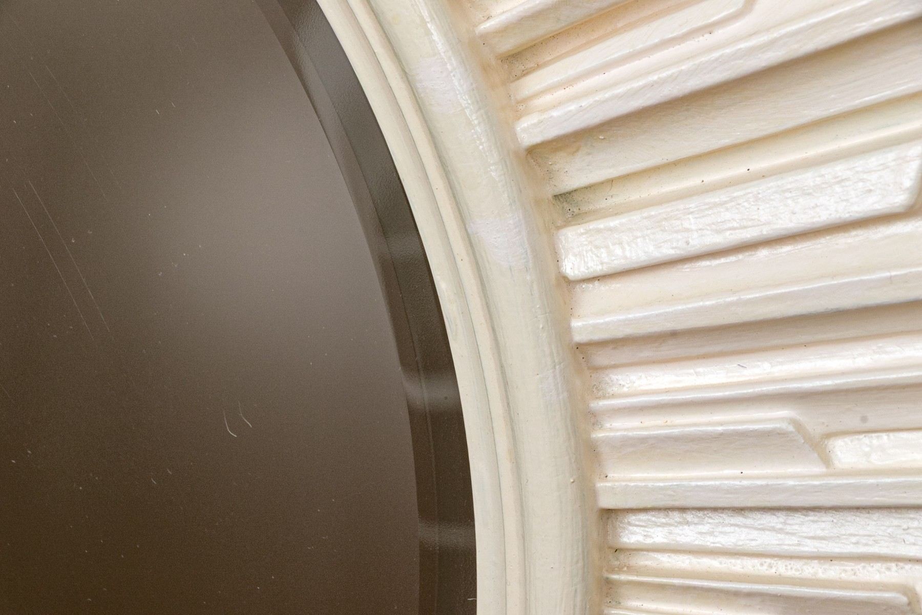 A chic wall mirror sporting a circular beveled center within a stylish warm cream white finished frame beautifully carved with a captivating arrangement of tiered rays that create excellent visual texture.