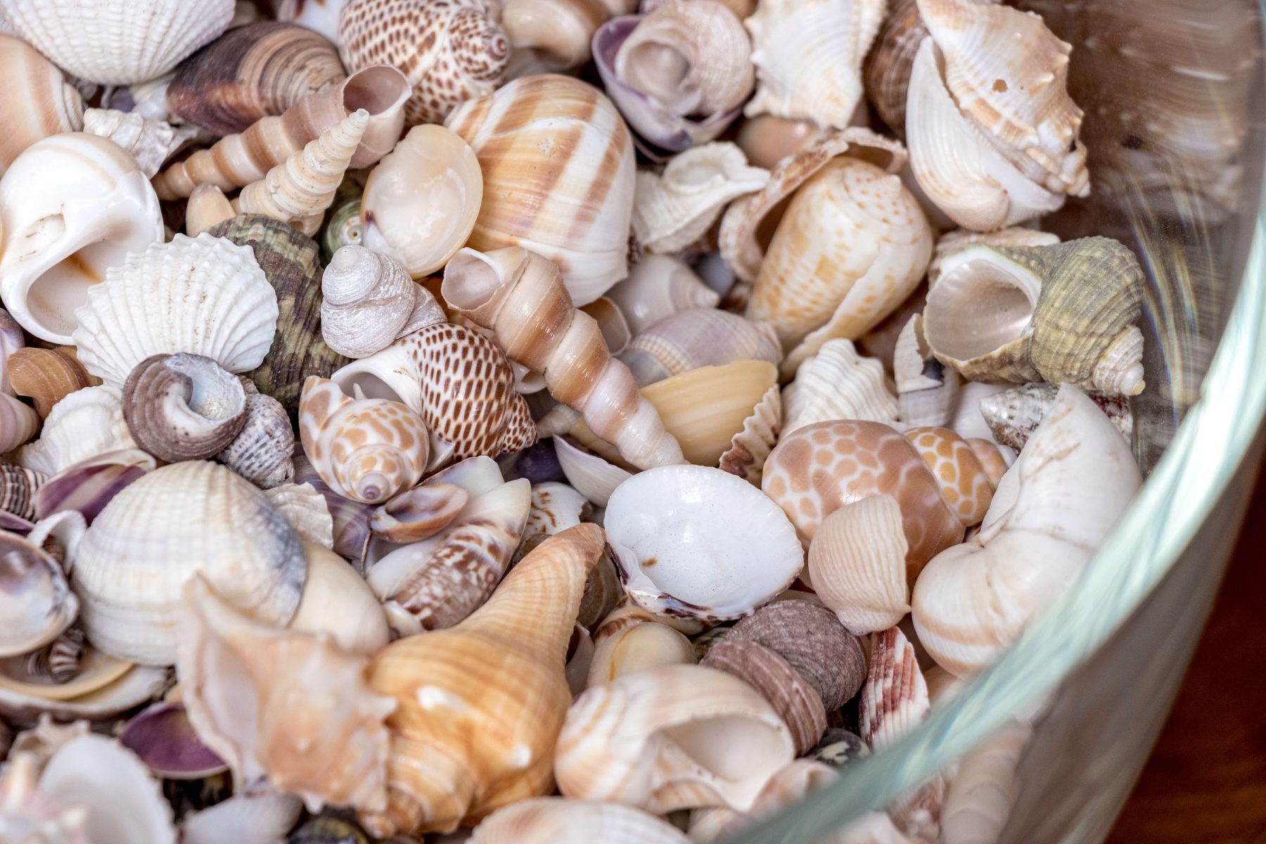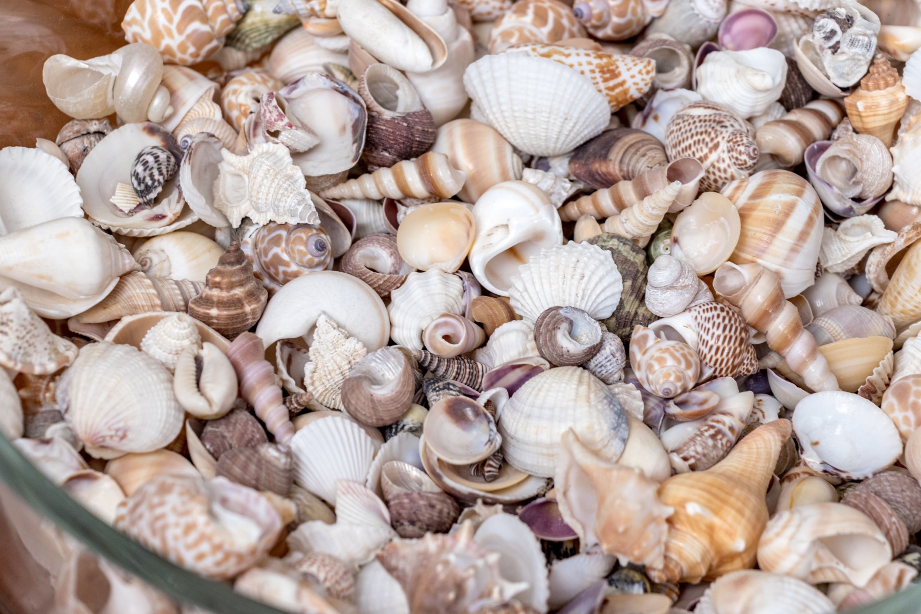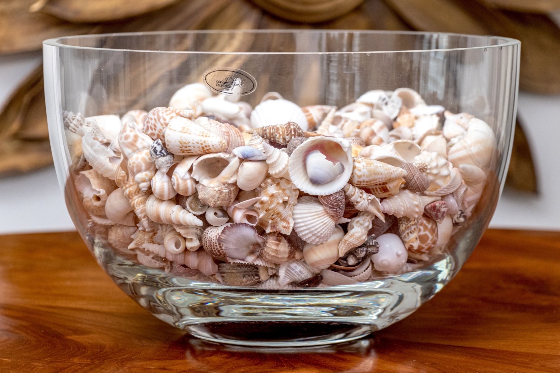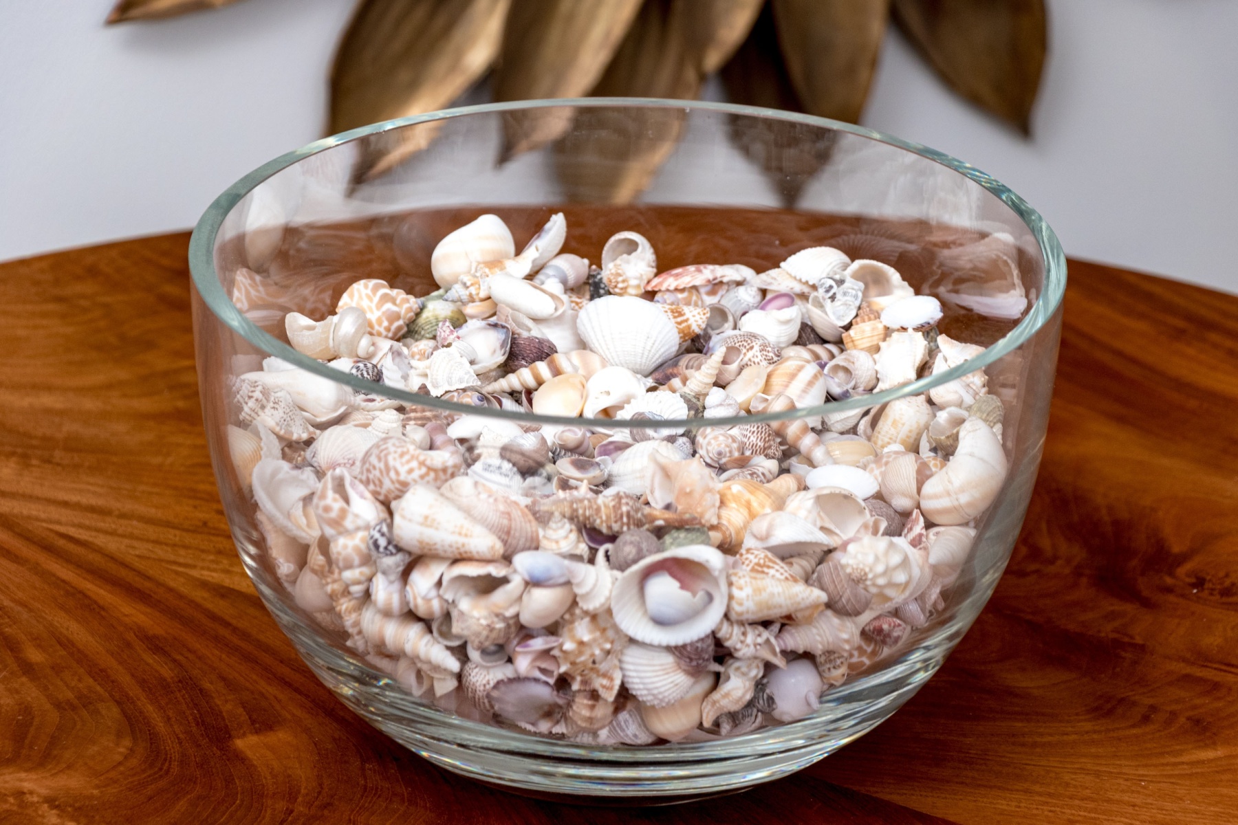 A stylish Carole Stupell glass centerpiece bowl with a large, sleek rounded form leading to a thick bottom that catches the light beautifully. The bowl is filled with a vast collection of seashells in various shapes and textures incorporating pops of orange, brown, and purple with great decorative flair.