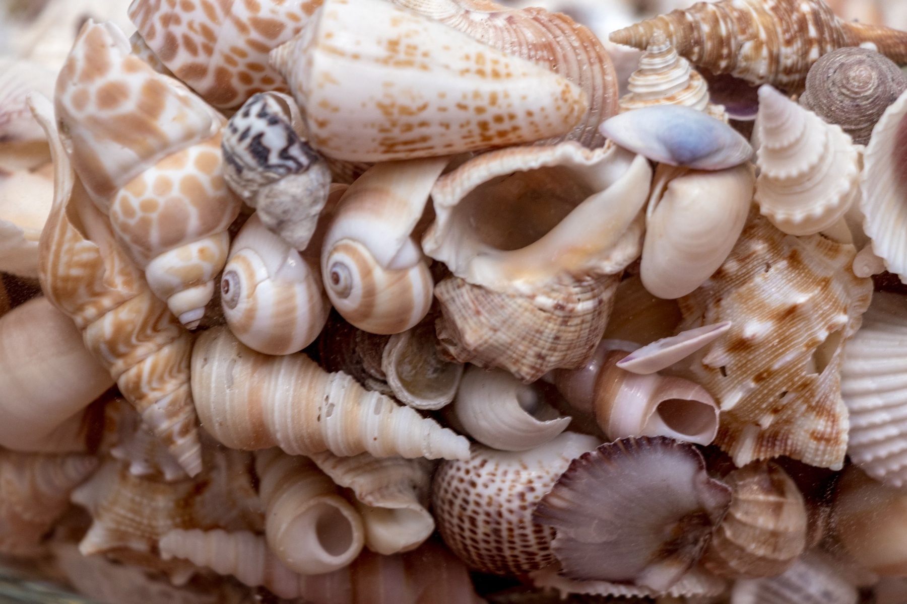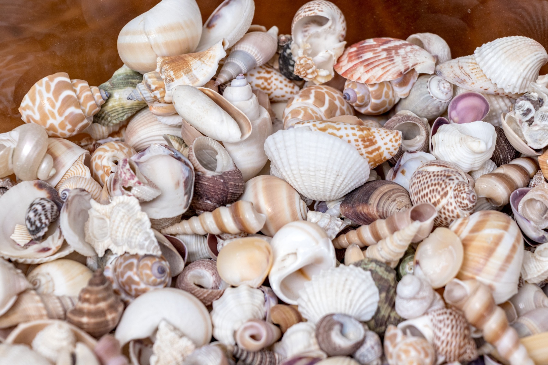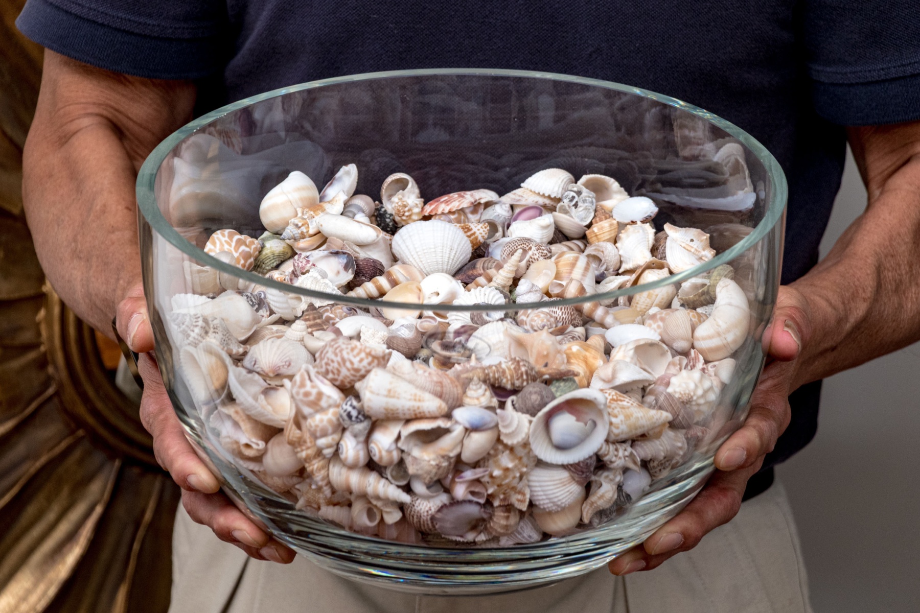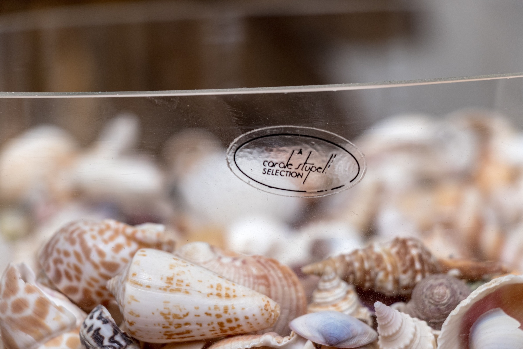 A stylish Carole Stupell glass centerpiece bowl with a large, sleek rounded form leading to a thick bottom that catches the light beautifully. The bowl is filled with a vast collection of seashells in various shapes and textures incorporating pops of orange, brown, and purple with great decorative flair.