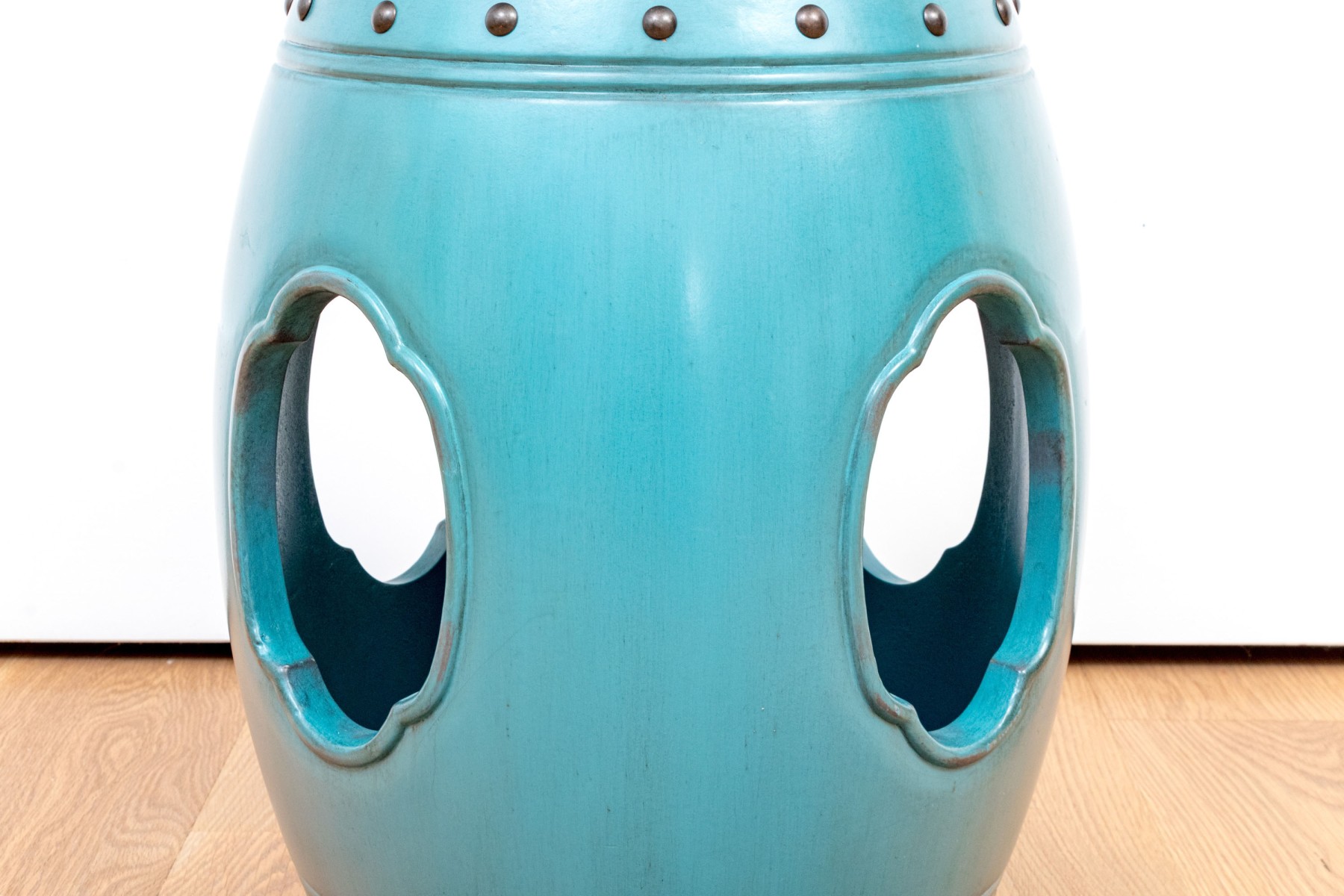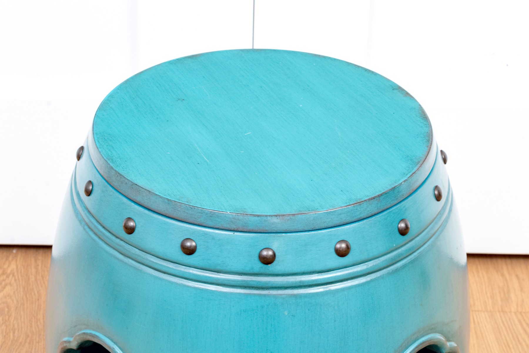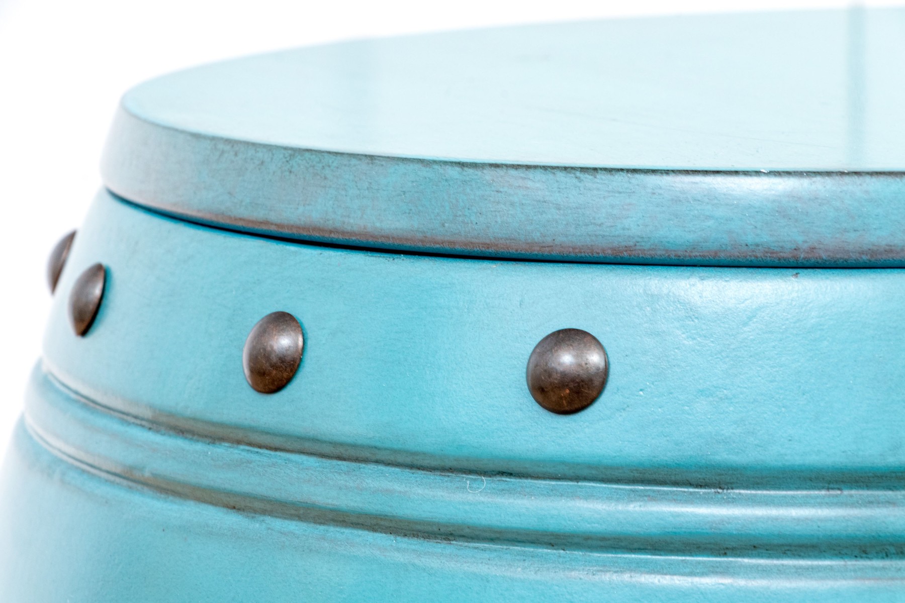 Classically formed garden stool in a vibrant blue-green finish with metallic embossed trim band seen just below the top.