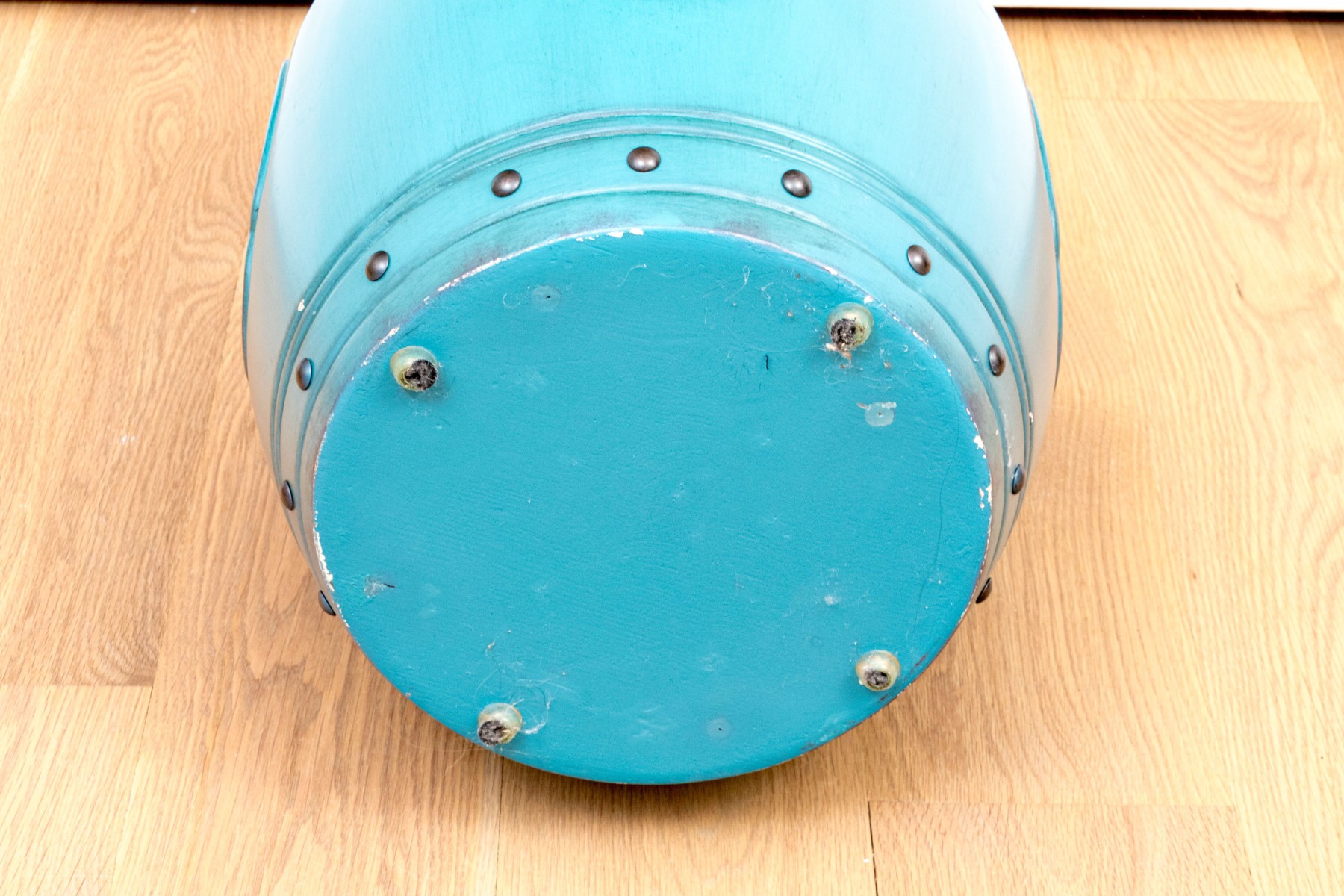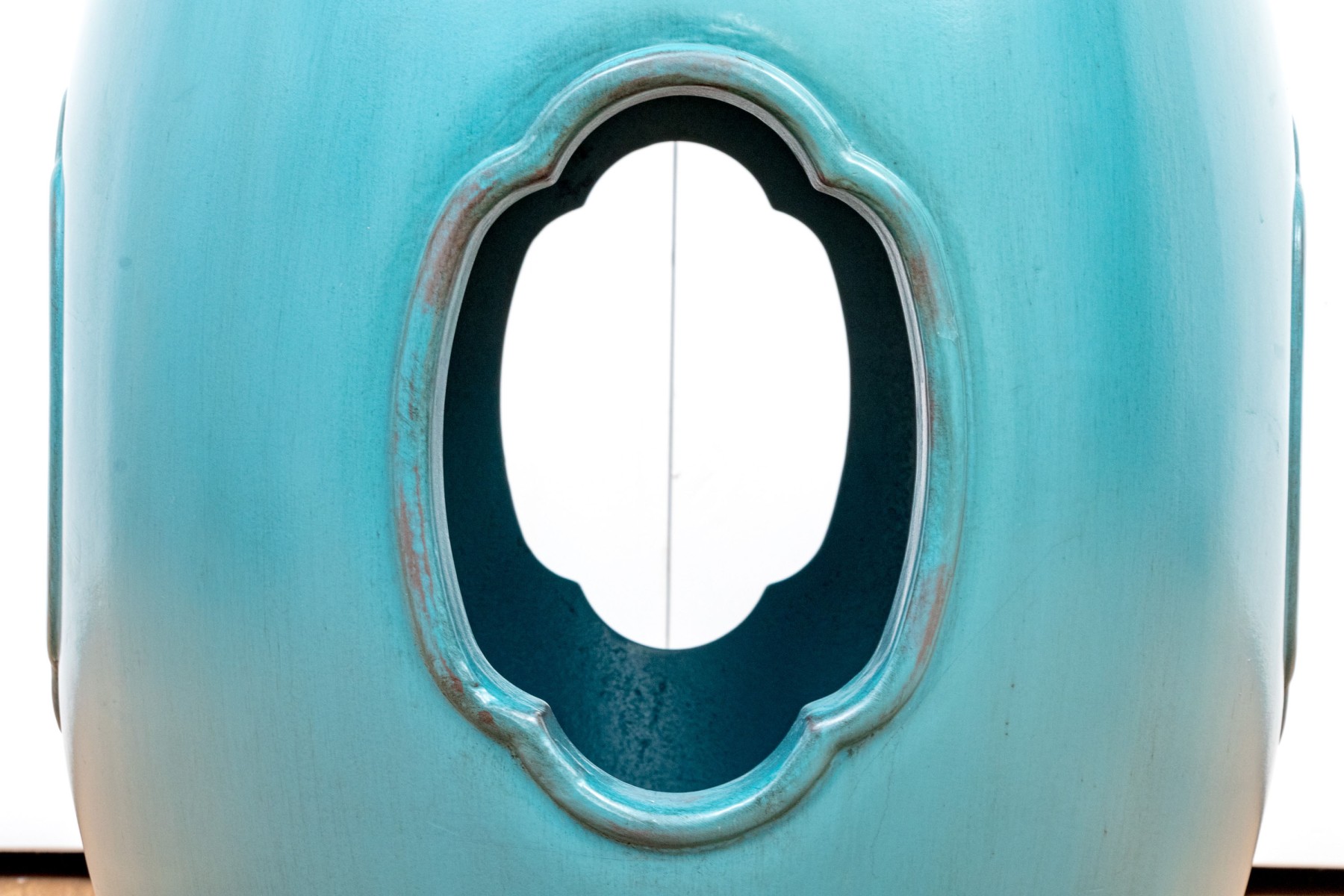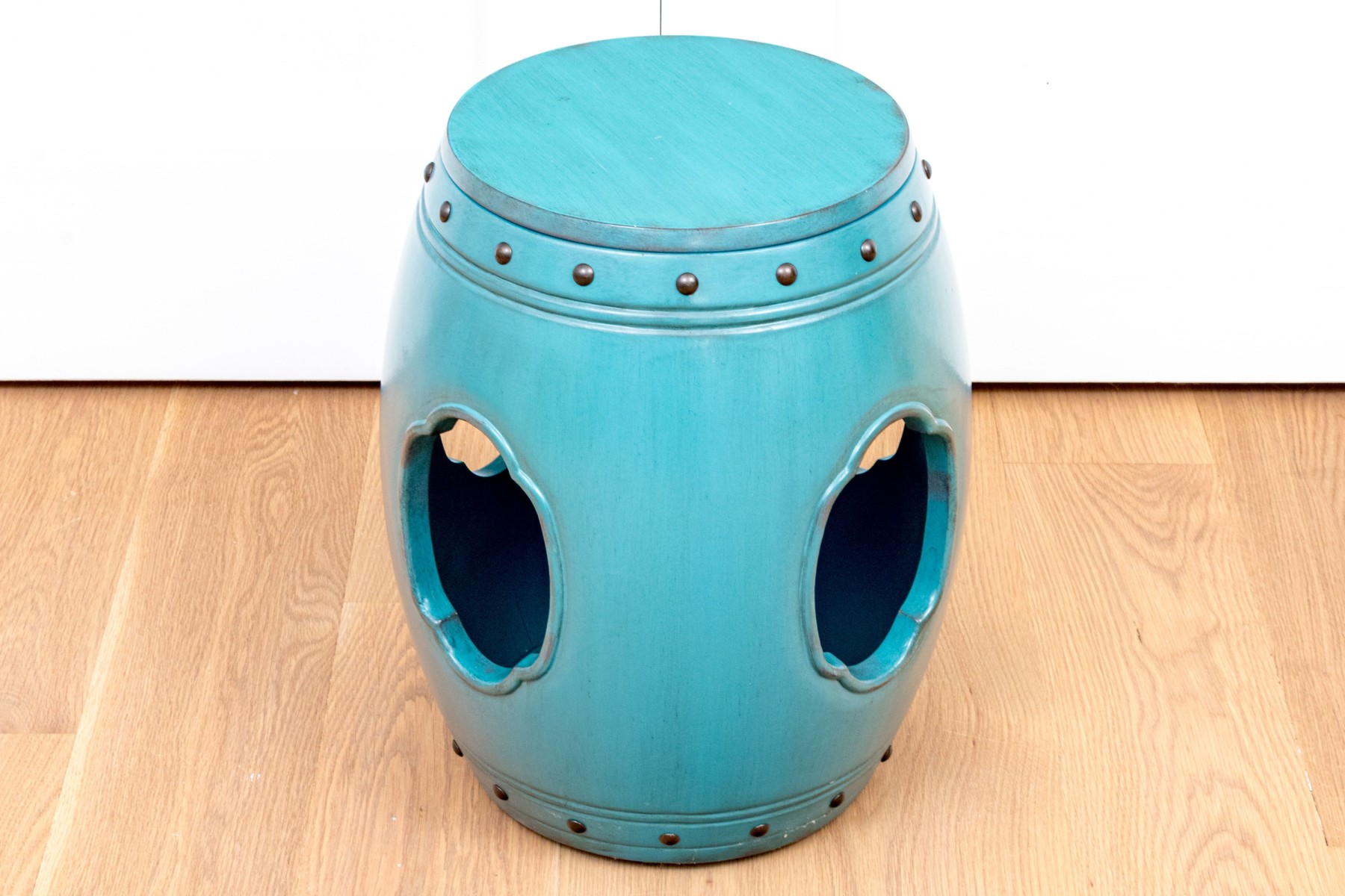 Classically formed garden stool in a vibrant blue-green finish with metallic embossed trim band seen just below the top.