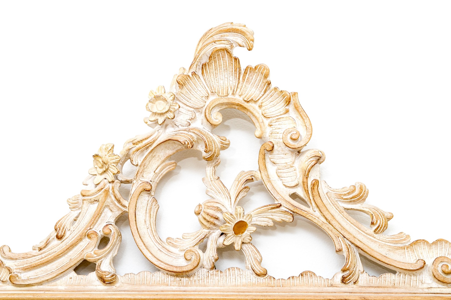 A beveled mirror plate to the center with wonderfully carved and formed wood and gesso frame with ornate openwork scrolling foliate motifs.