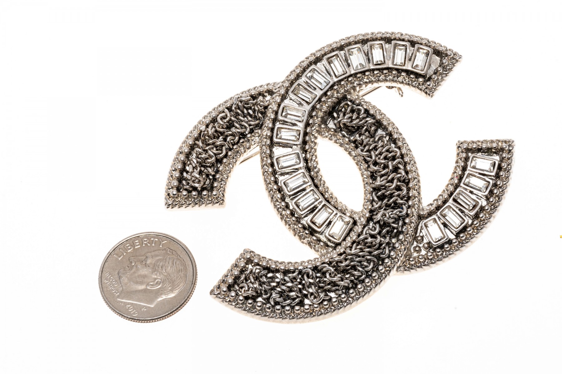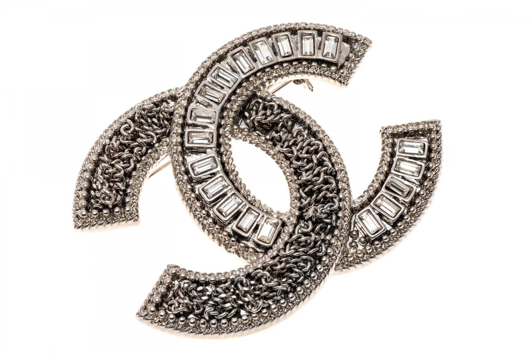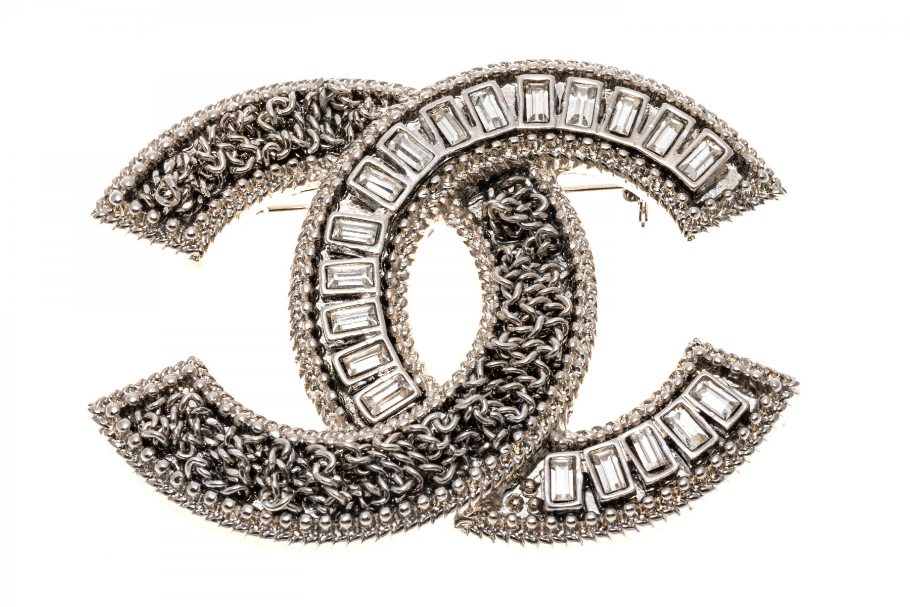 Chanel logo brooch. This shimmering brooch by Chanel has been set with white simulate stones on on 'C' and chains over the other 'C'.