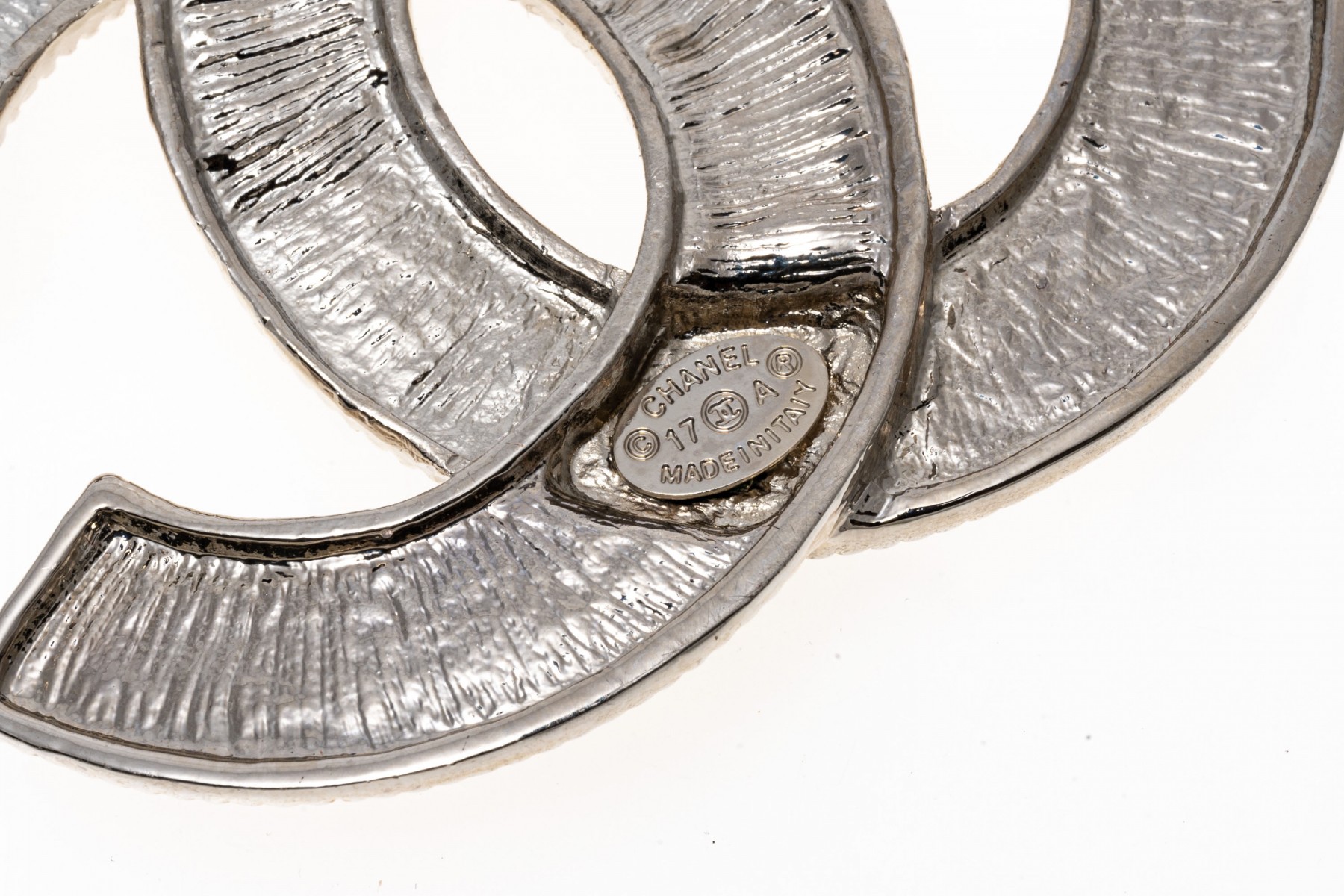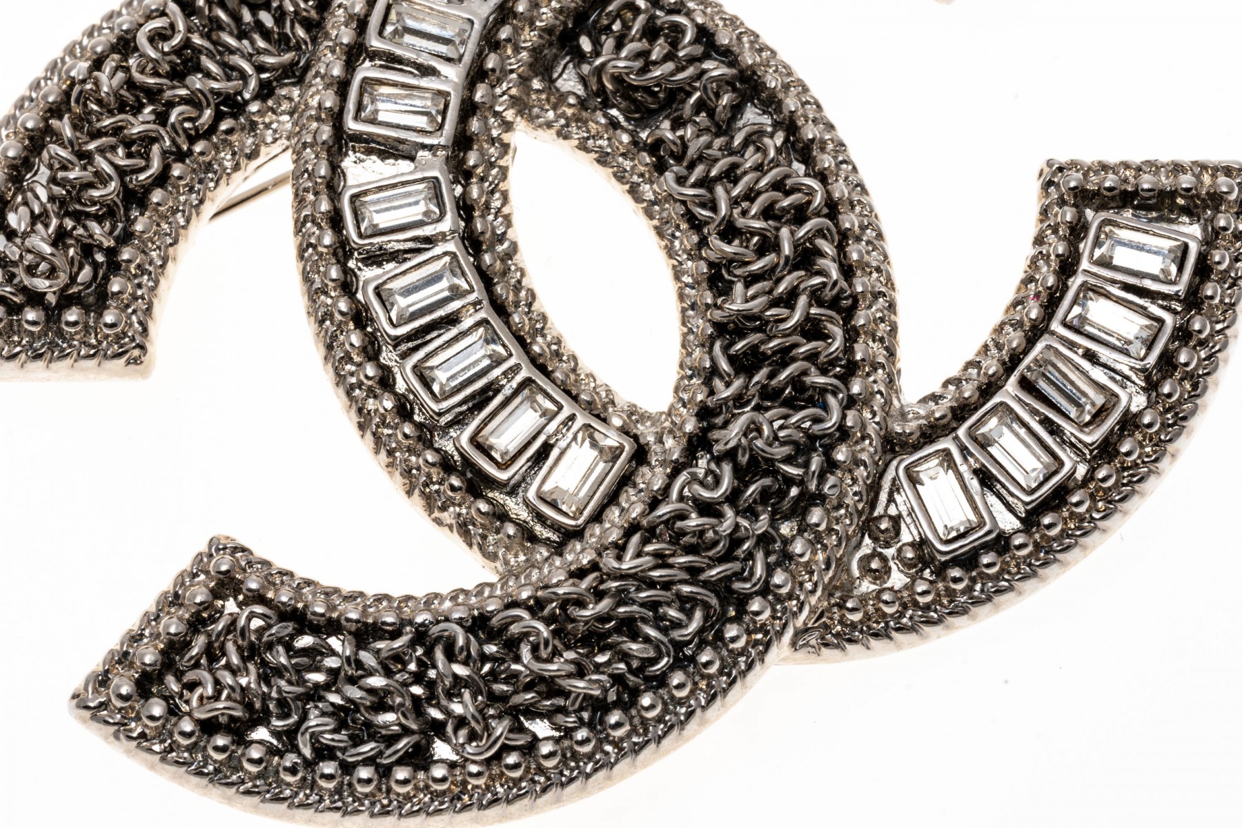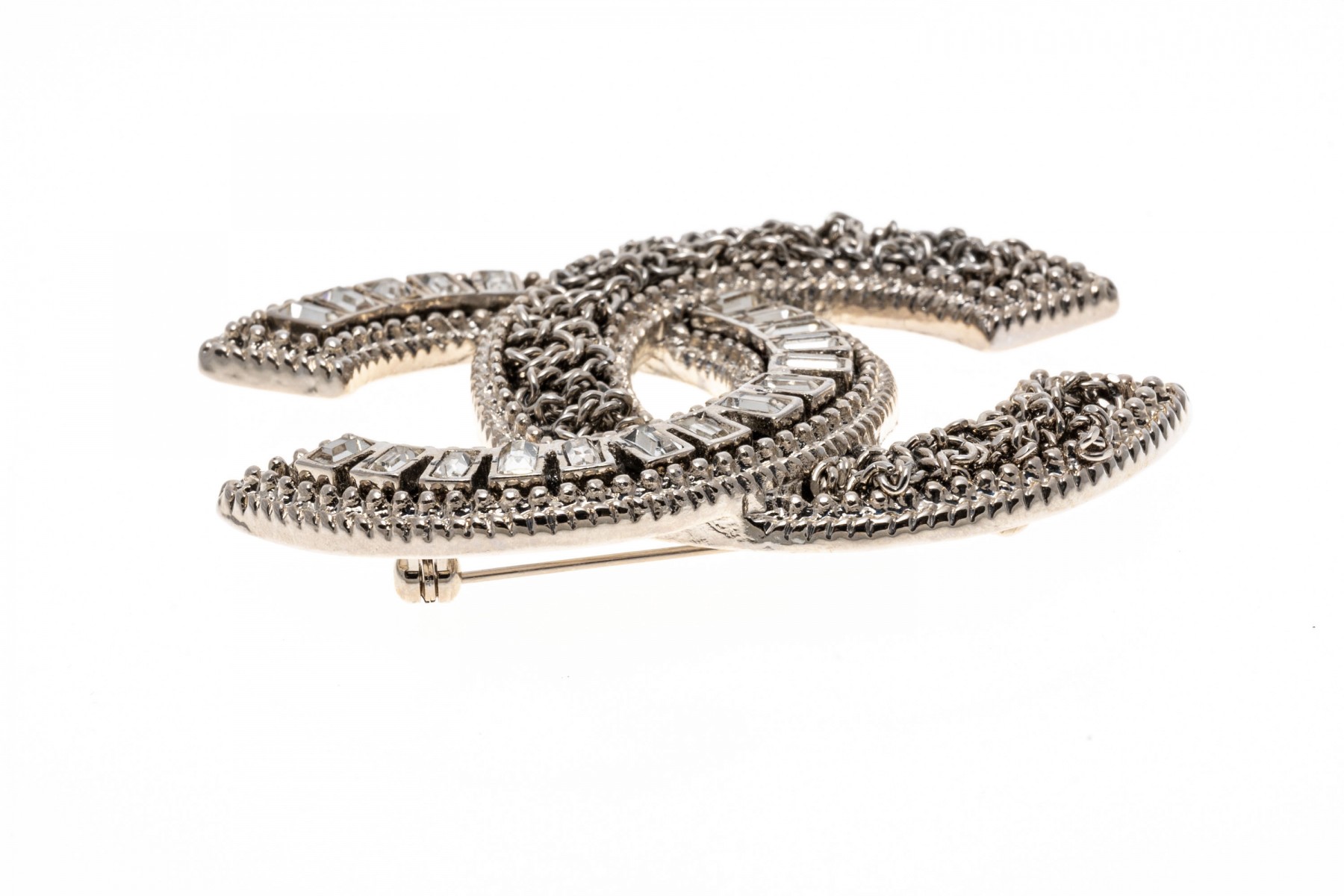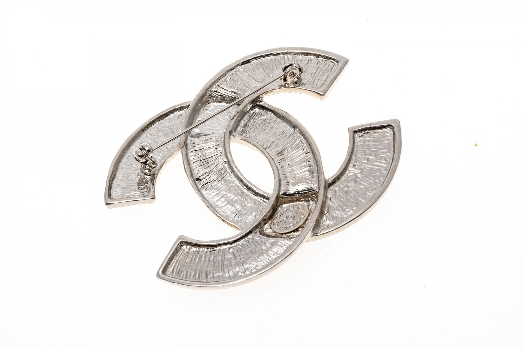 Chanel logo brooch. This shimmering brooch by Chanel has been set with white simulate stones on on 'C' and chains over the other 'C'.