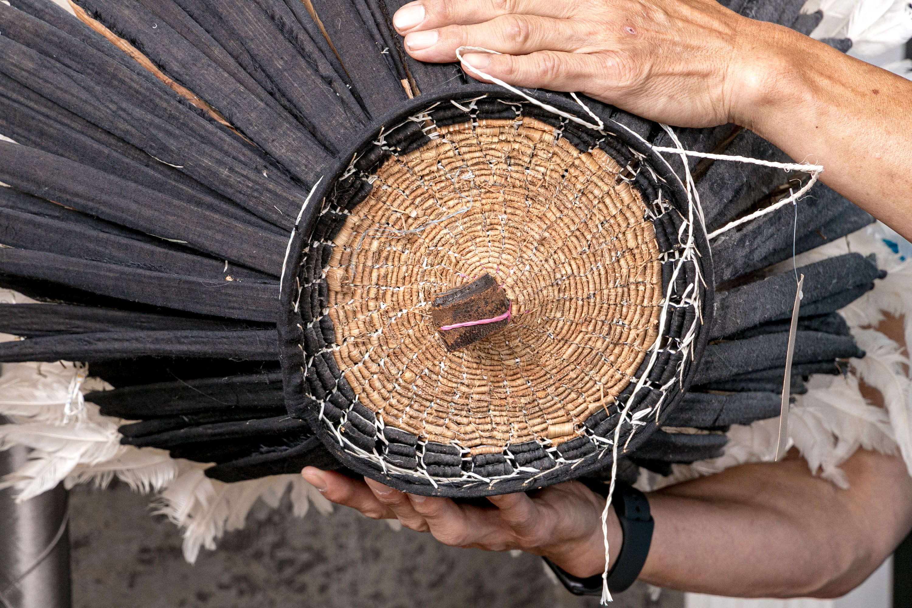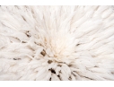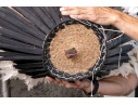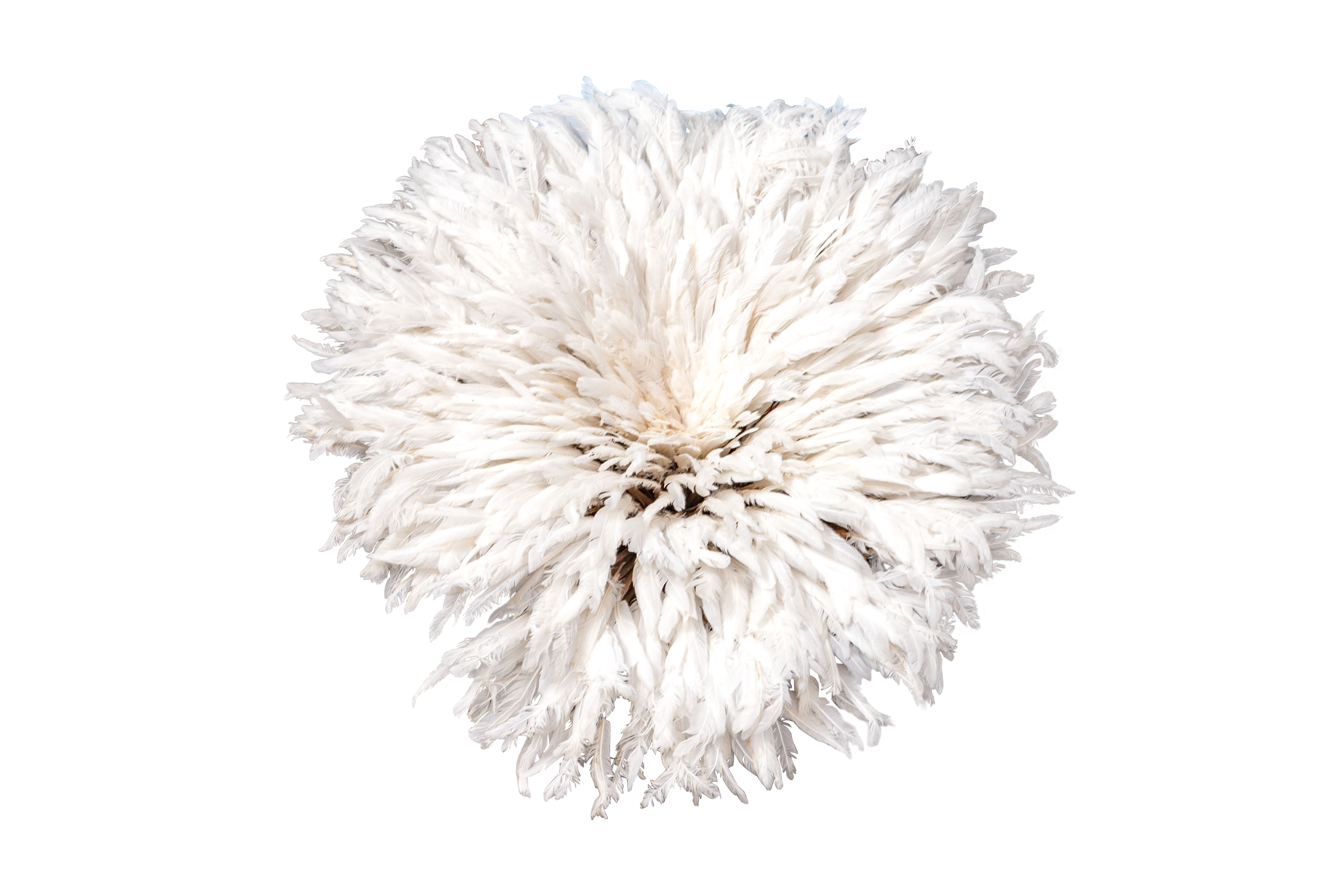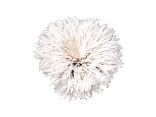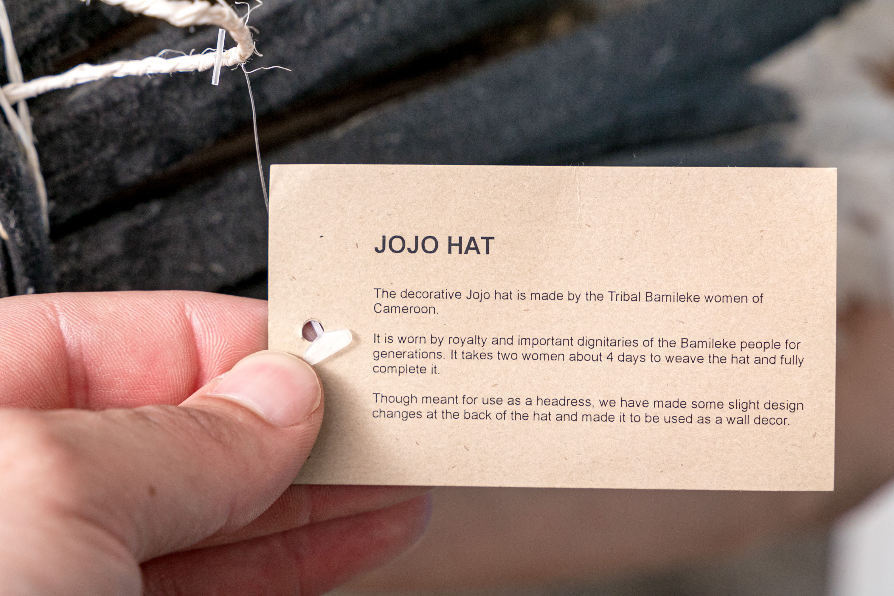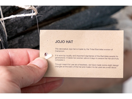 Made in Cameroon, a Juju hat "is made by the Tribal Bamileke women of Cameroon. It is worn by royalty and important dignitaries of the Bamileke people for generations. It takes two women about 4 days to weave the hat and fully complete it. The current hat was modified in design to be used as decoration for the wall or ceiling, mounted with a loop underfoot to be used for hanging.