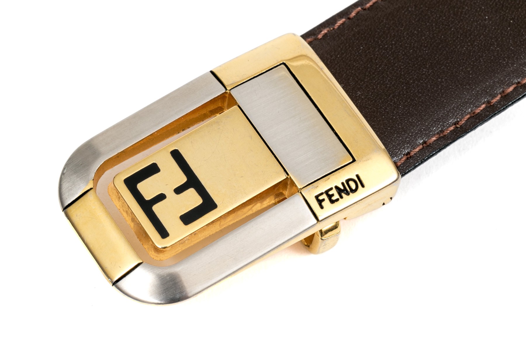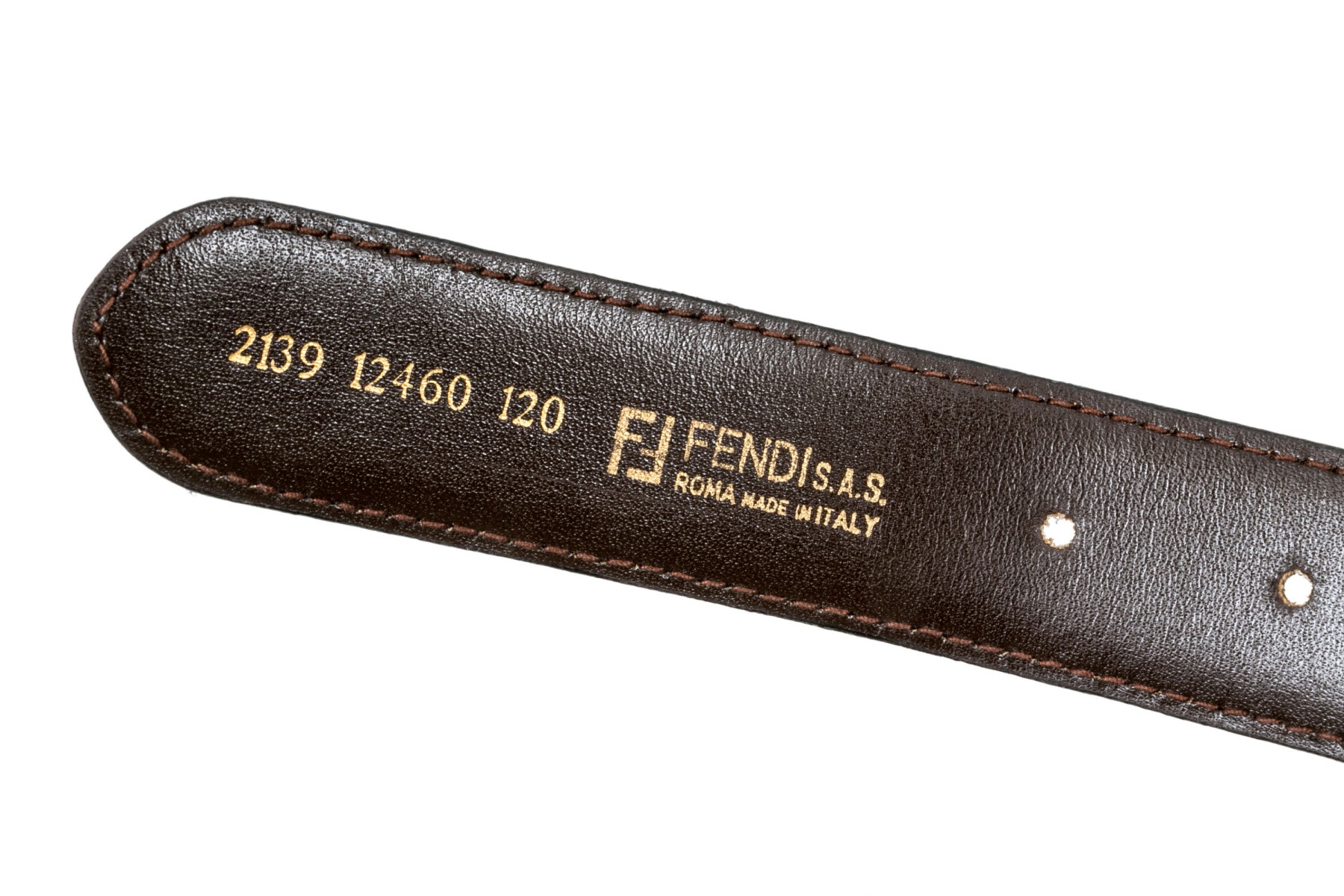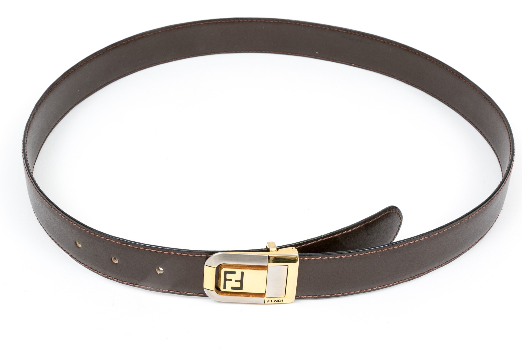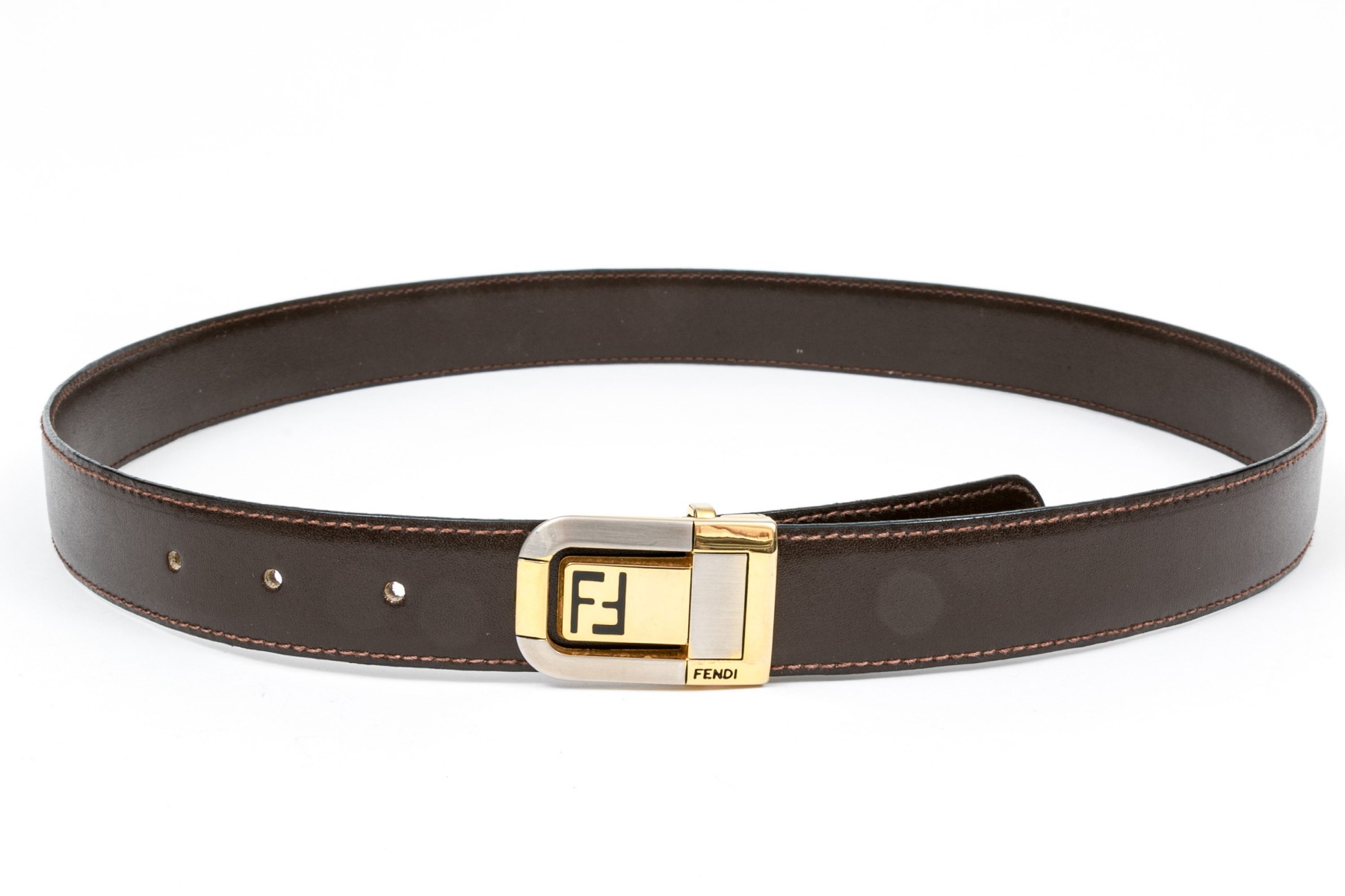 Brown leather belt by Fendi. Gold-toned belt buckle.