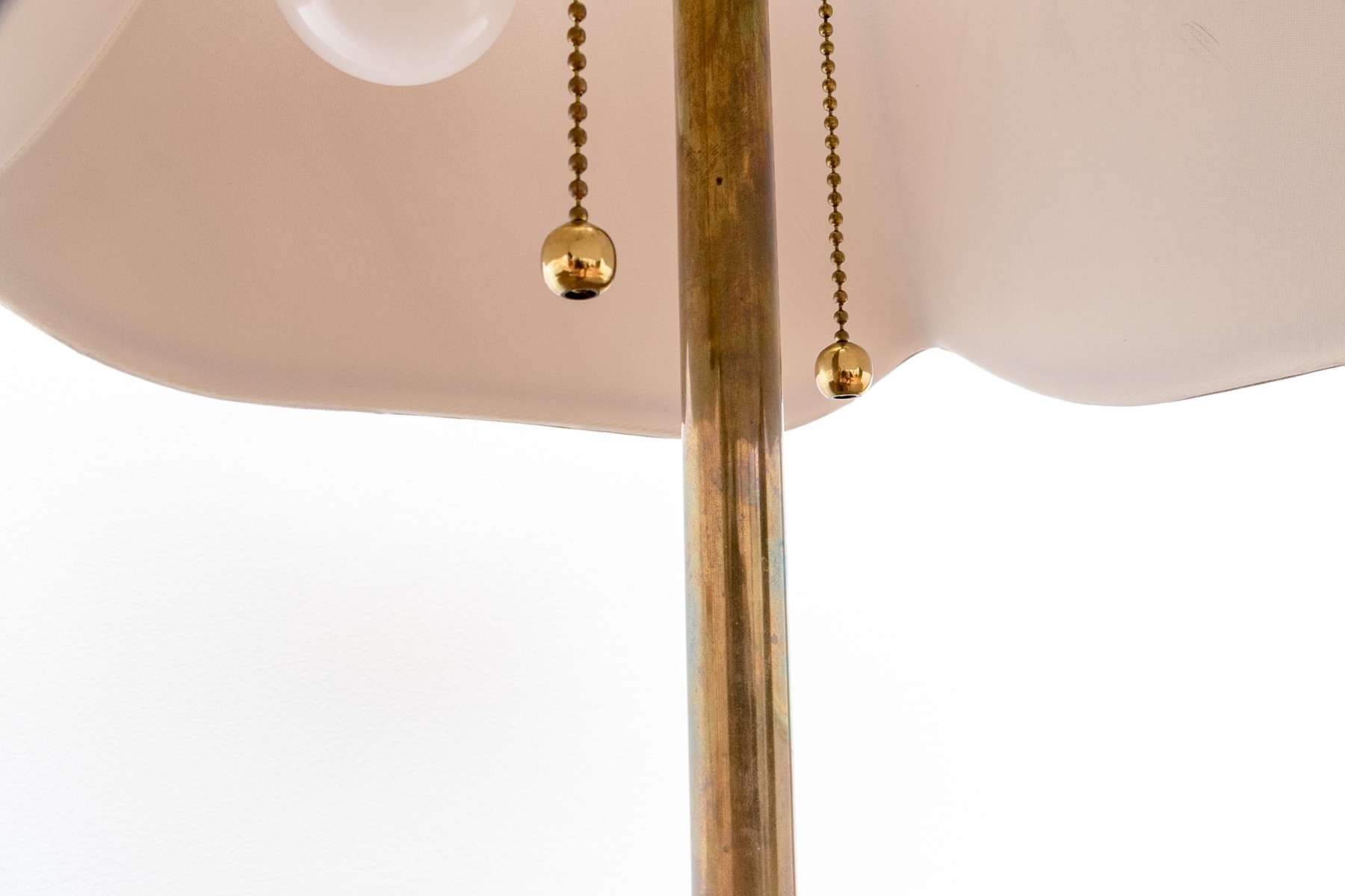 leading to a circular pedestal foot on a square black marble base. Surmounted by an elegant cream-beige silk shade with a serpentine bell form and a complementing foliate finial at the top.