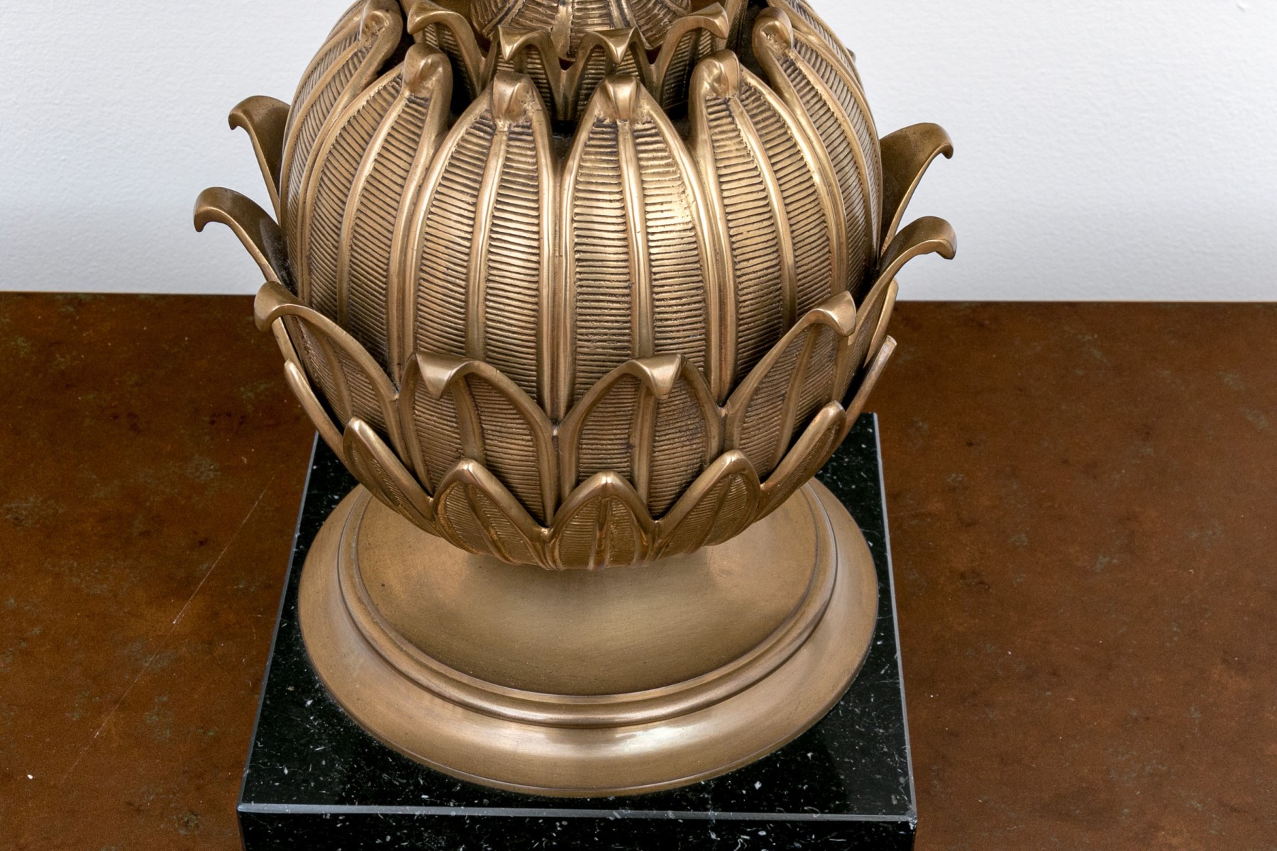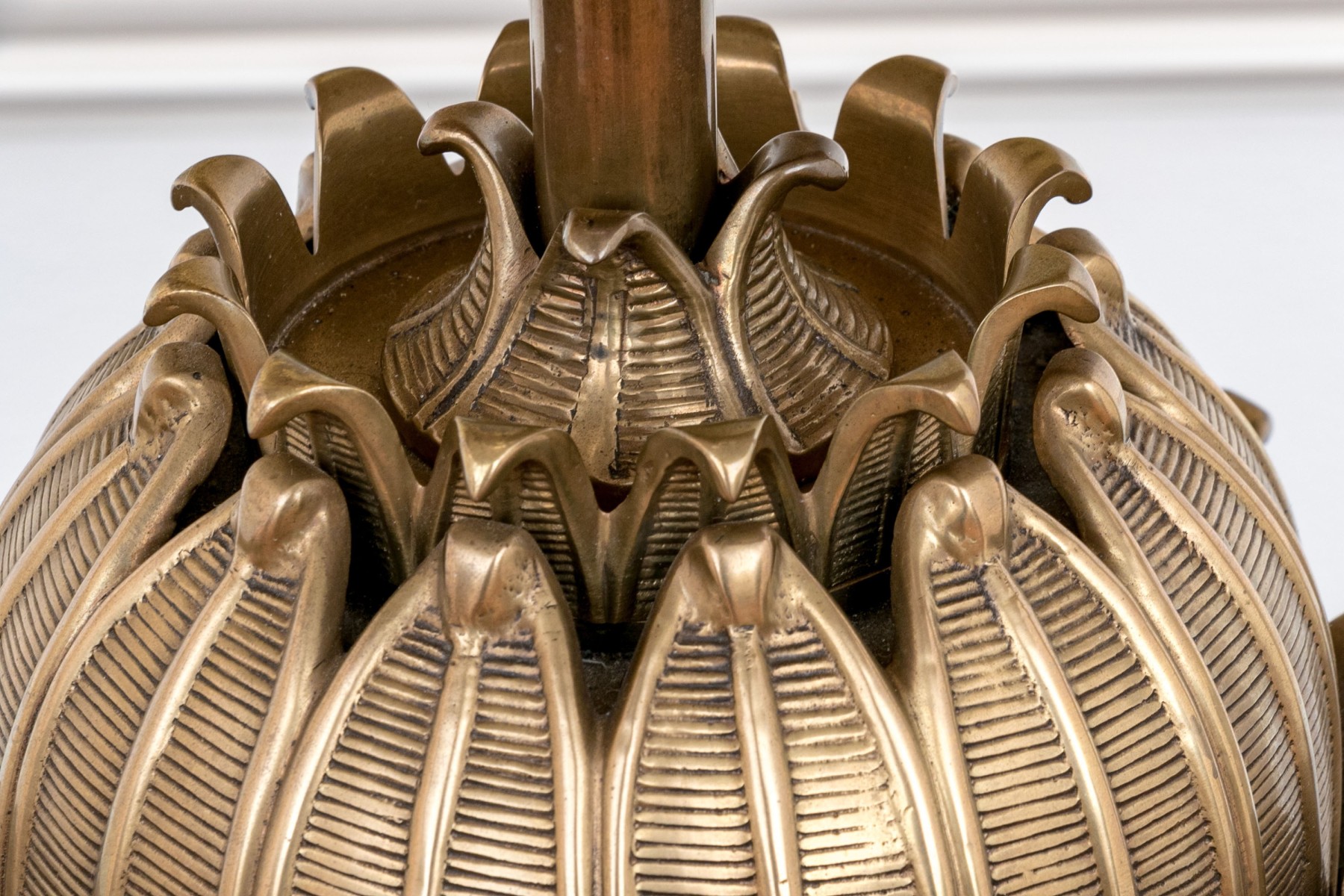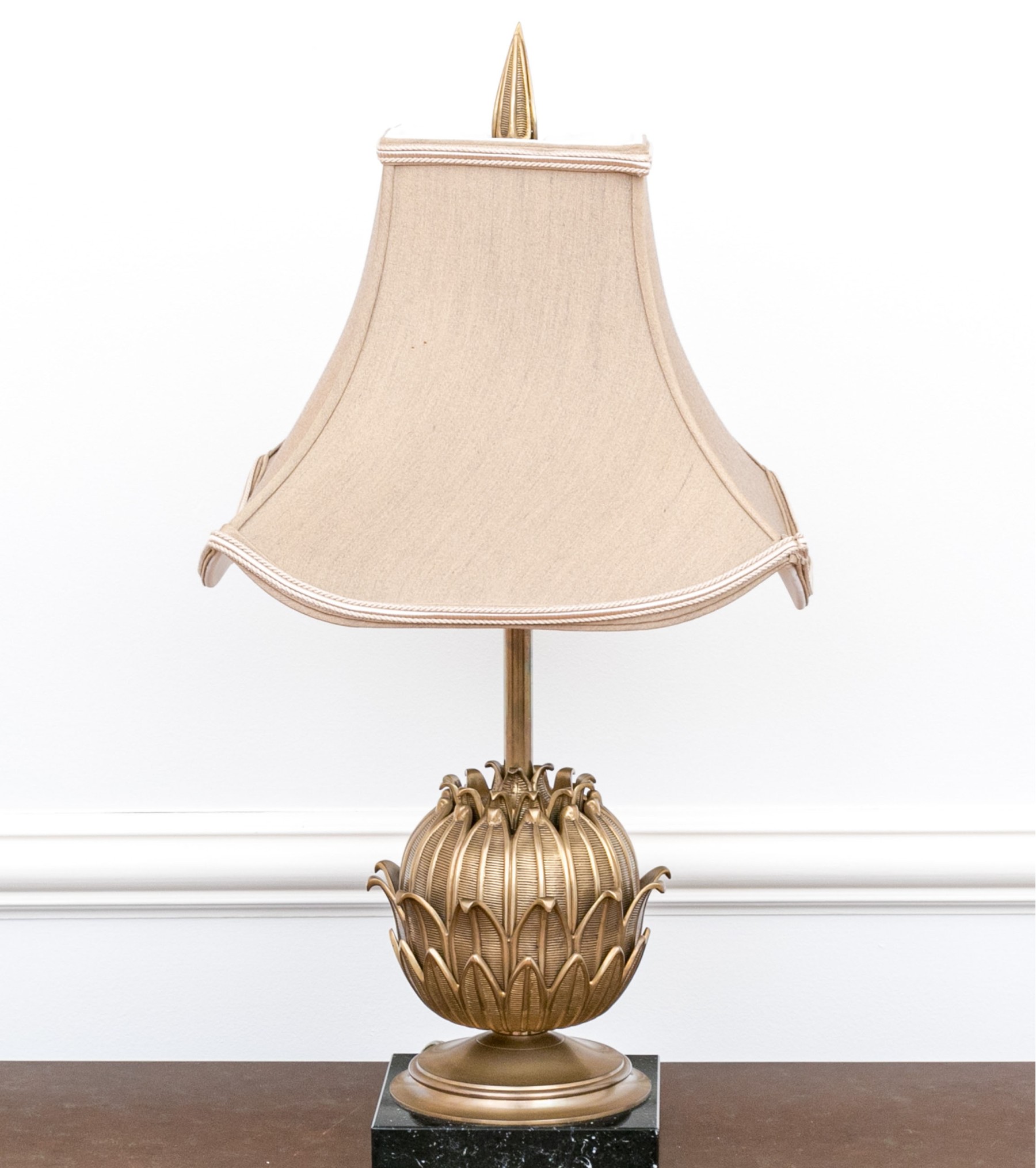 A stylish neoclassical style table lamp featuring a gilt artichoke or lotus motif with detailed tiers of unfurling leaves