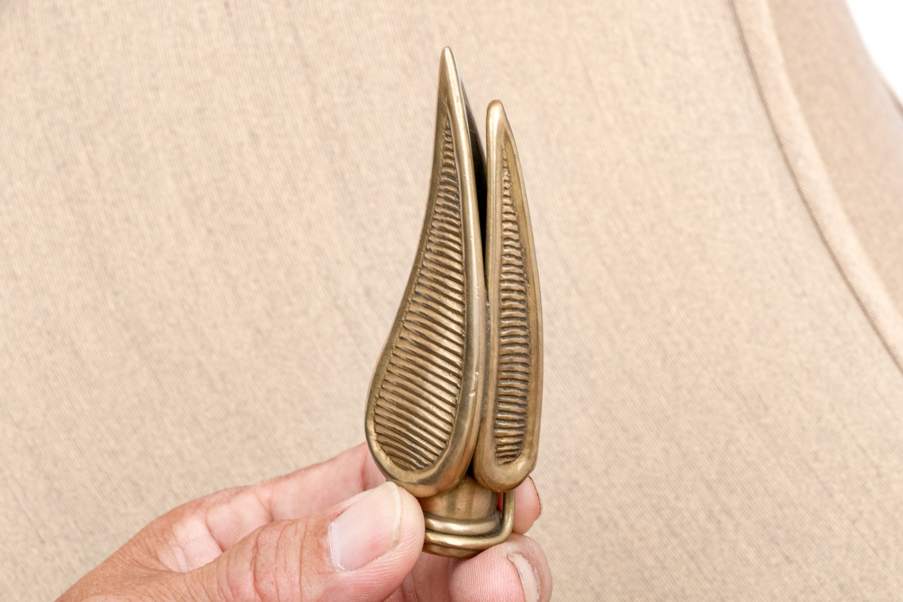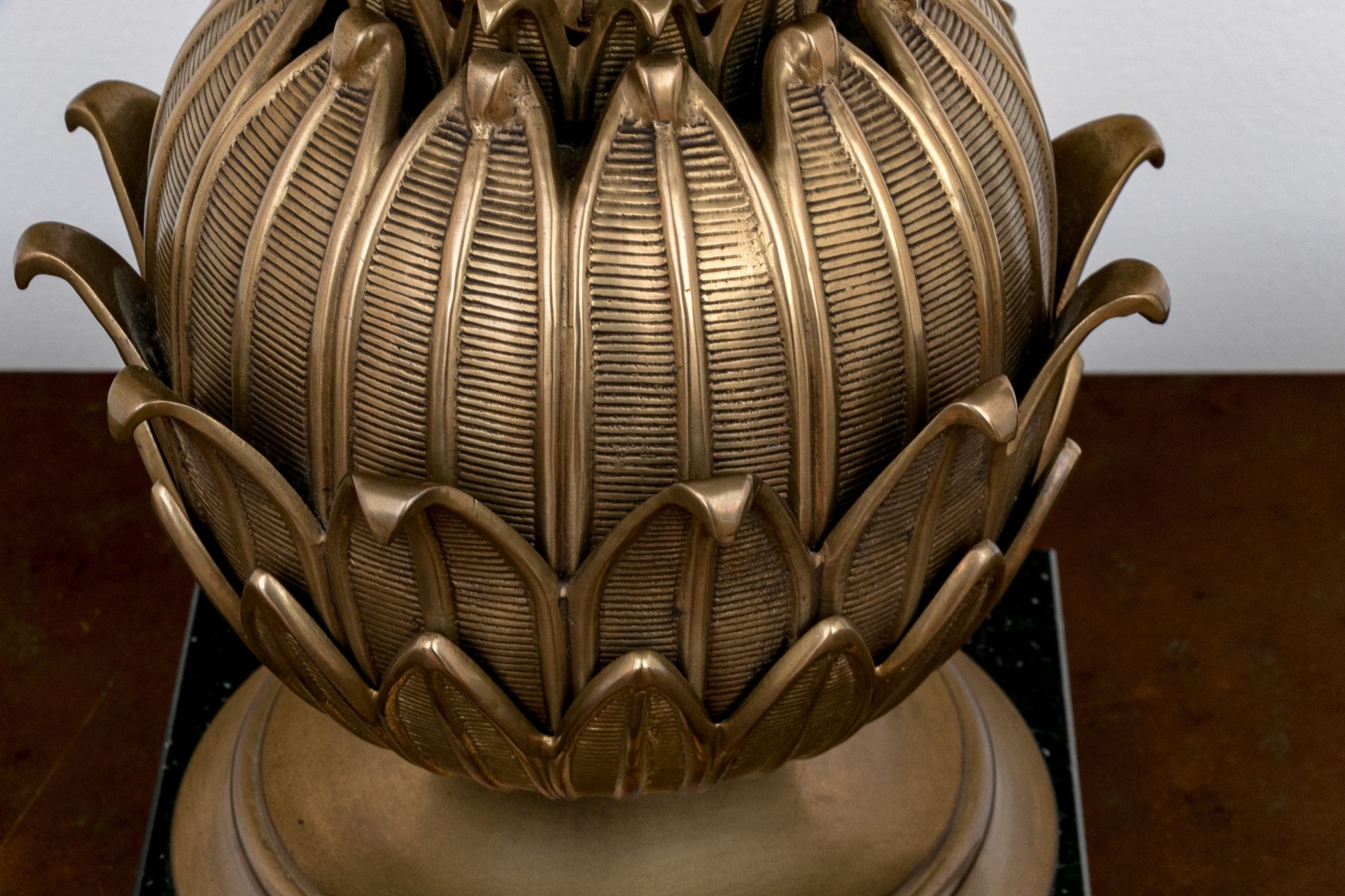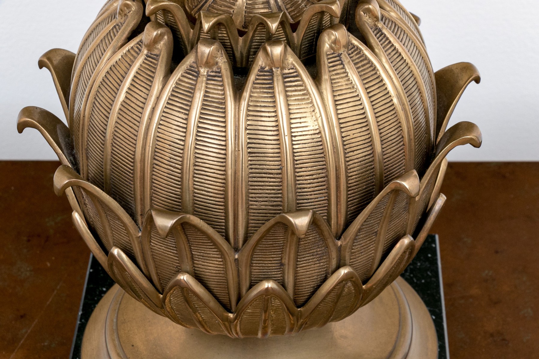 A stylish neoclassical style table lamp featuring a gilt artichoke or lotus motif with detailed tiers of unfurling leaves