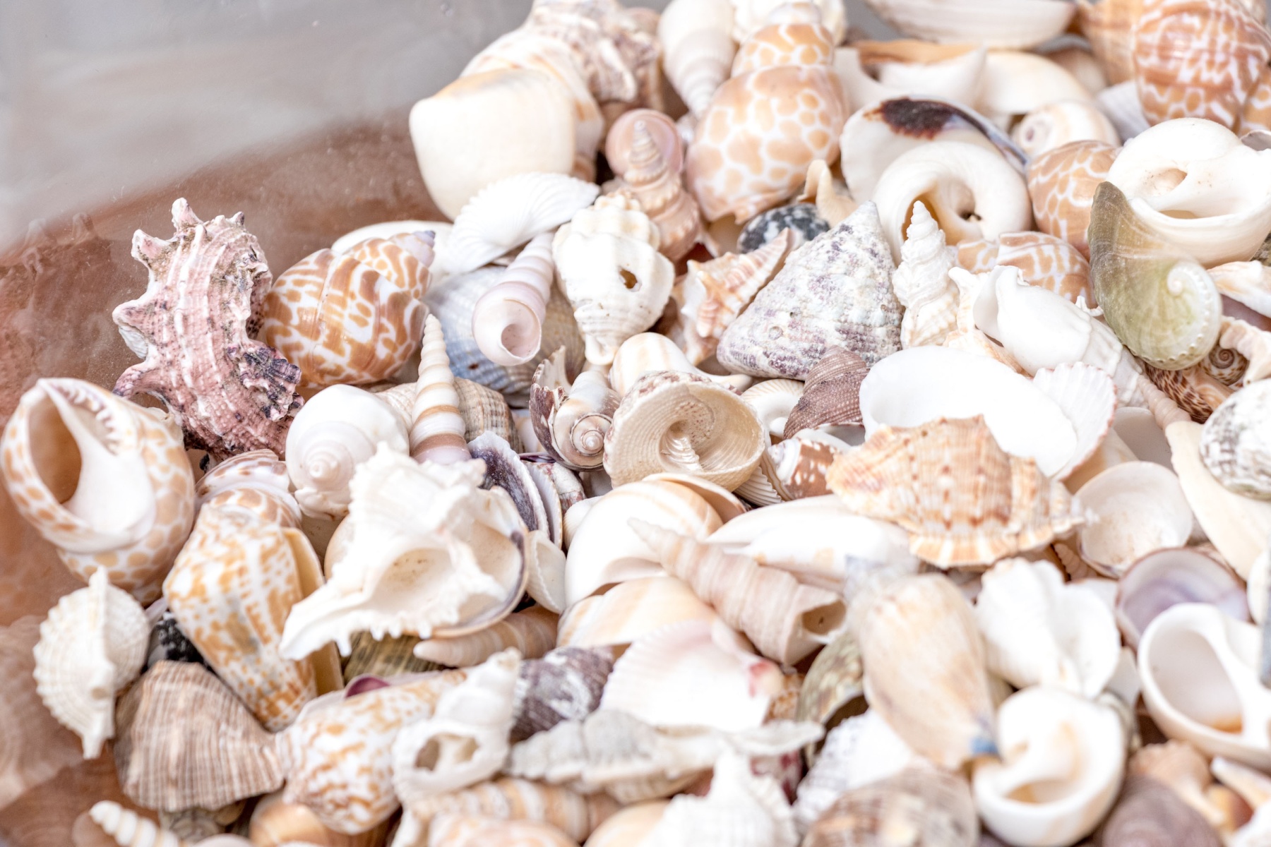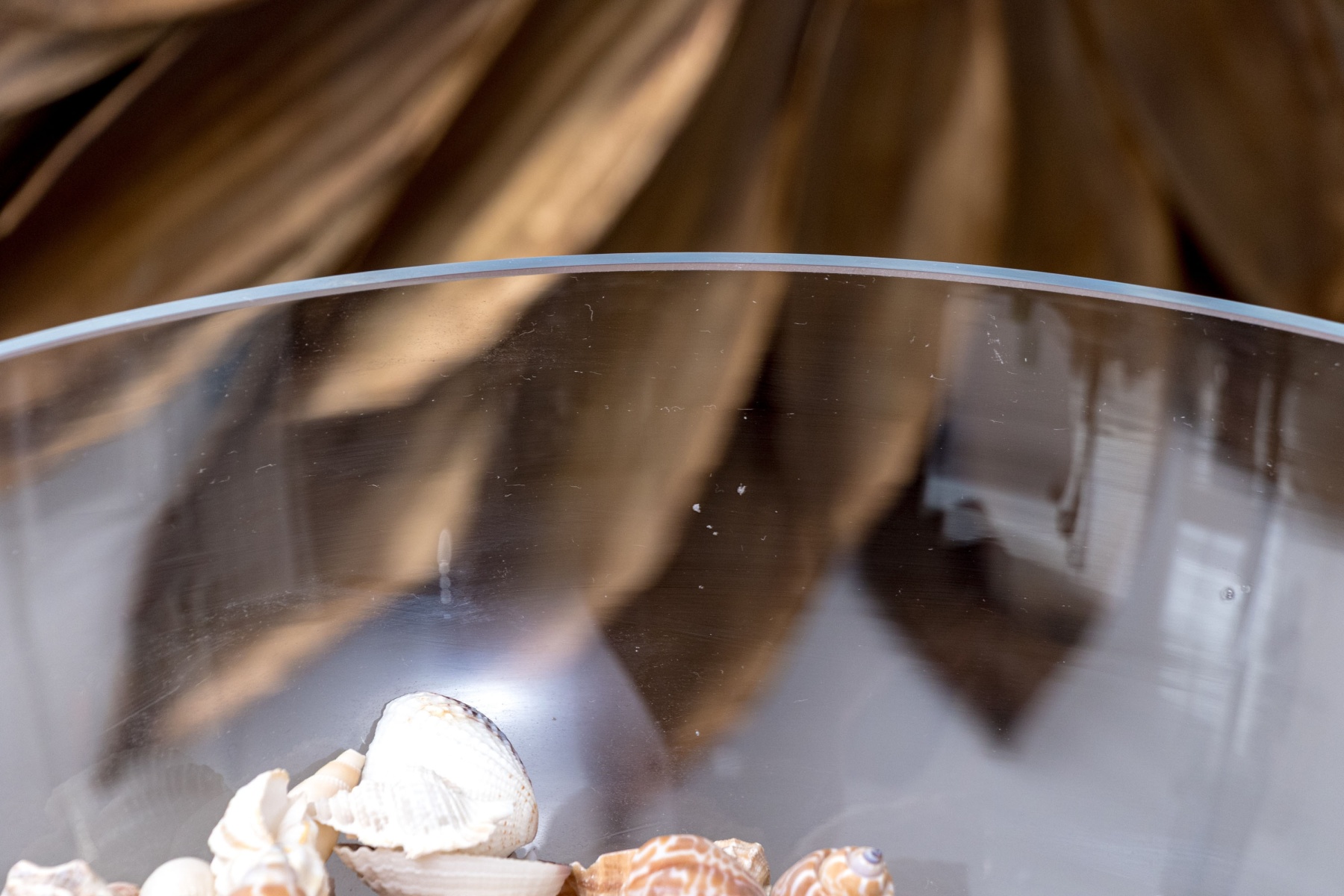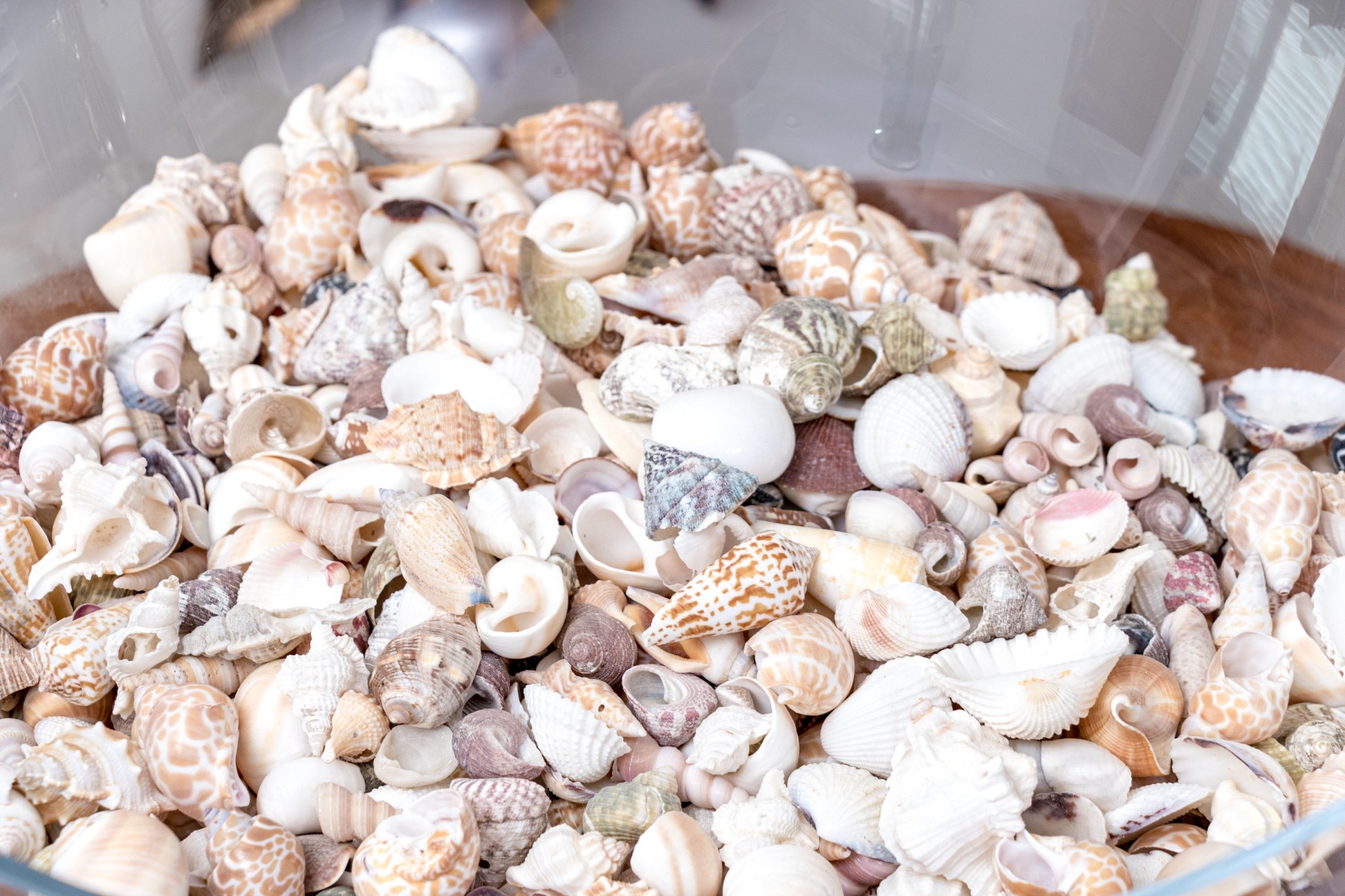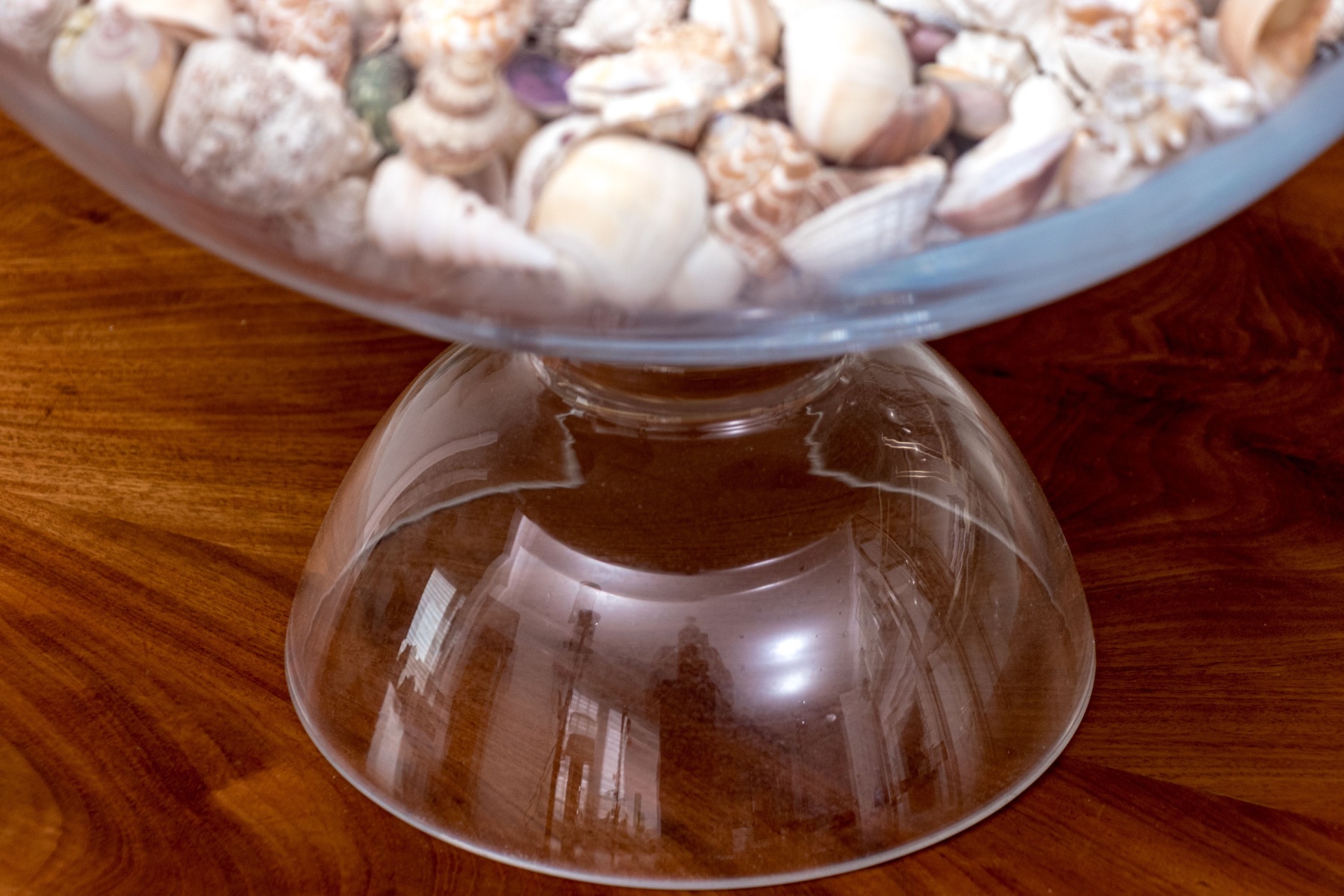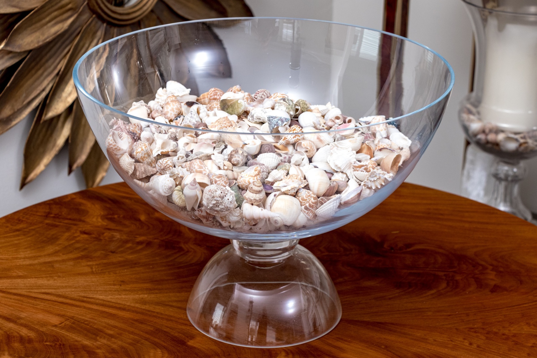 A chic glass centerpiece bowl with a minimalist design and impactful presence, showcasing a large rounded bowl on a short pedestal finishing with a high domed circular foot. The bowl is filled with a vast collection of seashells in various shapes and textures incorporating pops of orange, brown, and purple with great decorative flair.
