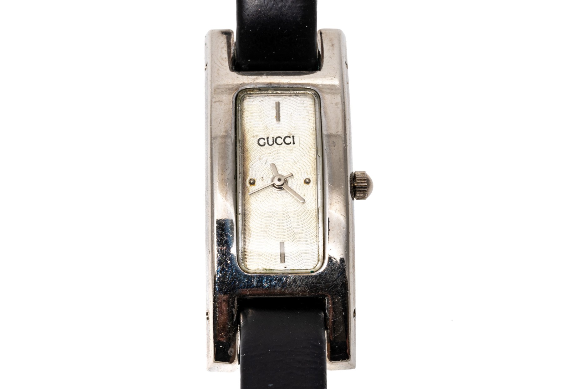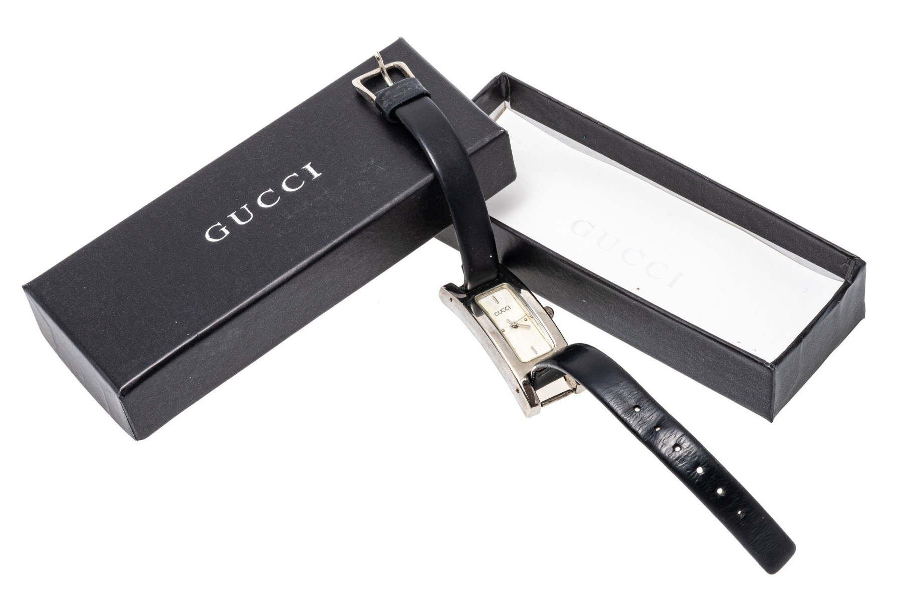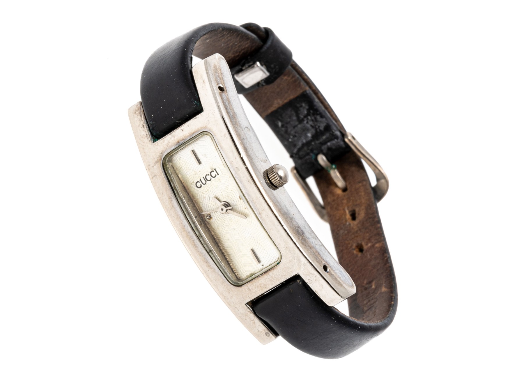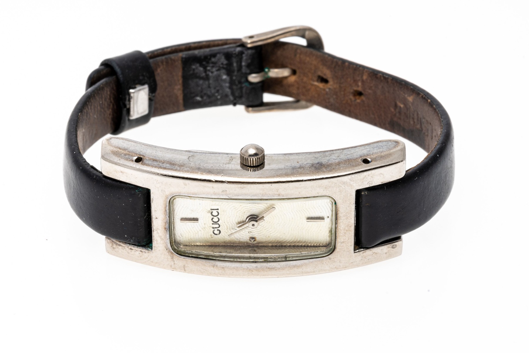 Gucci quartz watch. The watch has a elongated rectangular dial with brushed dial and stick indices. Hour, minute and second hands. Black leather strap with buckle clasp