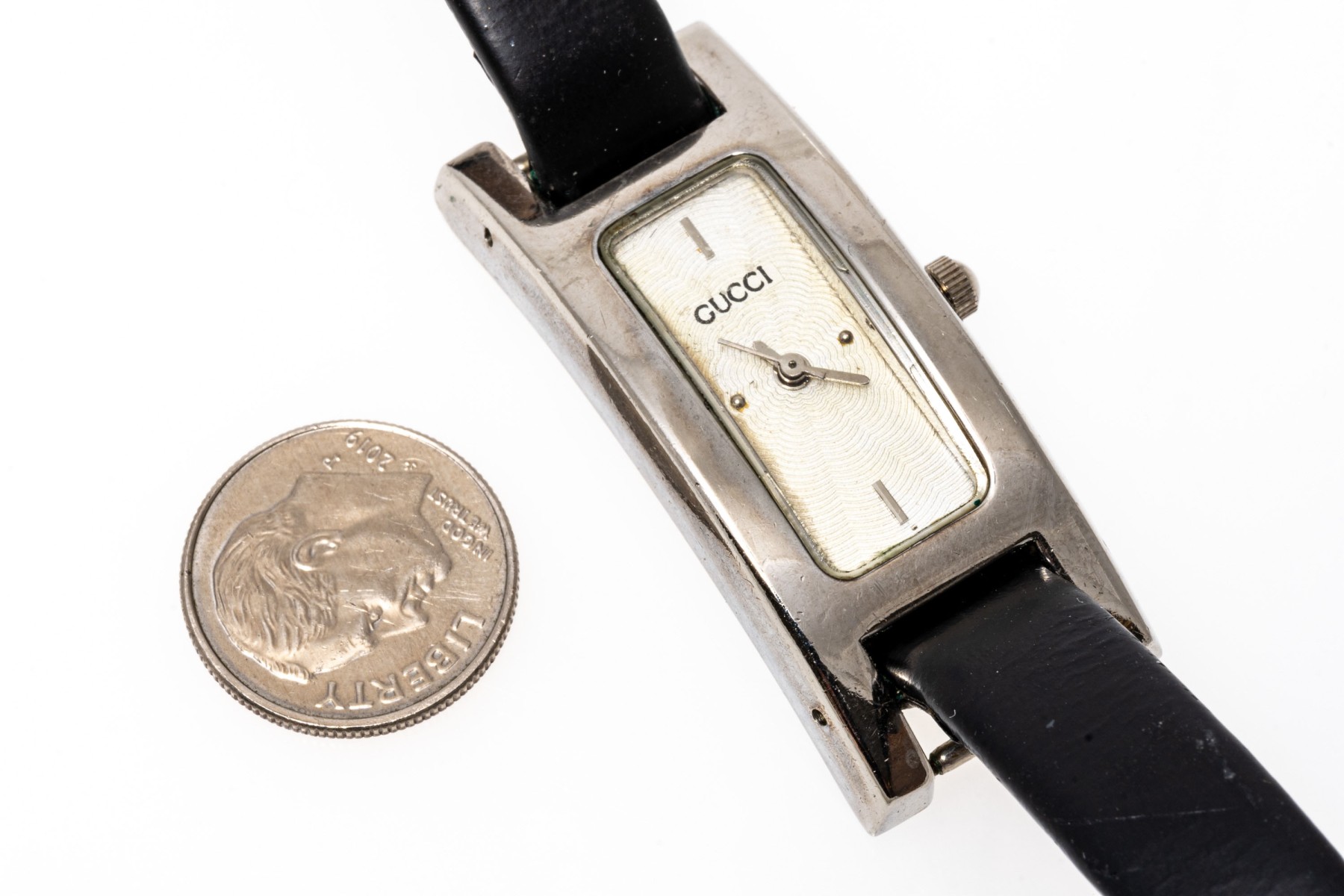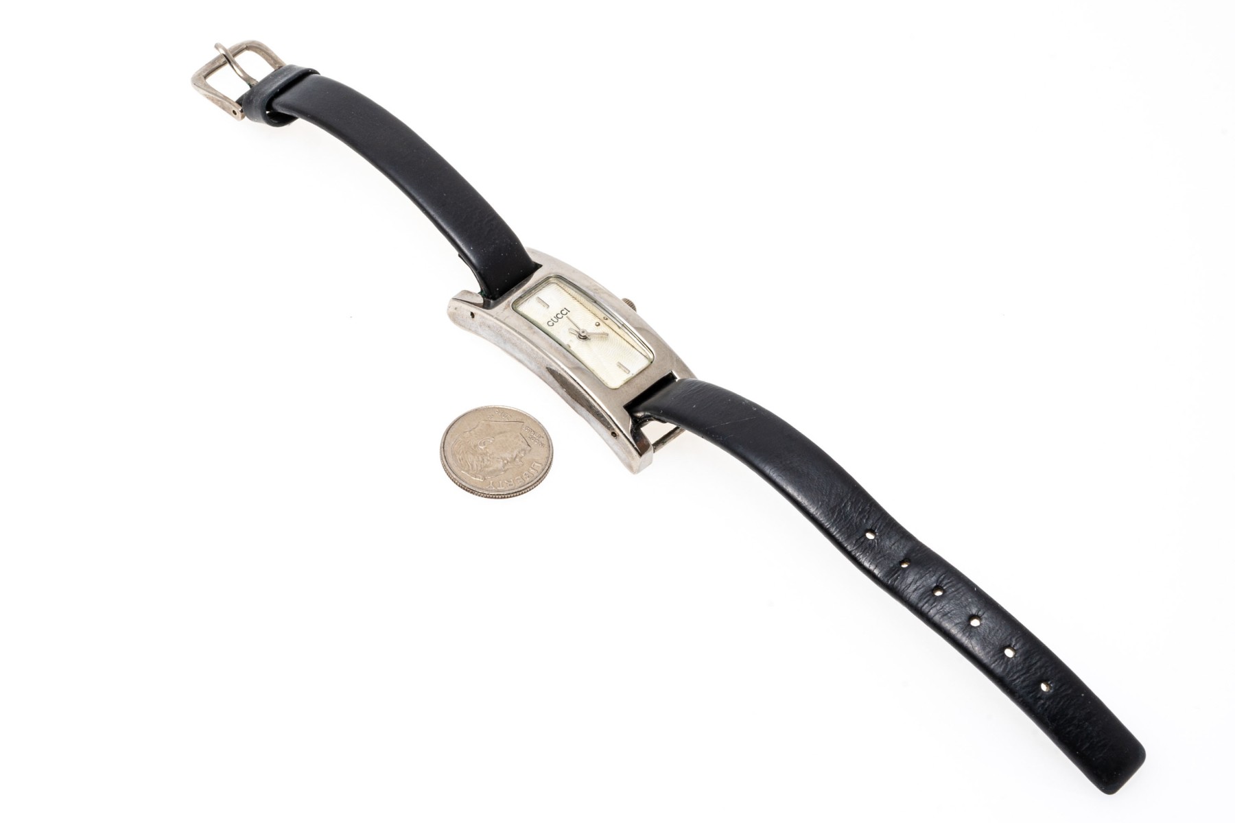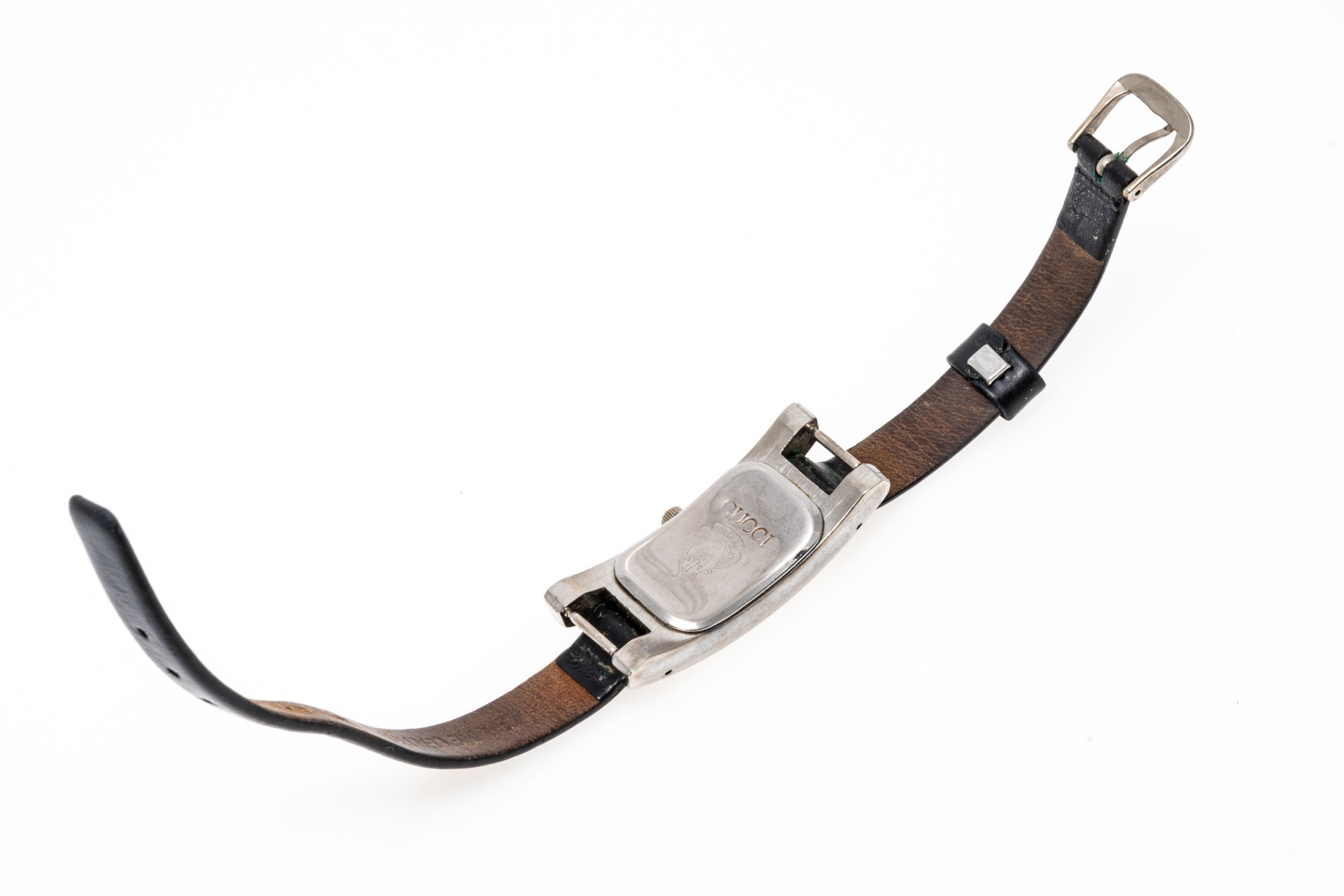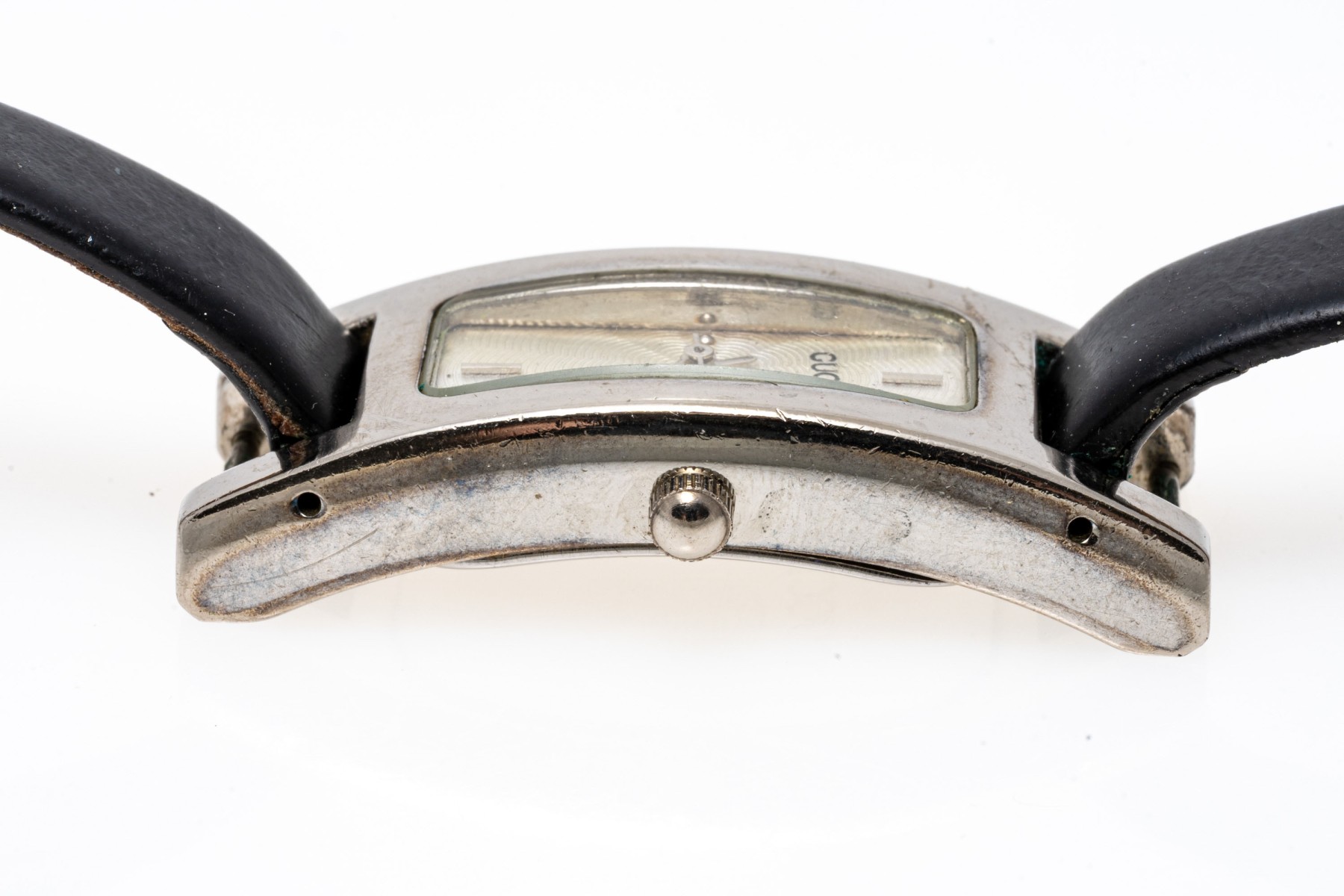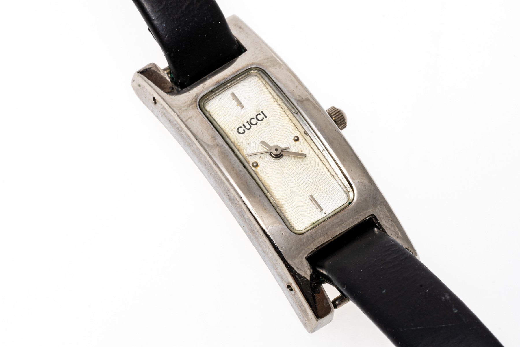 Gucci quartz watch. The watch has a elongated rectangular dial with brushed dial and stick indices. Hour, minute and second hands. Black leather strap with buckle clasp