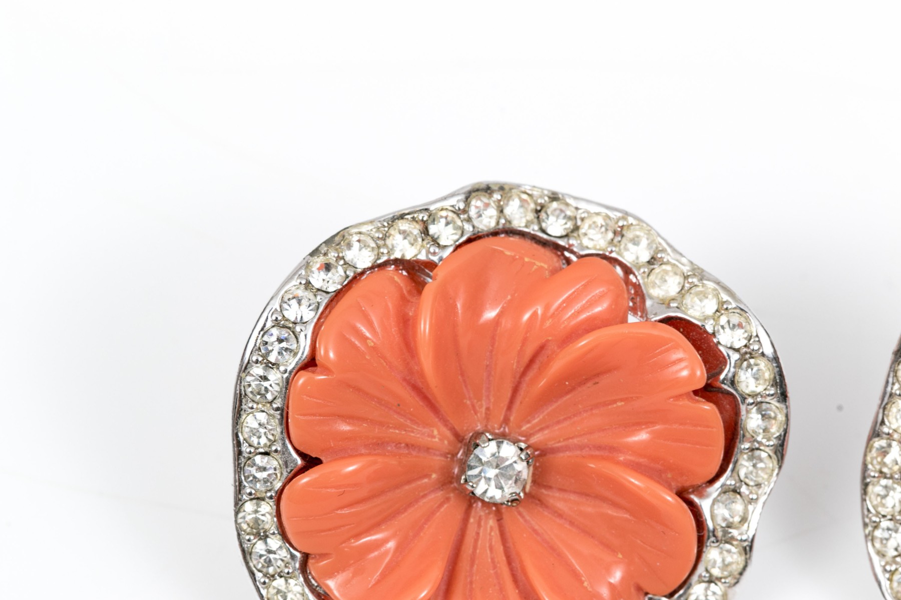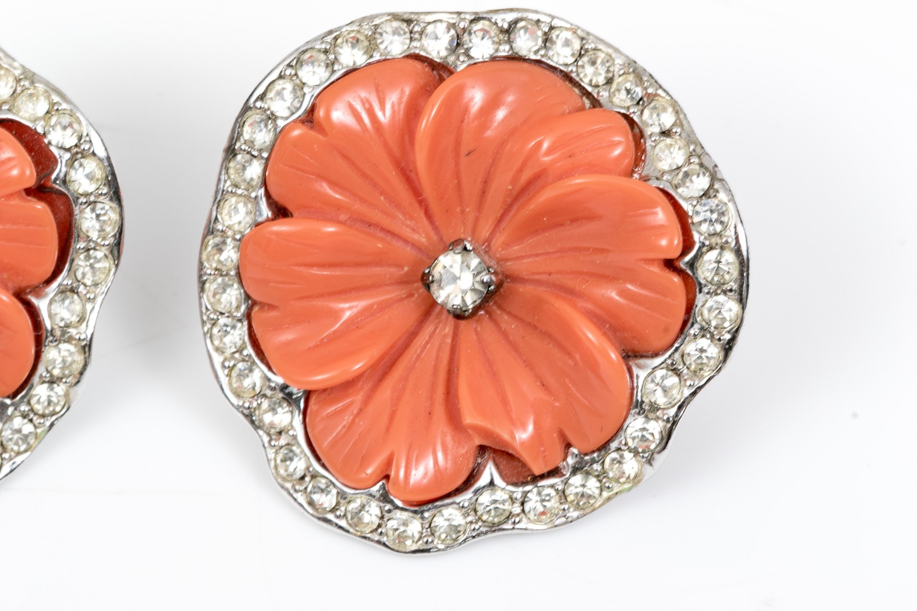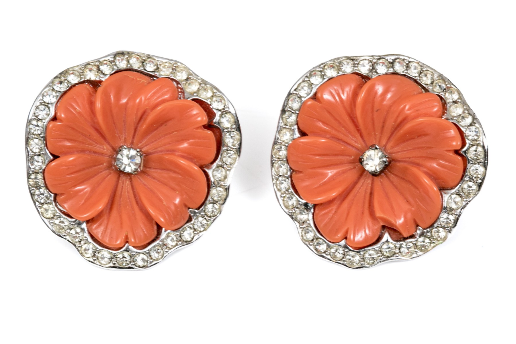 A pair of stylish clip earrings by Kenneth Lane. Light orange flowers sit at the center of a ring of brilliant white cubic zirconia. clip style backings.