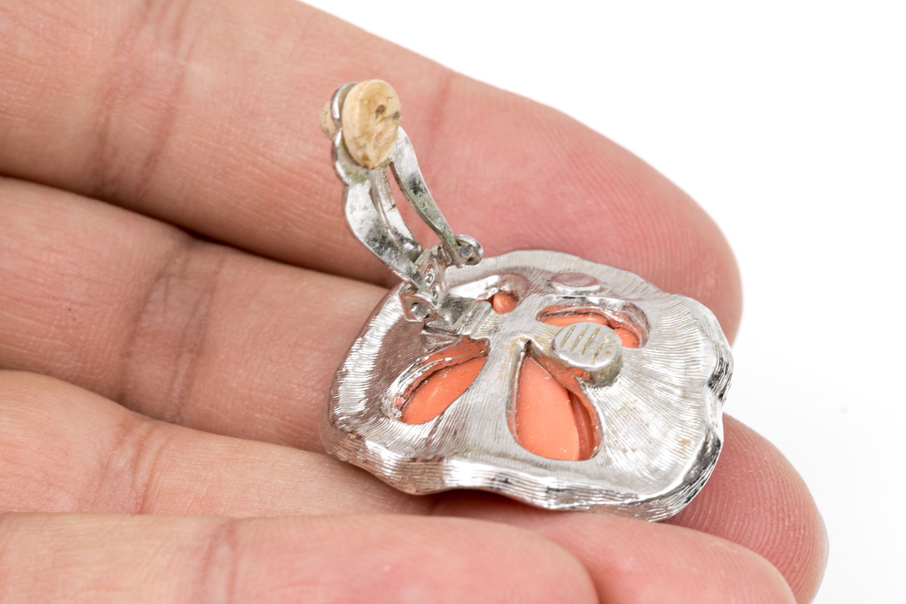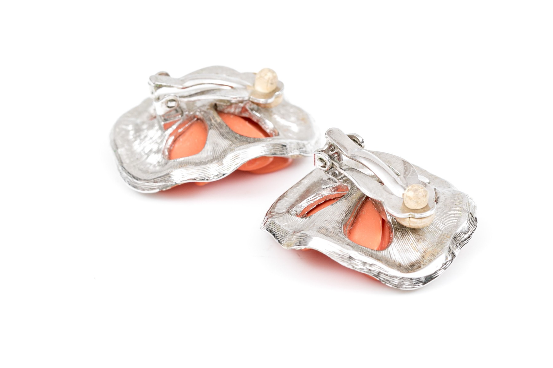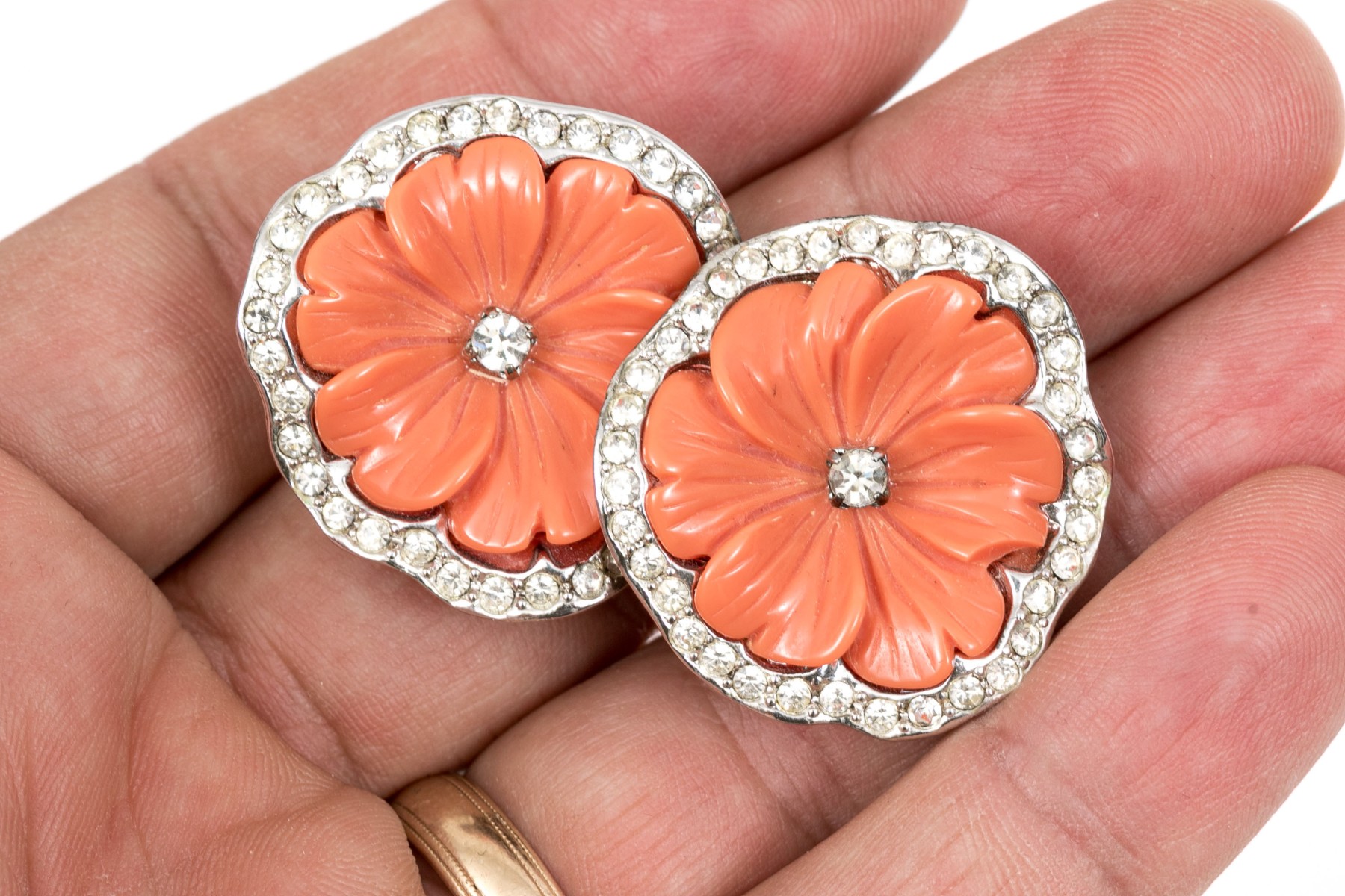 A pair of stylish clip earrings by Kenneth Lane. Light orange flowers sit at the center of a ring of brilliant white cubic zirconia. clip style backings.