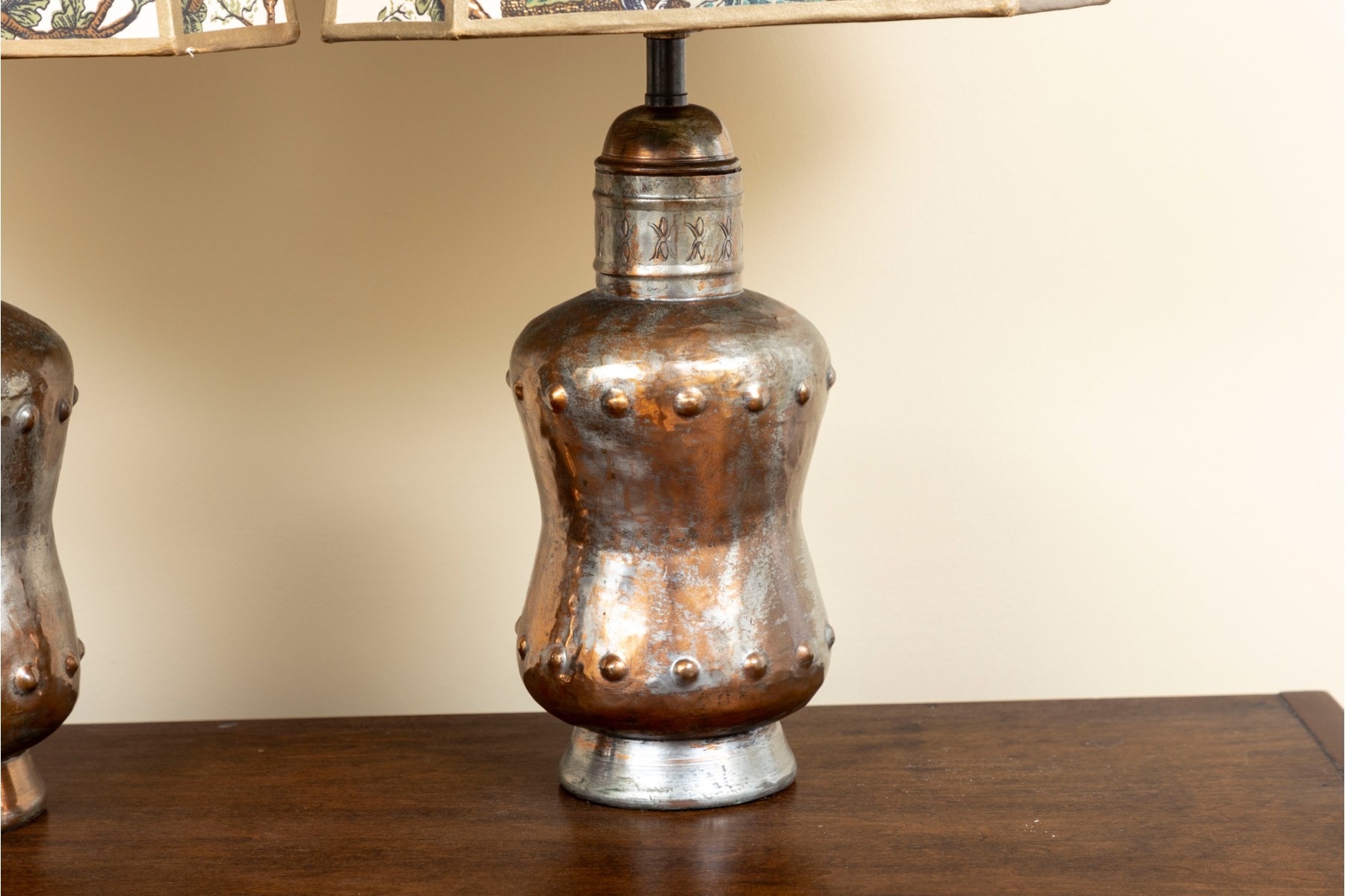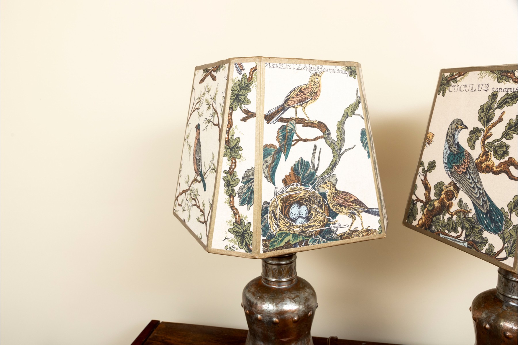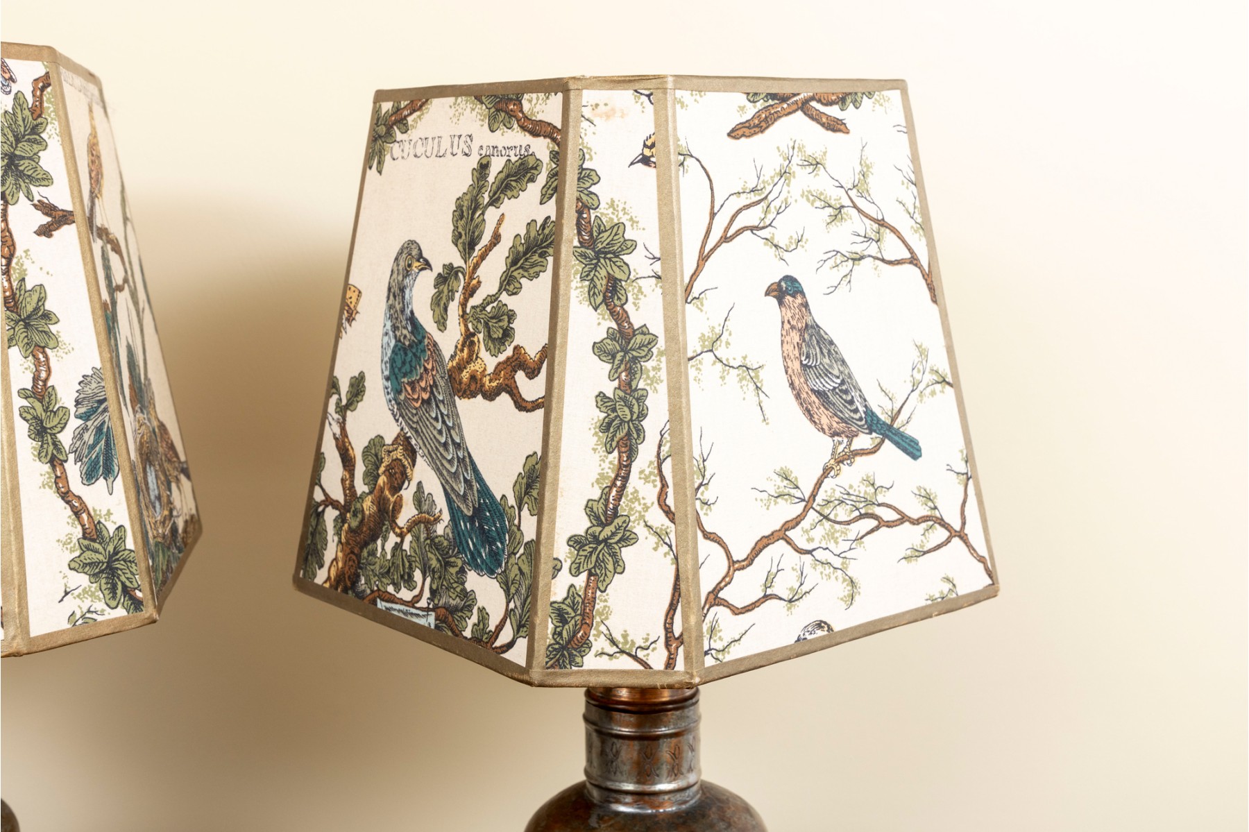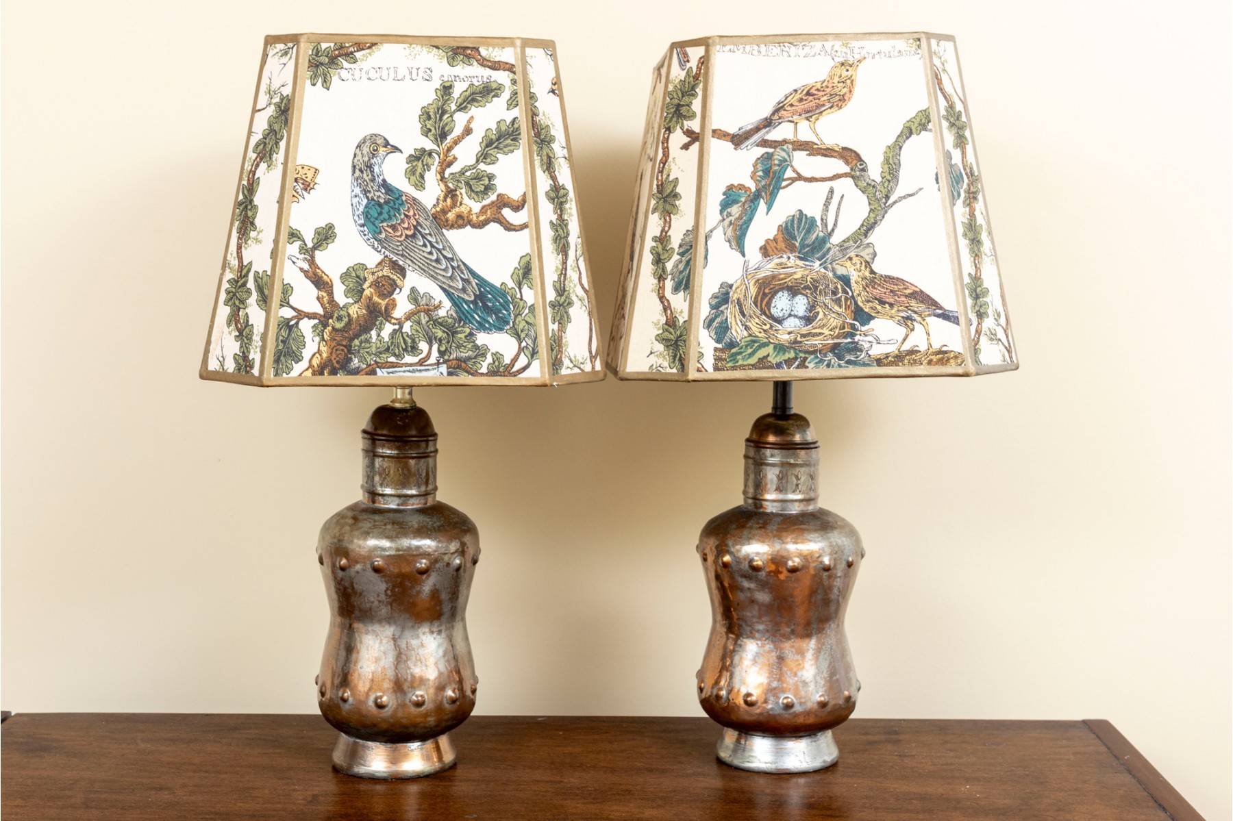A stylish pair of metal table lamps in copper and silver finishes, sporting unique gourd forms with domed necks detailed with etched patterns and bodies accented with rivet-like trims. Both topped with cut-corner square shades displaying wonderful biological illustration styled renderings of birds on branches.
