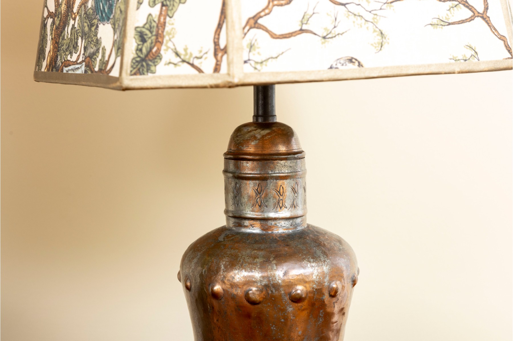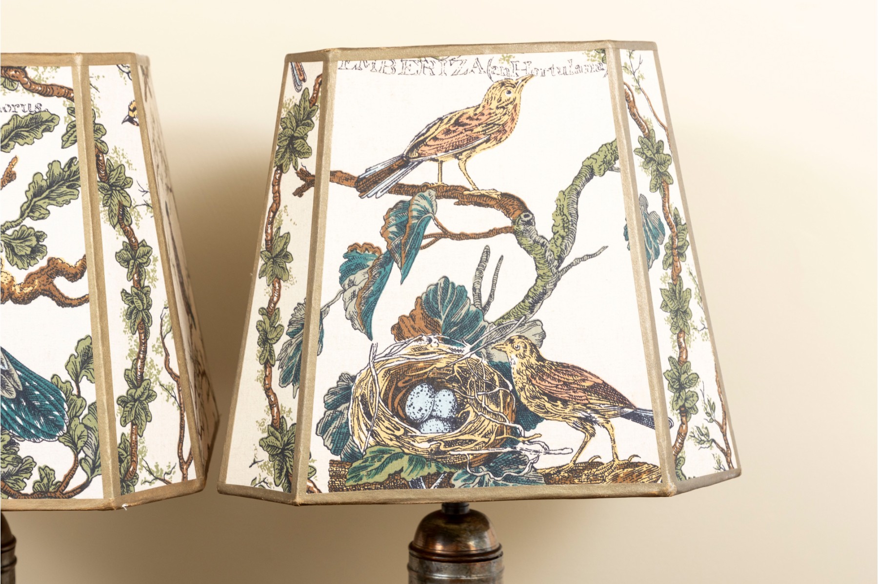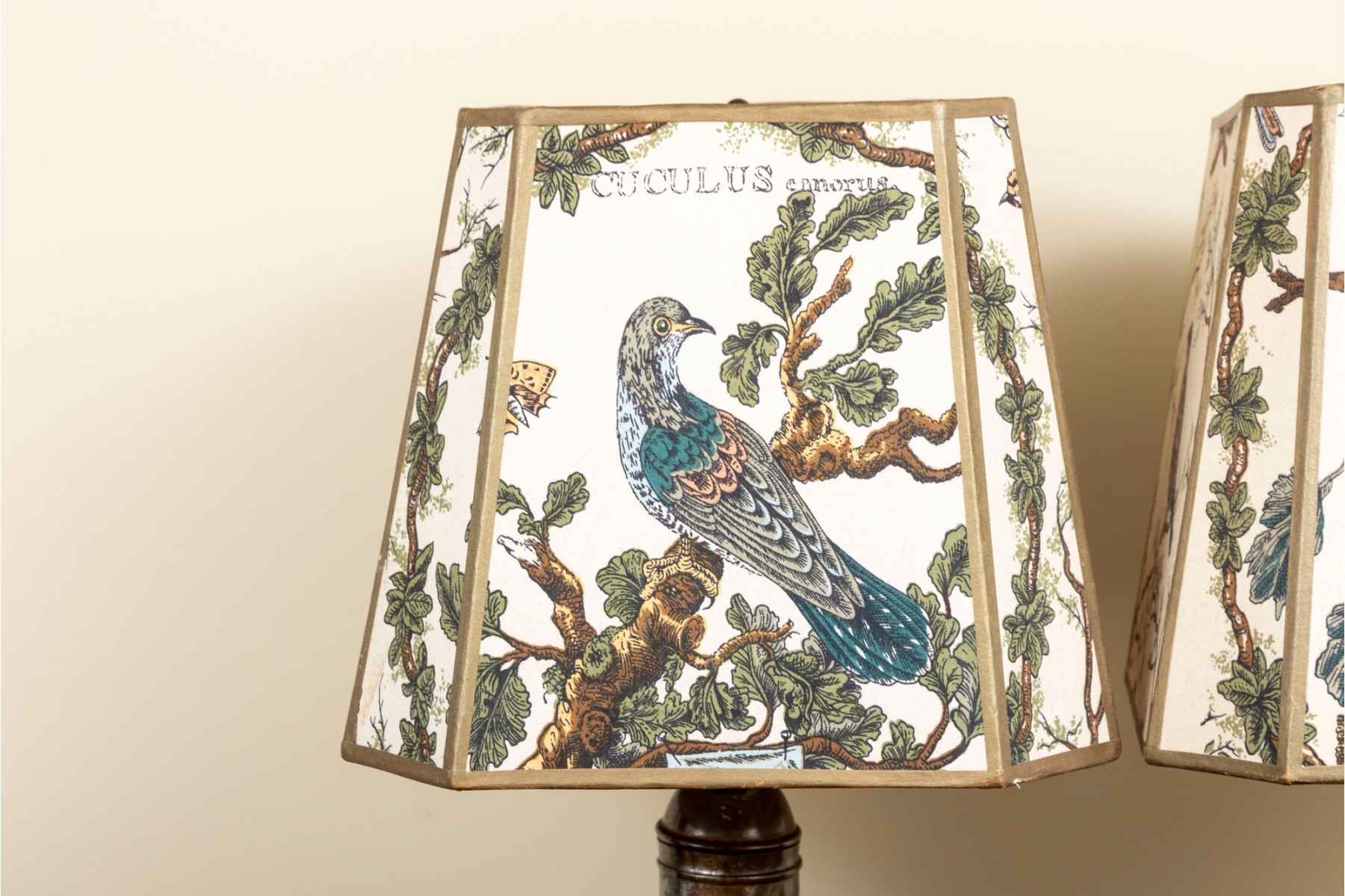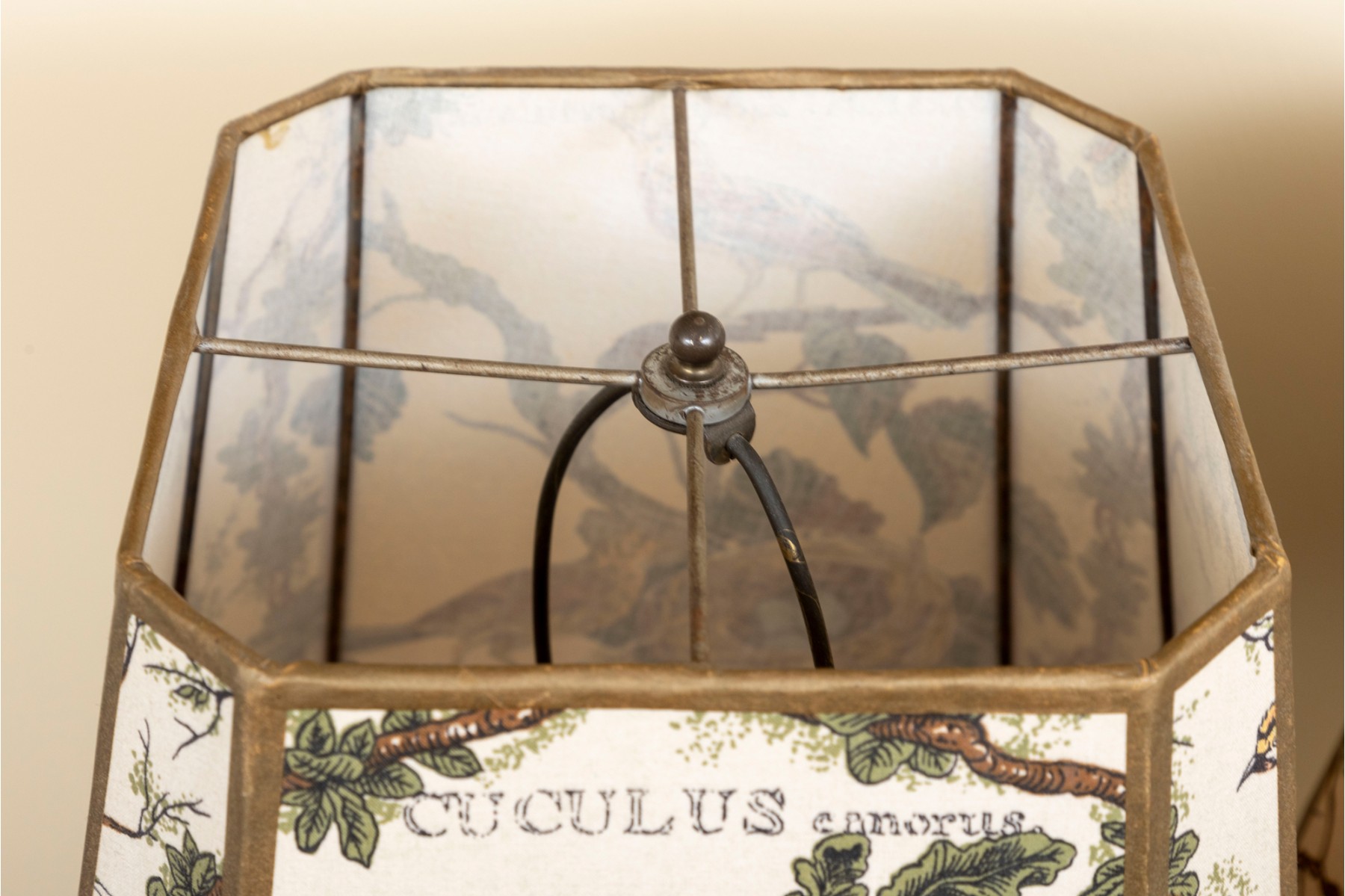 A stylish pair of metal table lamps in copper and silver finishes, sporting unique gourd forms with domed necks detailed with etched patterns and bodies accented with rivet-like trims. Both topped with cut-corner square shades displaying wonderful biological illustration styled renderings of birds on branches.