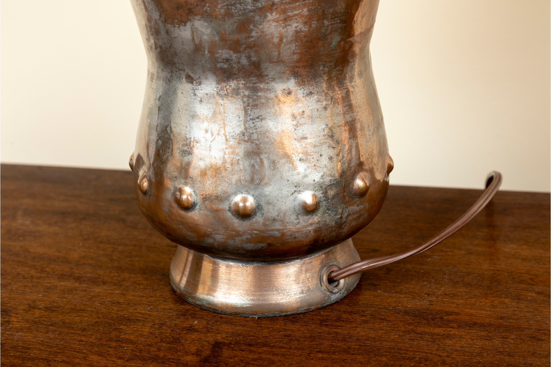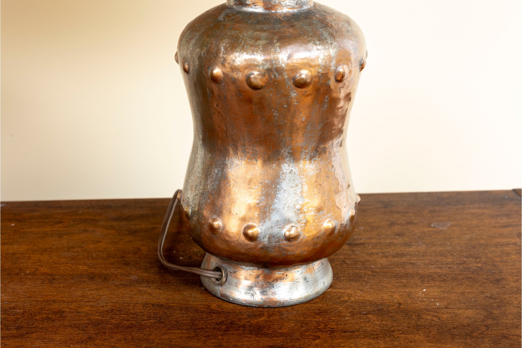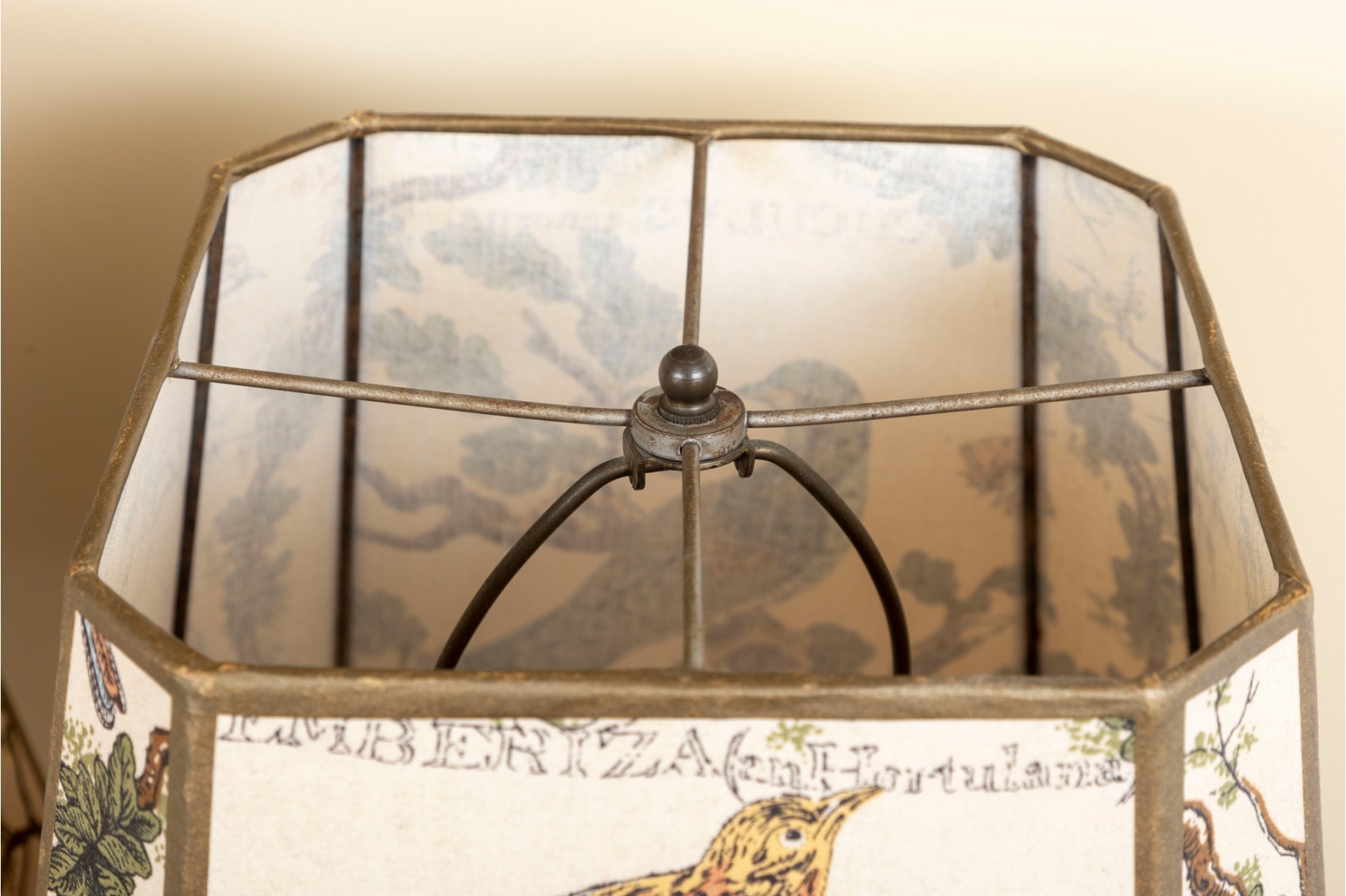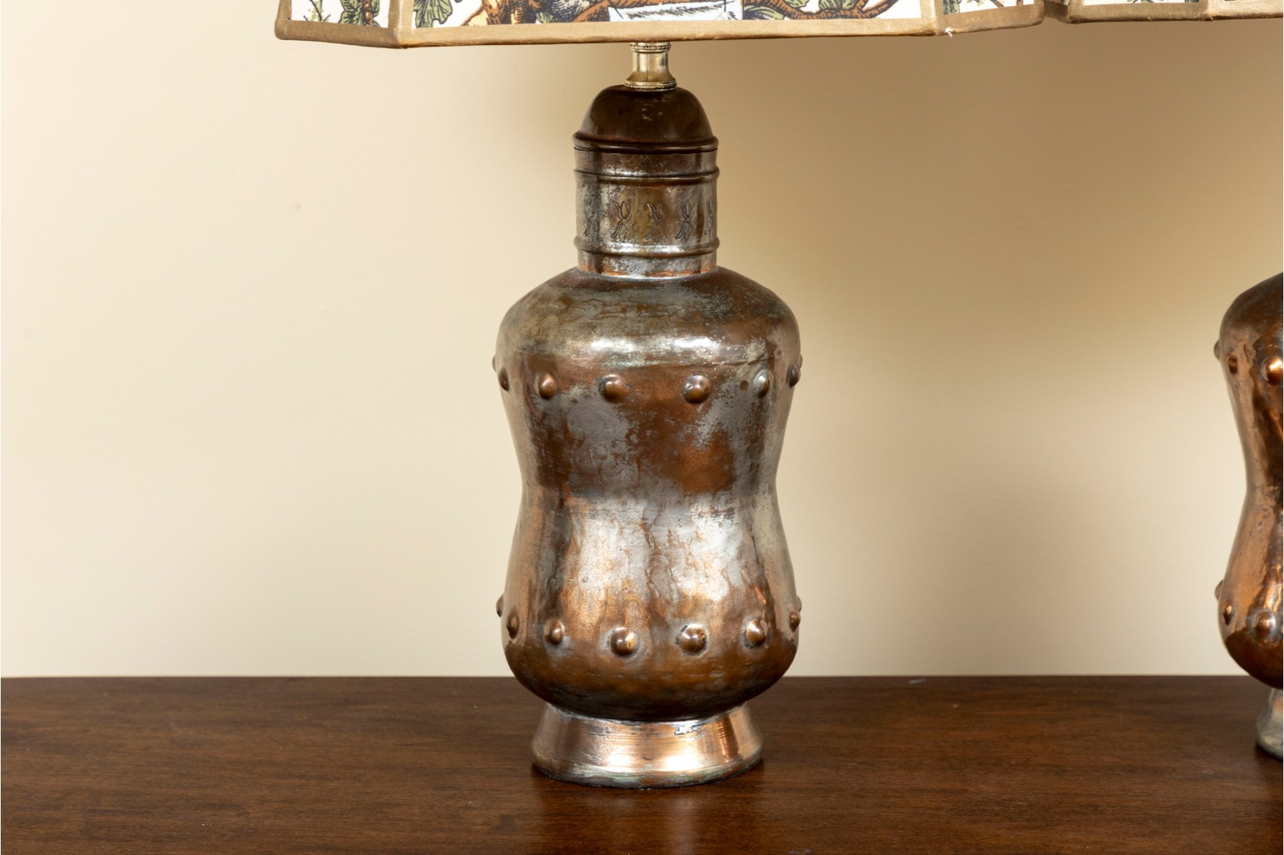 A stylish pair of metal table lamps in copper and silver finishes, sporting unique gourd forms with domed necks detailed with etched patterns and bodies accented with rivet-like trims. Both topped with cut-corner square shades displaying wonderful biological illustration styled renderings of birds on branches.