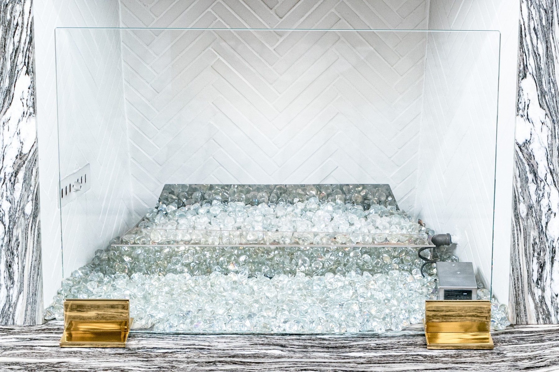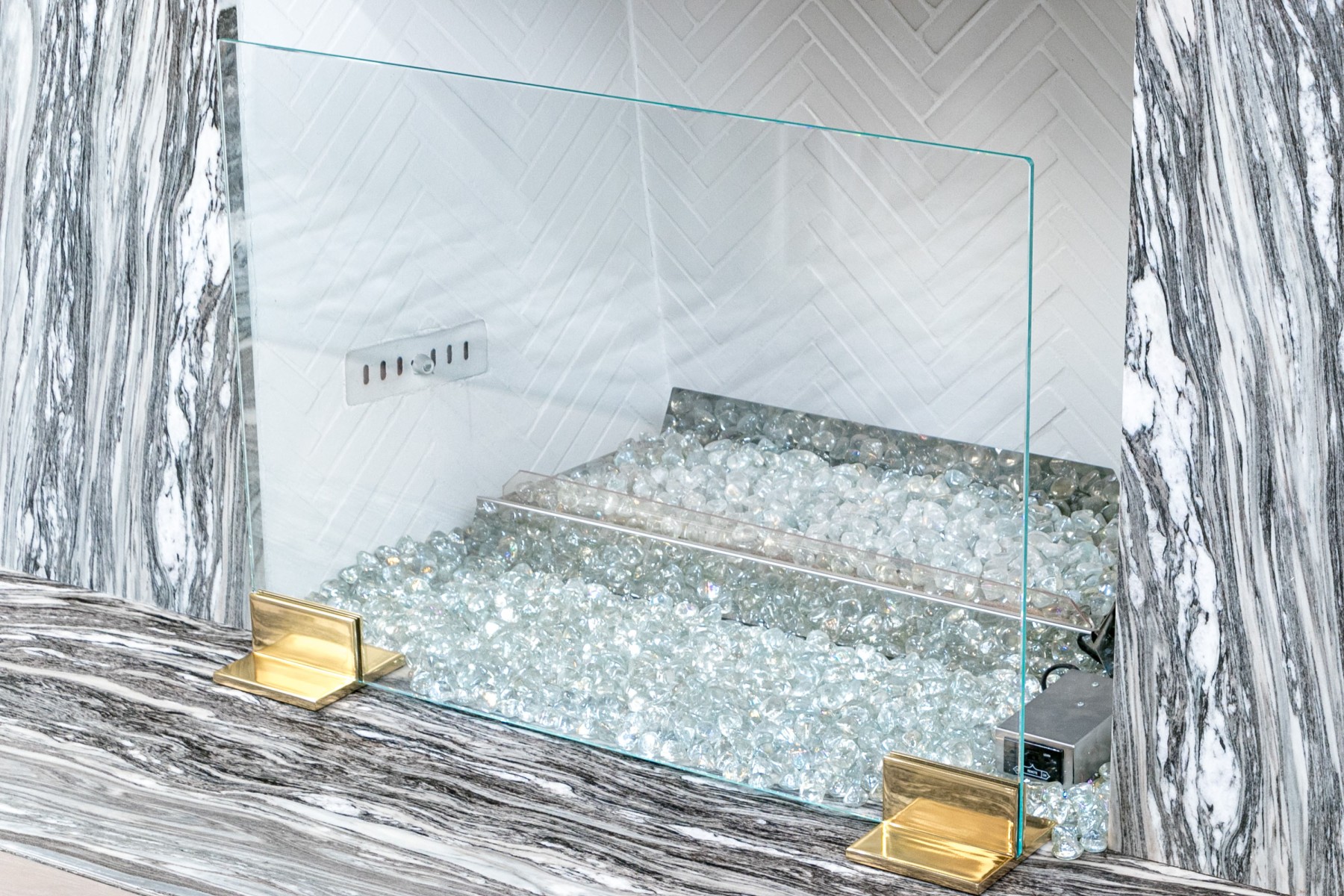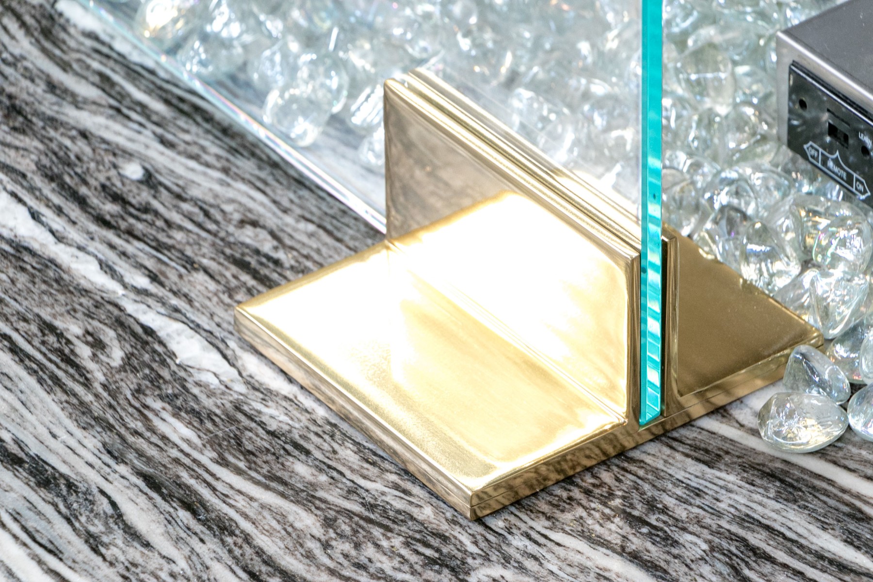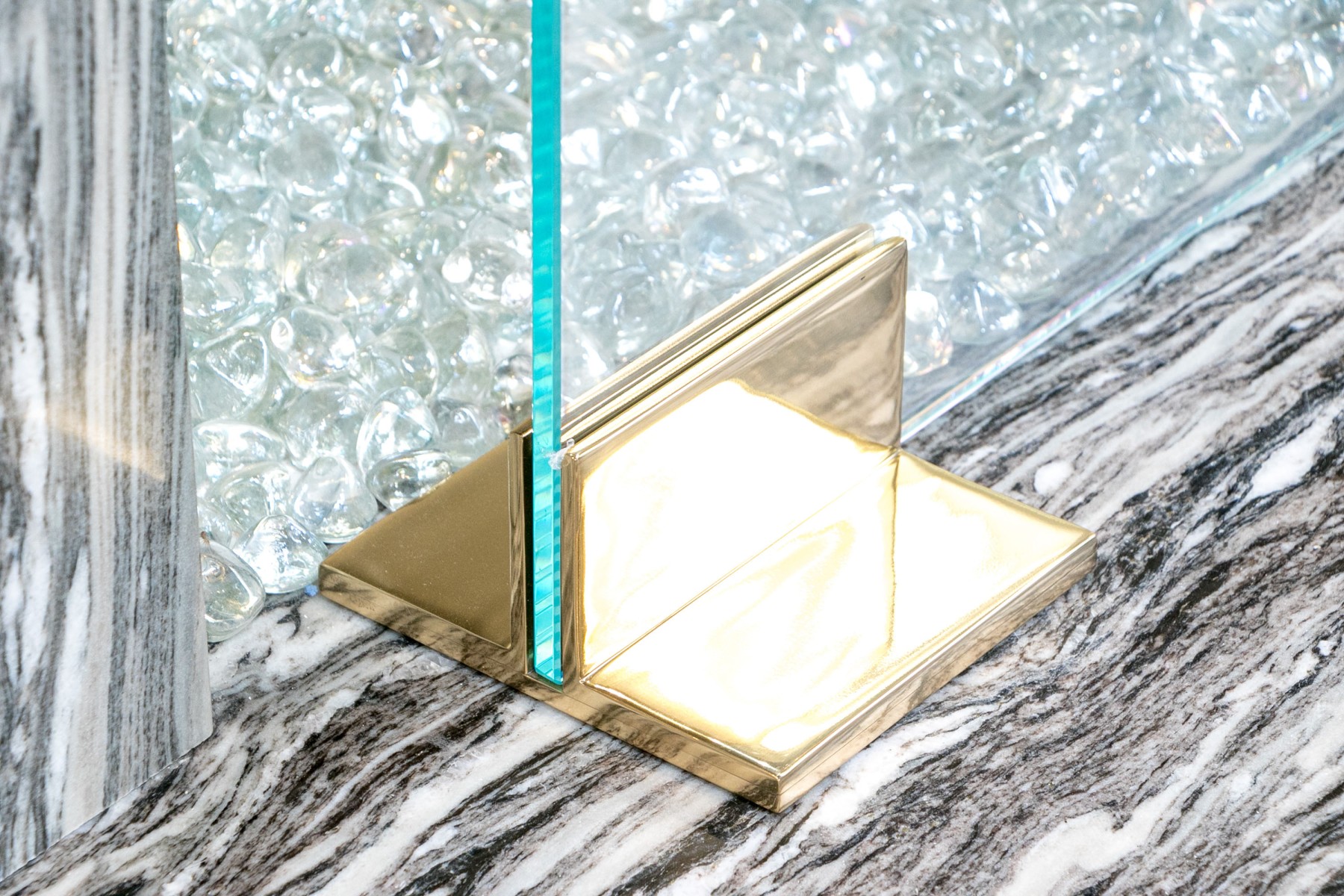 Supported on a pair of brass finished ends, the thick glass panel slots in.