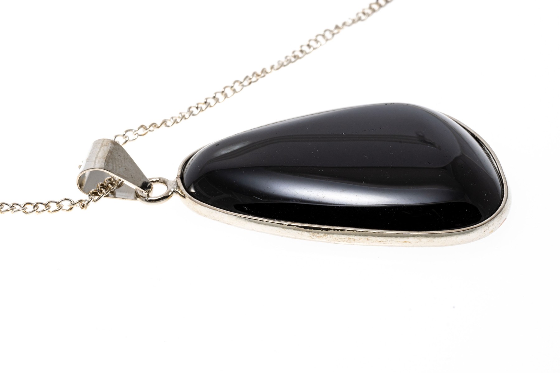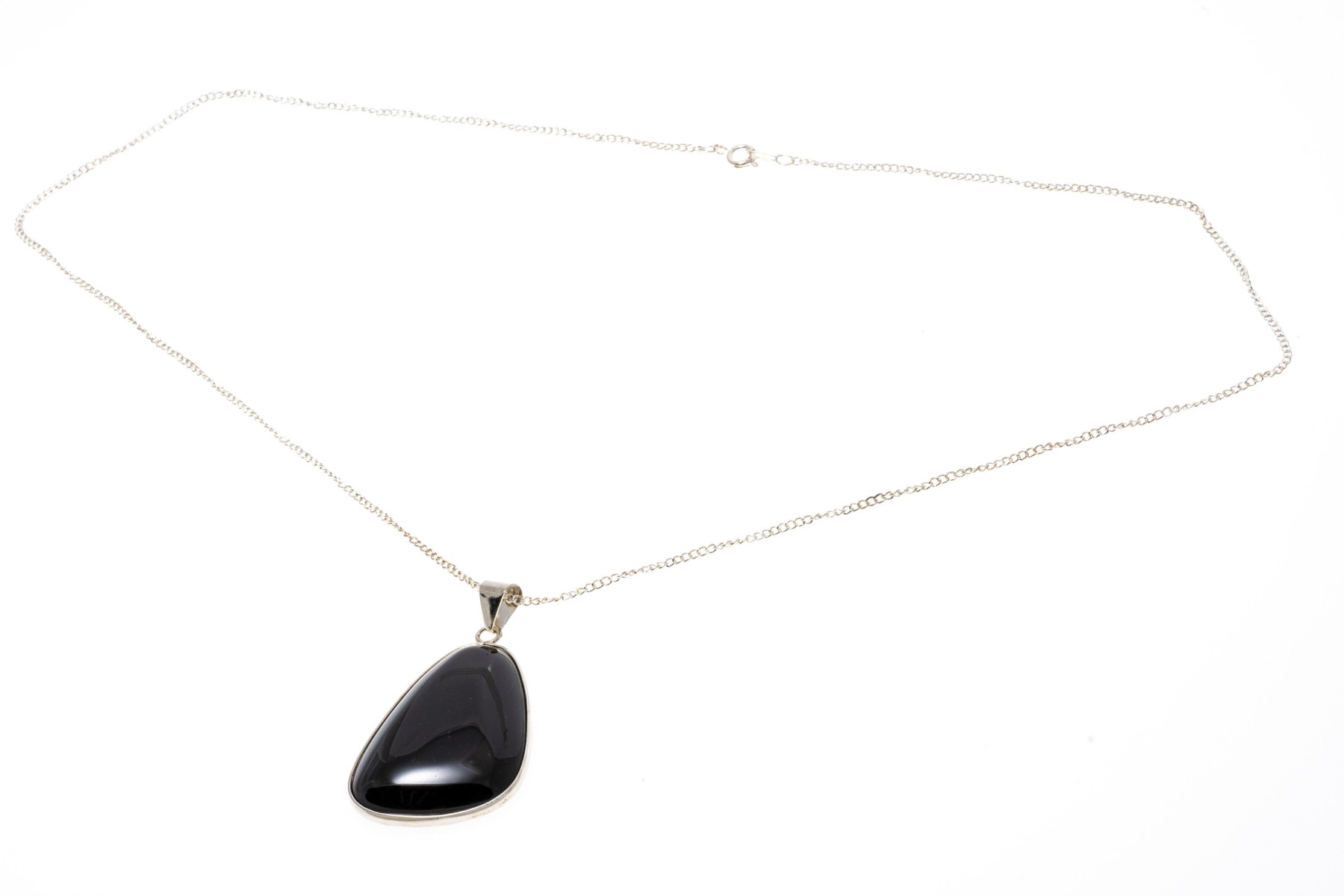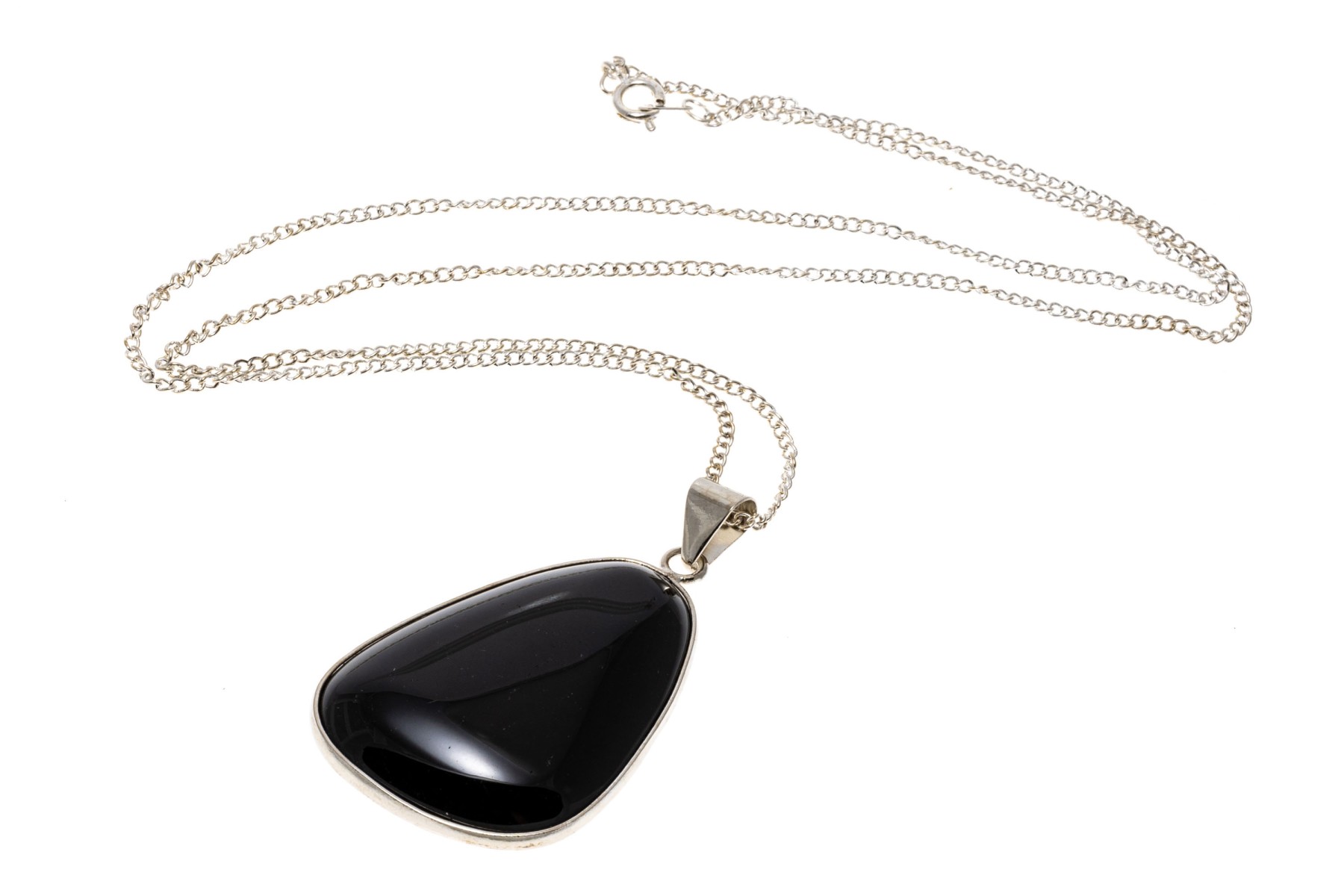 Pendant necklace. The pendant is set with a tunneled and polished black onyx stone. Spring ring clasp.