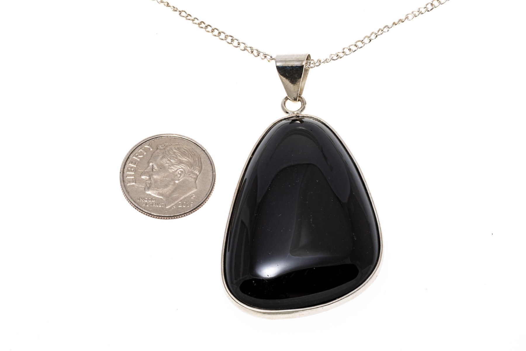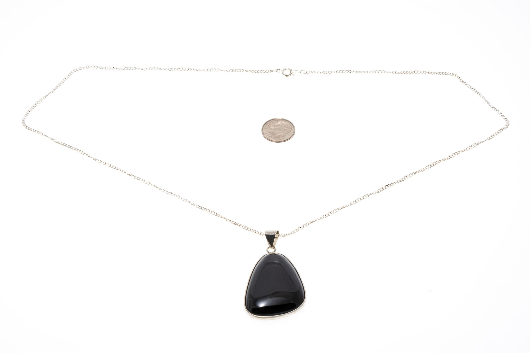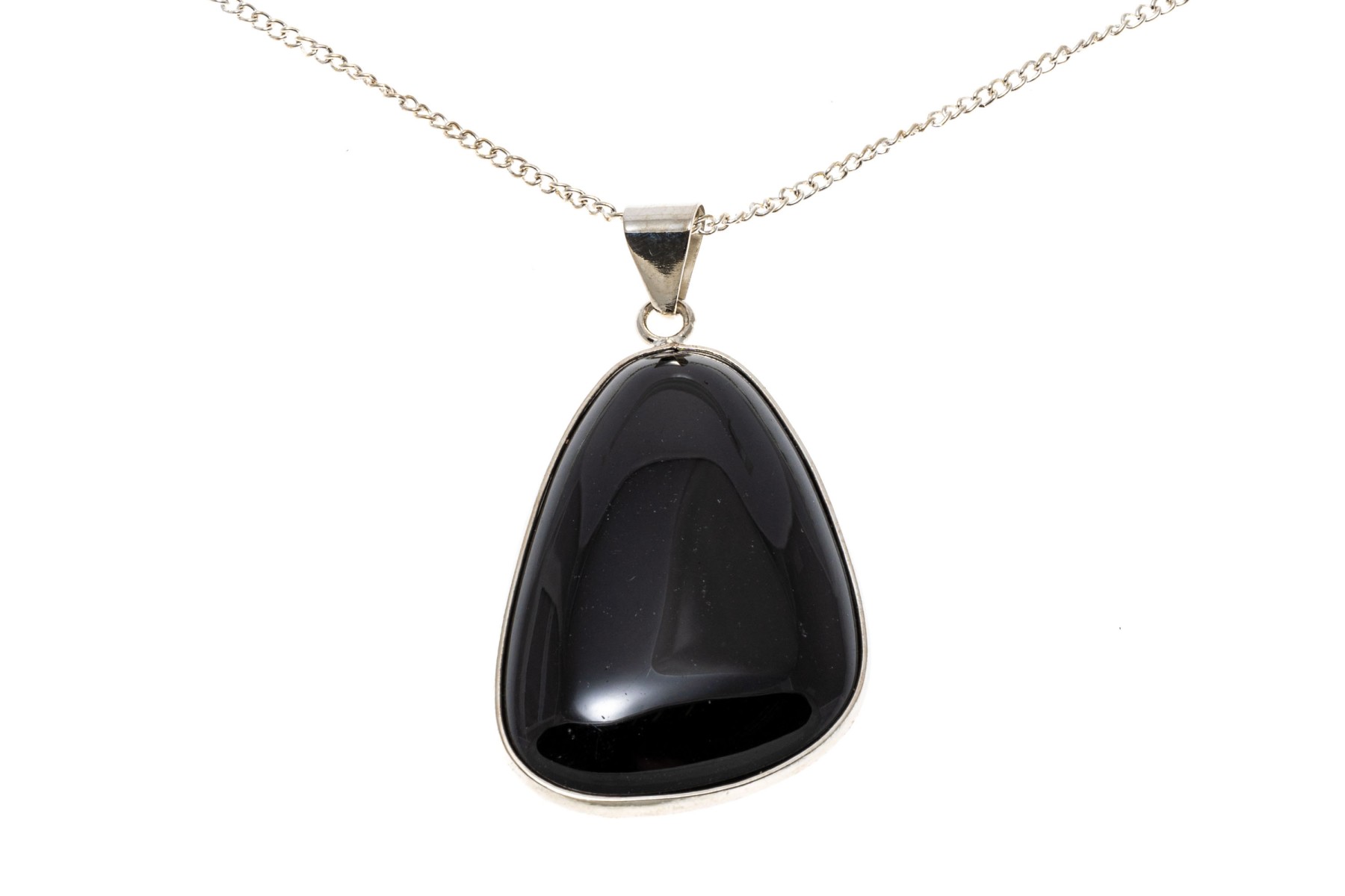 Pendant necklace. The pendant is set with a tunneled and polished black onyx stone. Spring ring clasp.