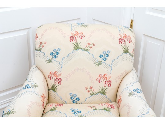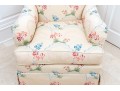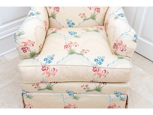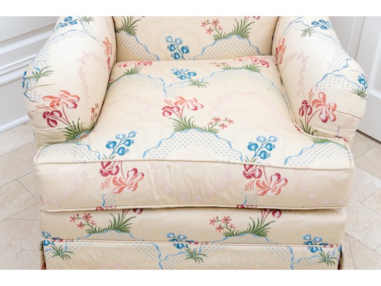 A pair of Ashley Manor club chairs raised on four wooden legs concealed by a skirt. Upholstered in cream with chic florals in vibrant red, orange, and blue.