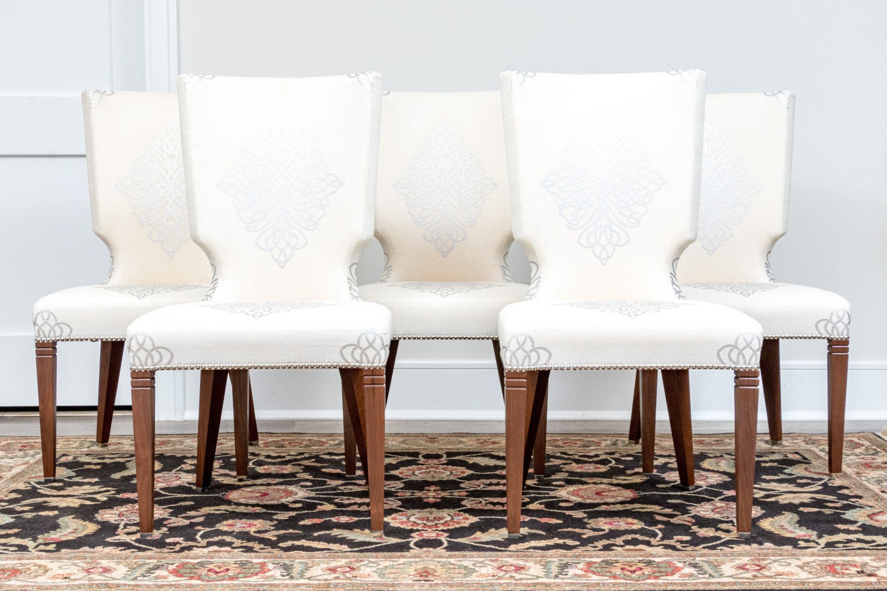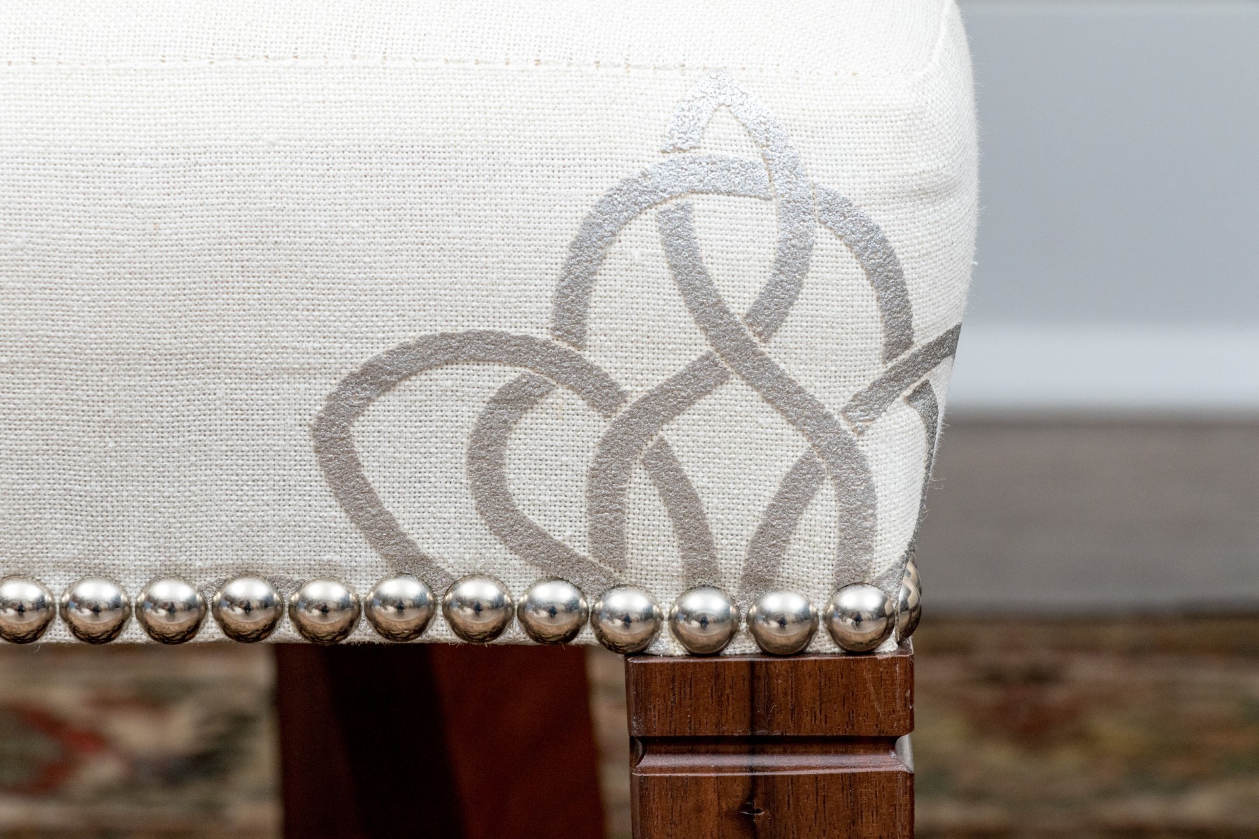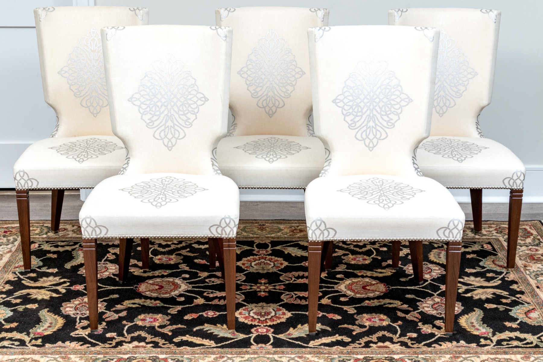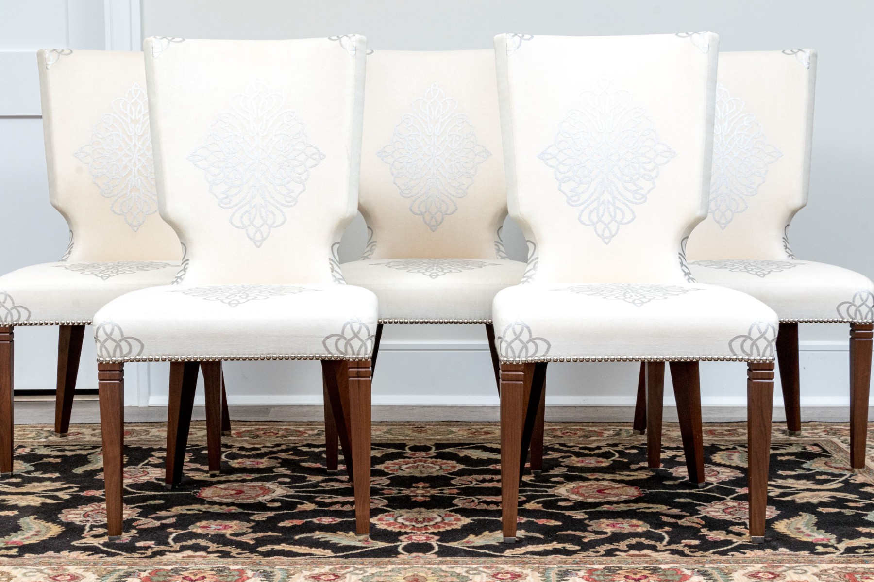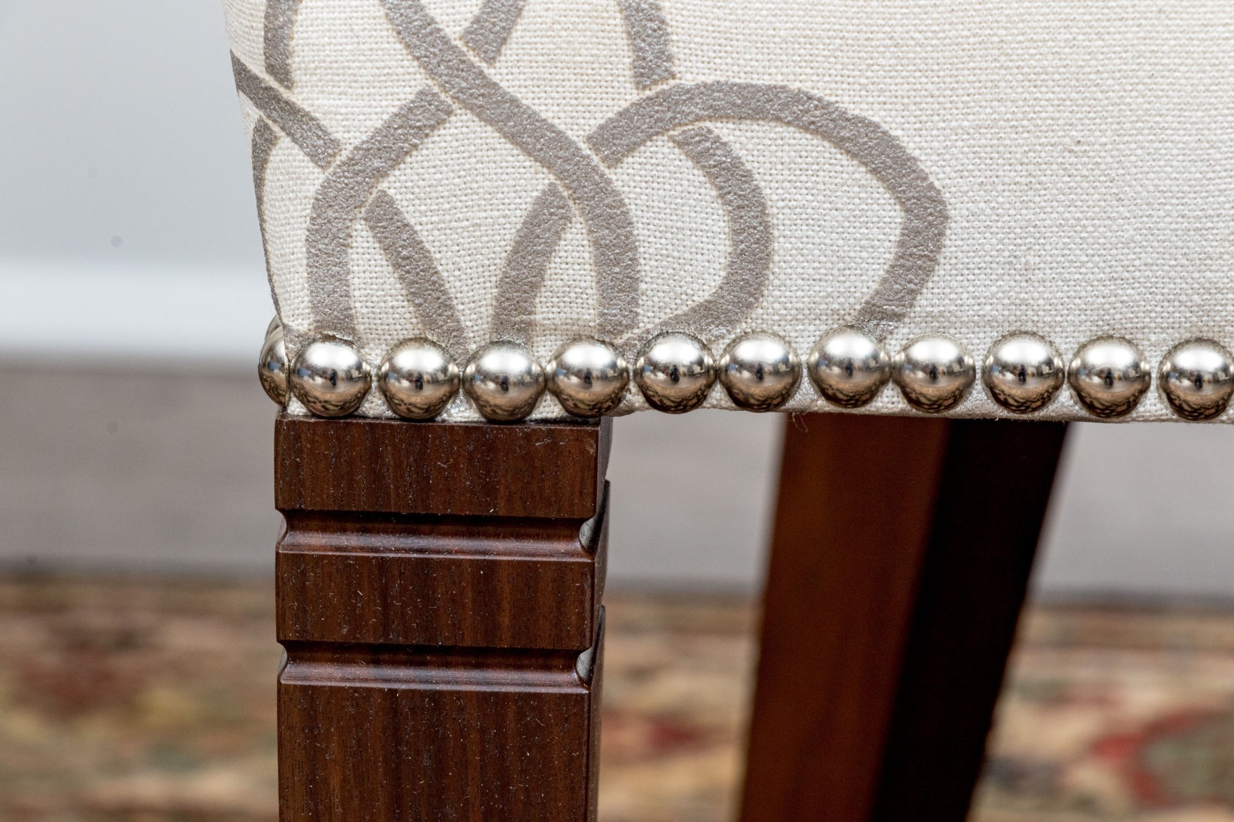 On four squared, tapered wooden legs with handsomely upholstered seats and seat backs affixed with a lovely band of tack nailhead trim. The seat backs are wonderfully shaped as though sculpted and upholstered in warm cream hued fabric further embellished with a silver finished decorative scheme including a medallion to the seats and seat backs.