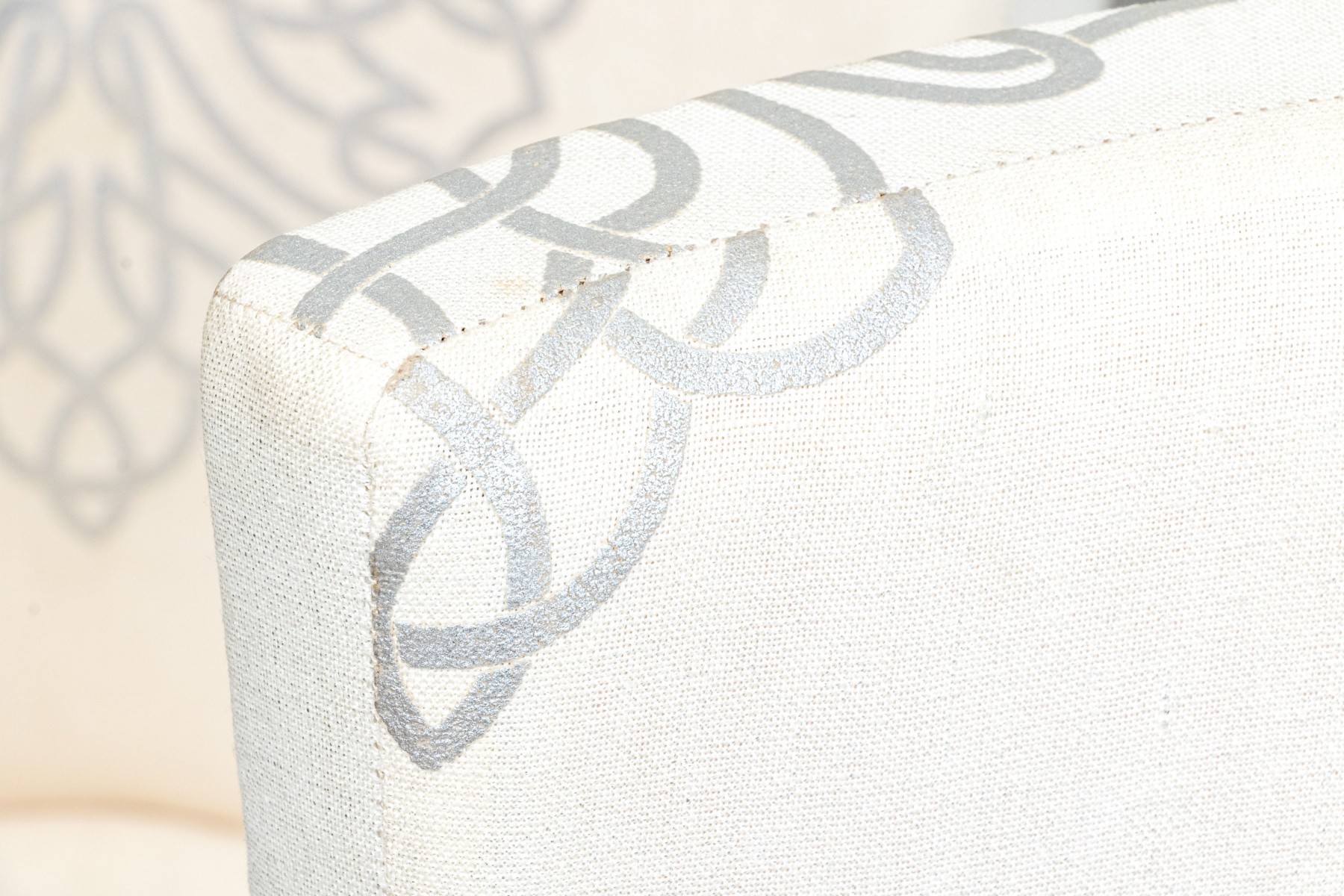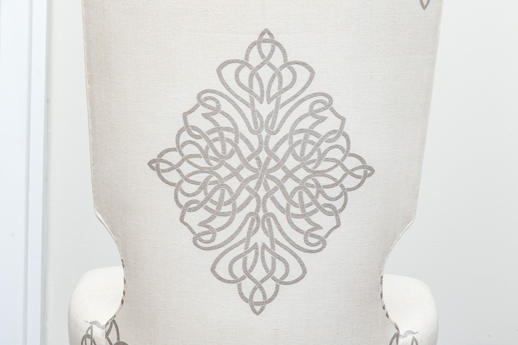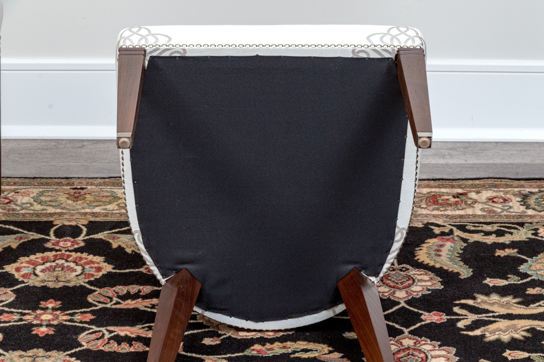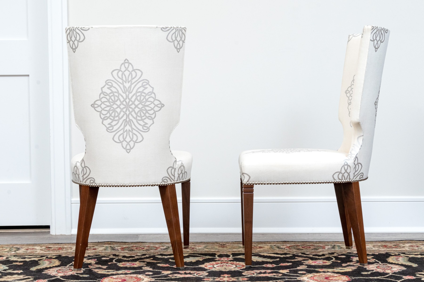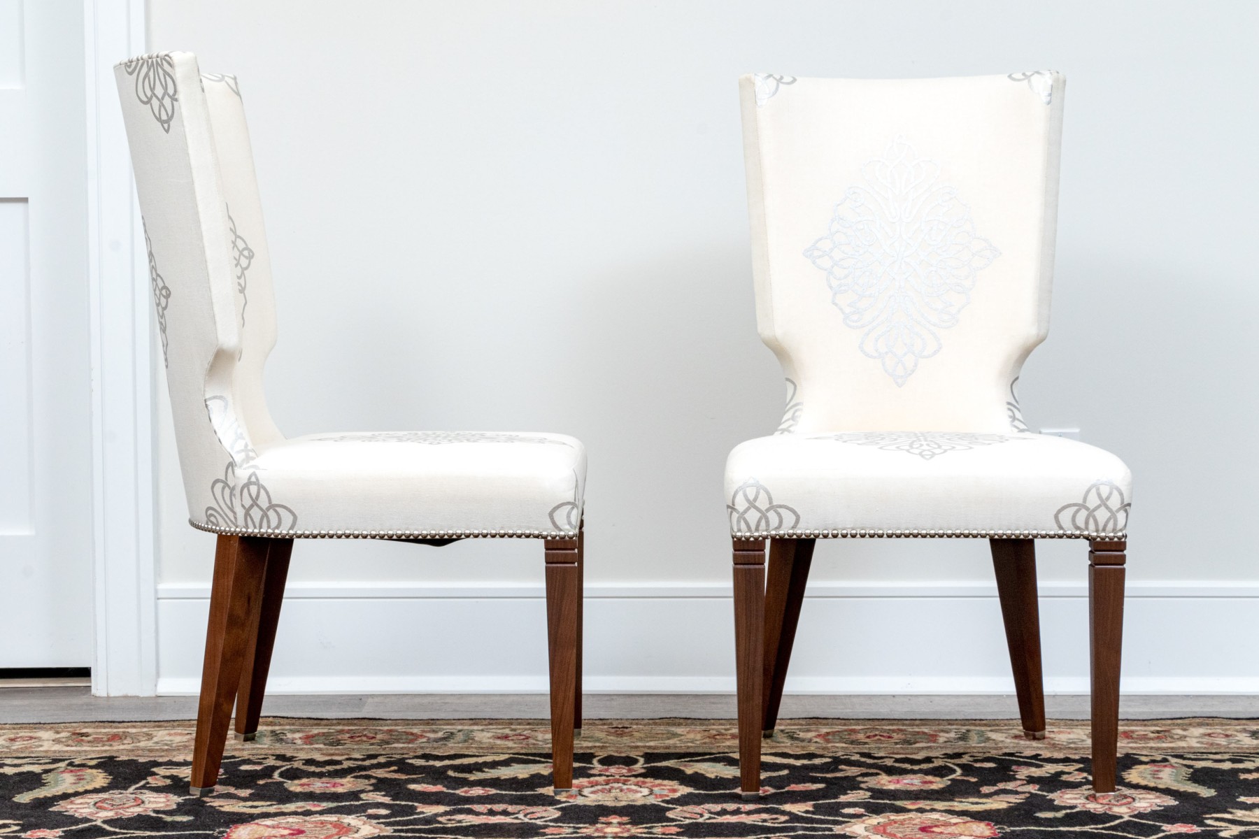 On four squared, tapered wooden legs with handsomely upholstered seats and seat backs affixed with a lovely band of tack nailhead trim. The seat backs are wonderfully shaped as though sculpted and upholstered in warm cream hued fabric further embellished with a silver finished decorative scheme including a medallion to the seats and seat backs.