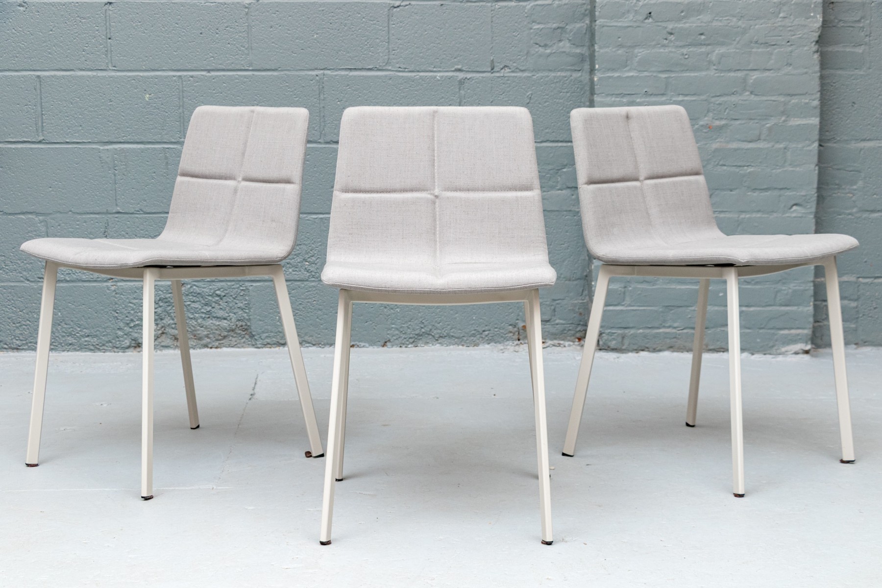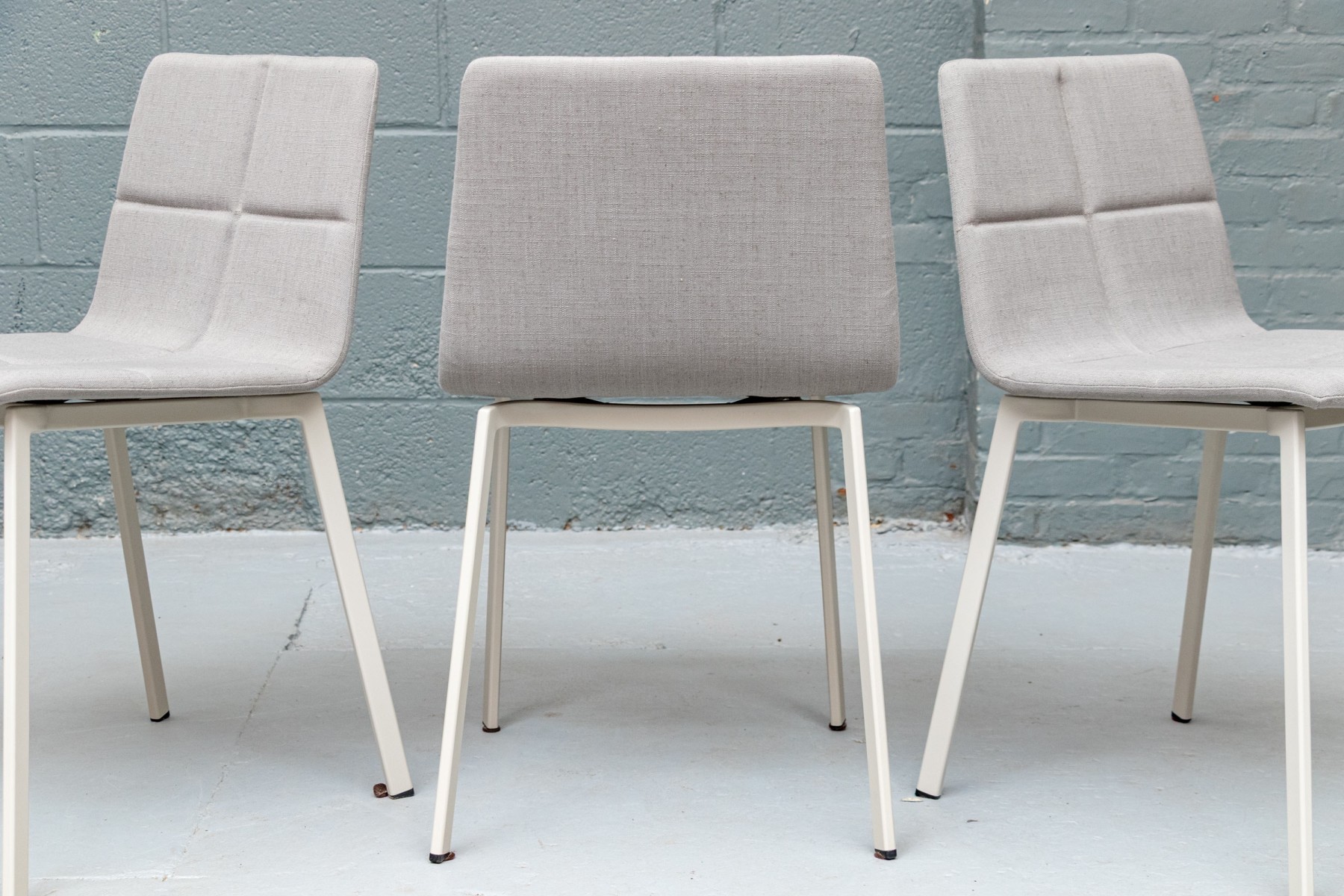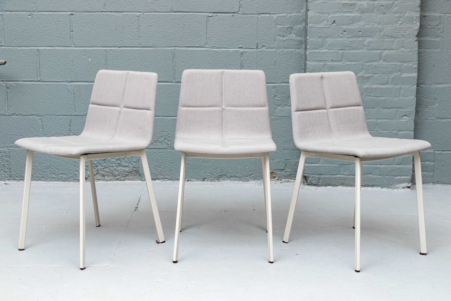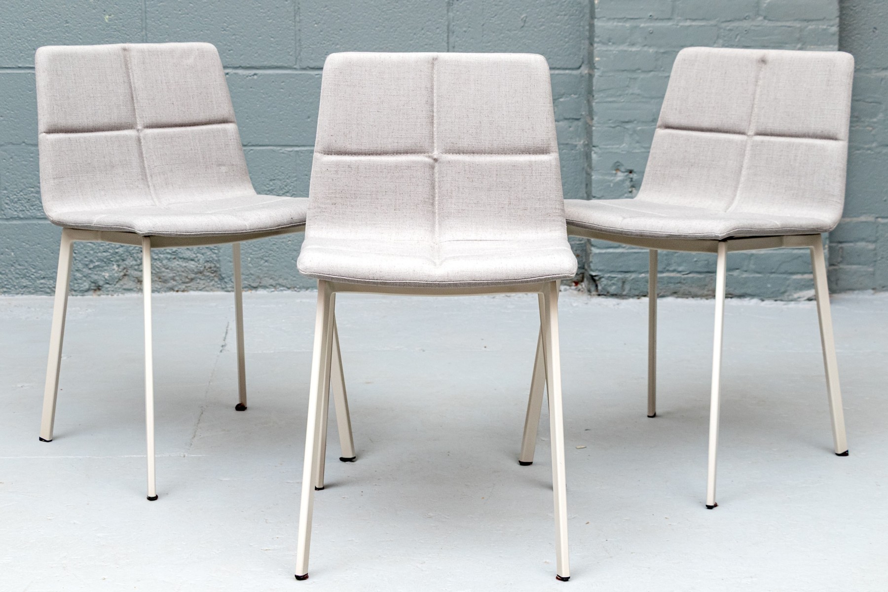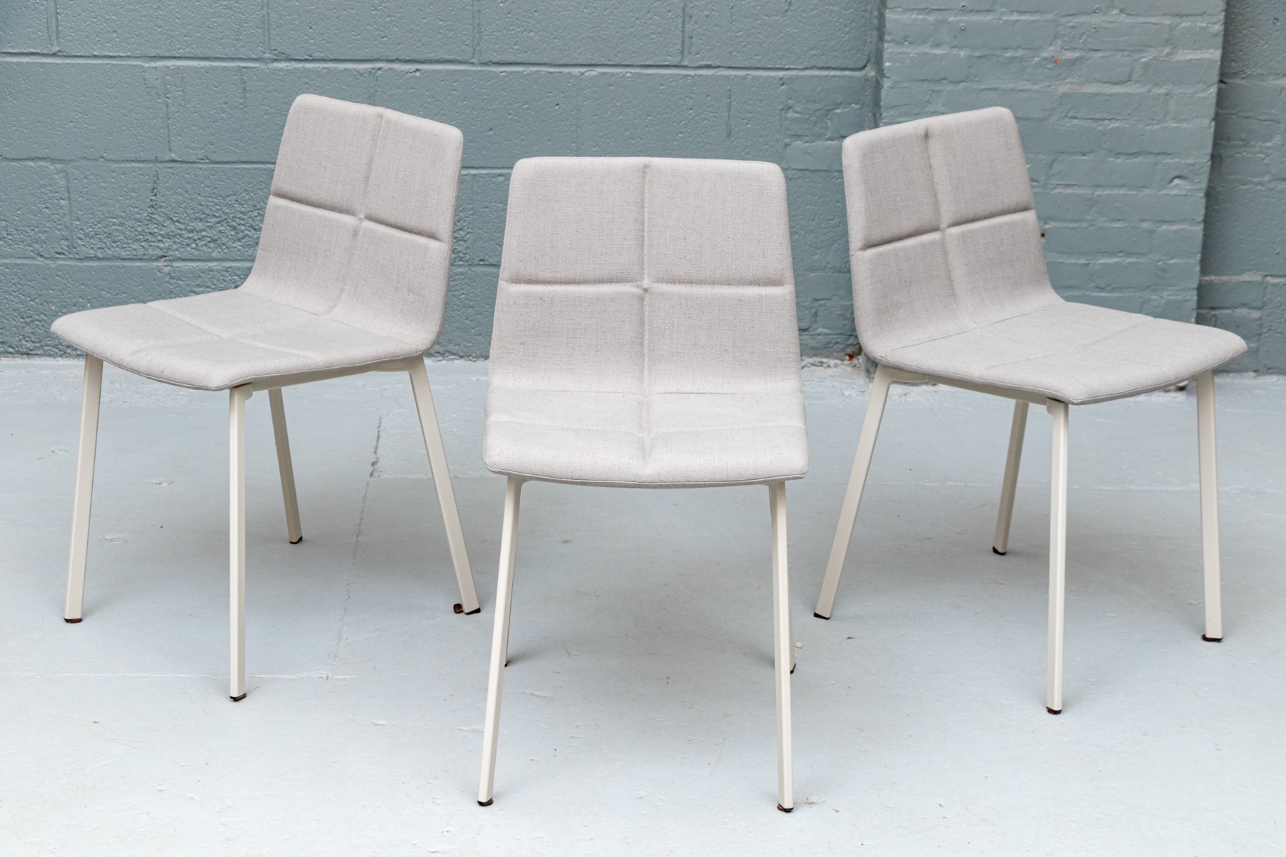 Each on four squared legs with grey upholstered seat and seat backs with channel sewn decorative motif to the grey upholstery.
