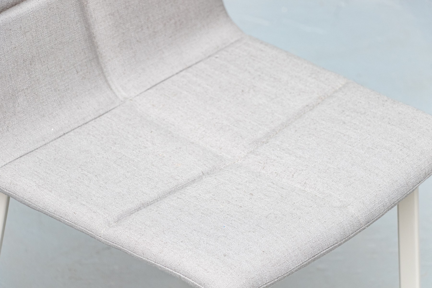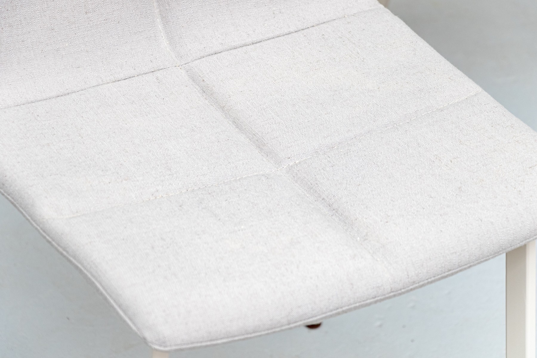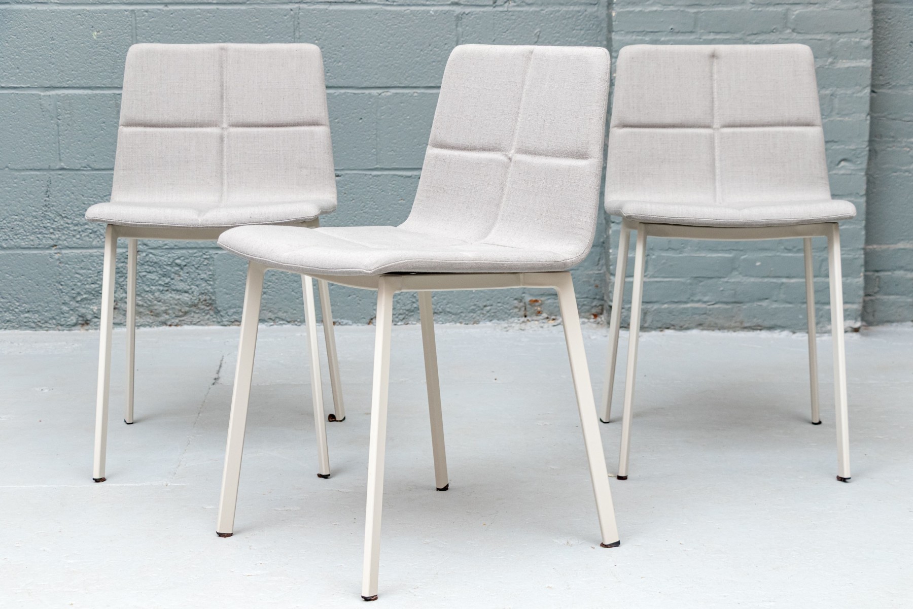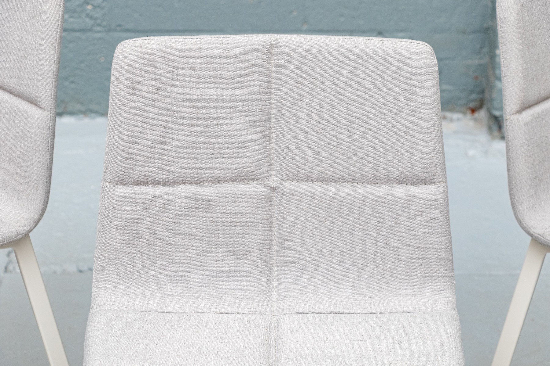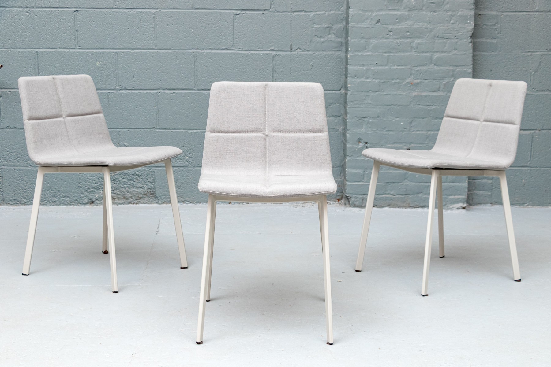 Each on four squared legs with grey upholstered seat and seat backs with channel sewn decorative motif to the grey upholstery.